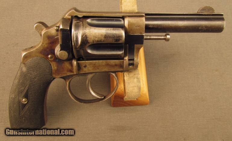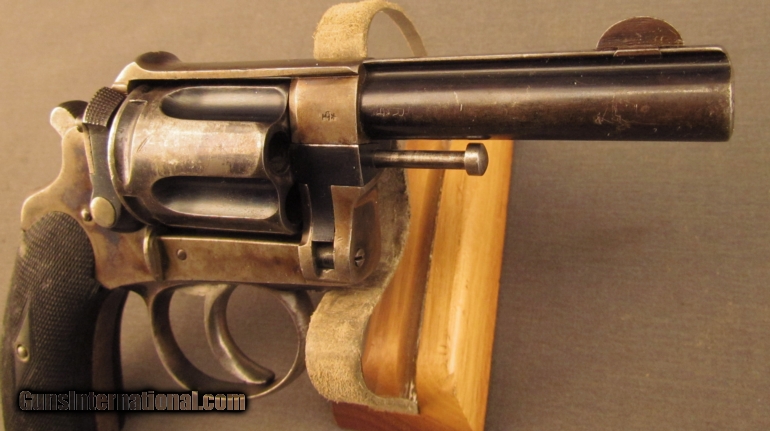 Description: Serial #16033, .32 CF, 3 1/4” barrel with a fine, bright bore that has some minor freckling within the grooves. This is an unusual revolver that has “(crown)/E/LG” Liege proofs and a very tiny “LD/BTE” maker's mark on the left side of the frame at the breech. The frame retains about 80-85% of the original color case-hardening, while the barrel and cylinder have a commensurate amount of the original bright blue remaining. Silvered gray areas are present at the muzzle, along the edges of the cylinder flutes, and high areas of the frame as well. The trigger guard has flaked to a freckled plum-brown patina in spots, and the trigger and hammer have developed a dull gray patina. The loading gate on the right side is actually a cylinder latch and rotates to allow the cylinder to swing out to the right, and the hammer is attached to a very long, hinged firing pin. The left side of the barrel is engraved with a police department marking: “MDP 16,033”. The significance of this marking is unknown, but further research could prove fruitful. The checkered black horn grips are also in fine-excellent condition with very little wear and only a few minor handling marks. These Oury Systeme revolvers were made by a variety of Belgian maker's (including Auguste Francotte, Etablissements Lebeaux, and Manufacture Liegoise d'Armes a Feu), and were marketed under a variety of brands including: “Bogatyr”, “Puppy”, and “French Officer's Model”. This example is in excellent overall condition and would make a splendid addition to any collection. FFL or C&R SOLD Curio/Relic: Yes Manufacturer: Belgian Model: Nagant Serial Number: 16033 Caliber Info: .32 CF Gauge Info: .32 CF |