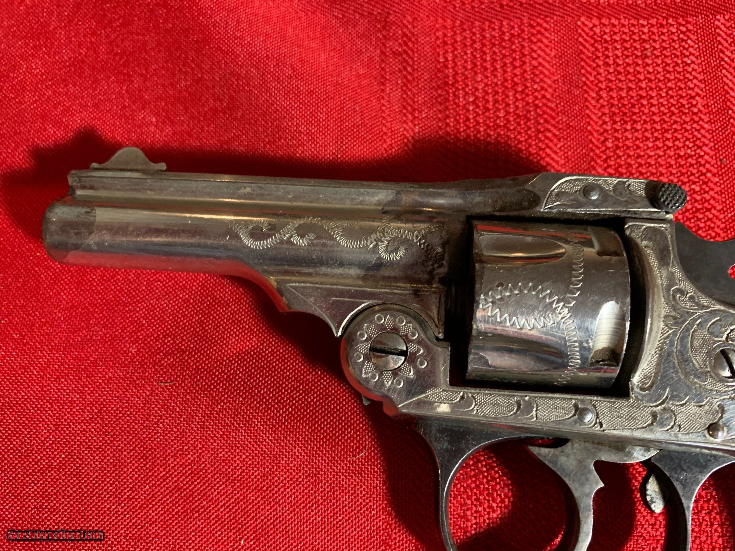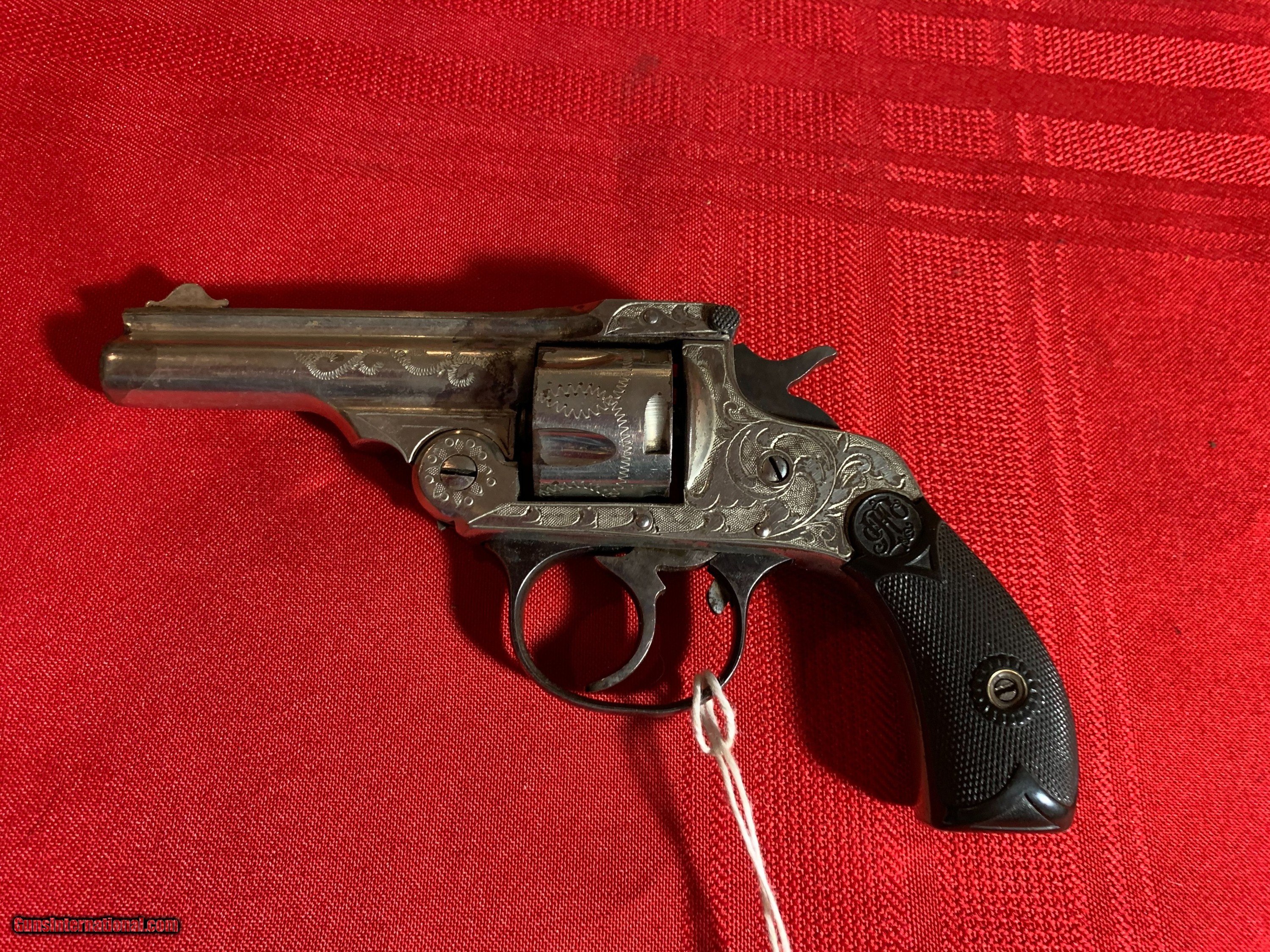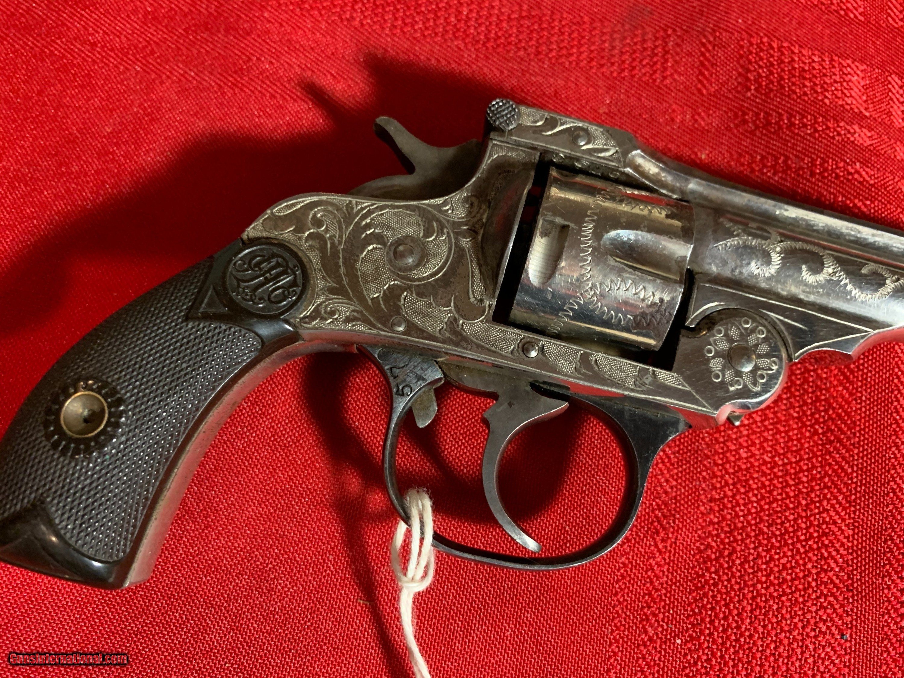 Description: 32 S&W Revolver. Nice nickel plating and engraving. Perfect grips. 3" barrel. Good mechanics. 5 shot. SOLD Curio/Relic: Yes Handgun Caliber: .32 S&W |