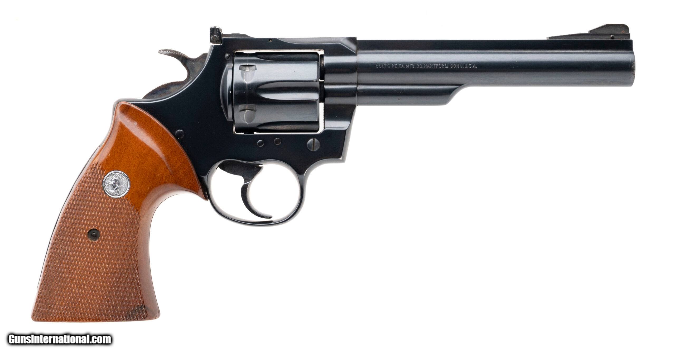 Description: "SN: 58484J made in 1975. Large frame Colt 6 shot double action revolver with a 6" barrel, adjustable rear sight, blued finish and original checkered walnut medallion grips with only some light handling marks in very good overall condition. Price: $995.00 Contact Seller |