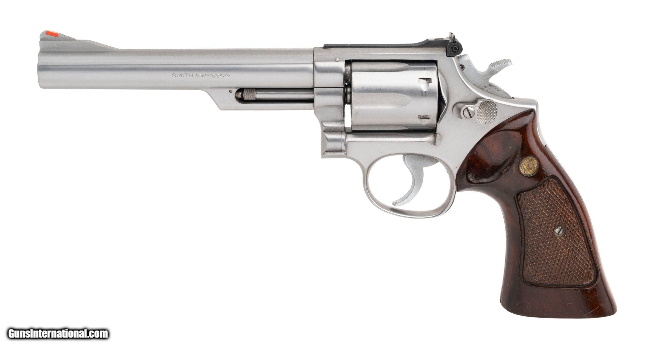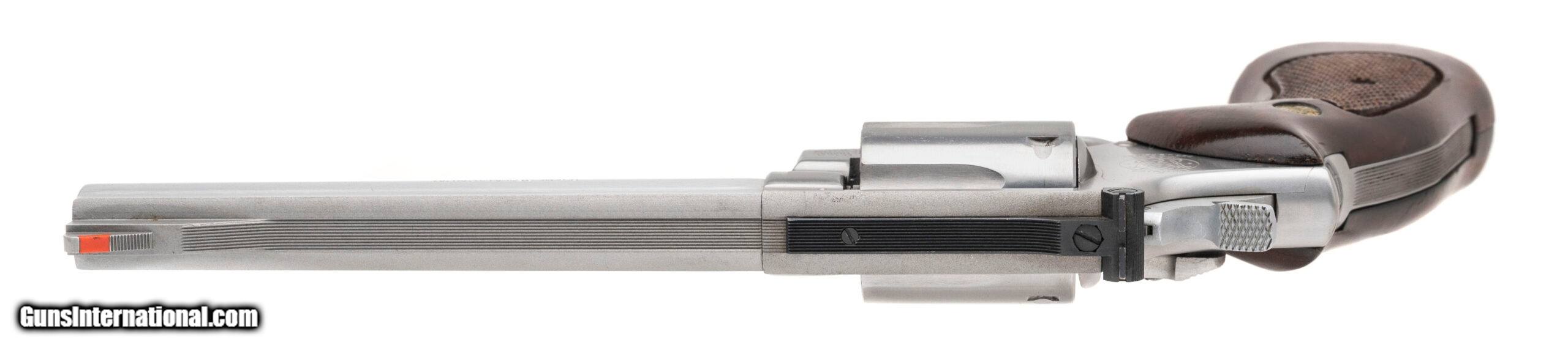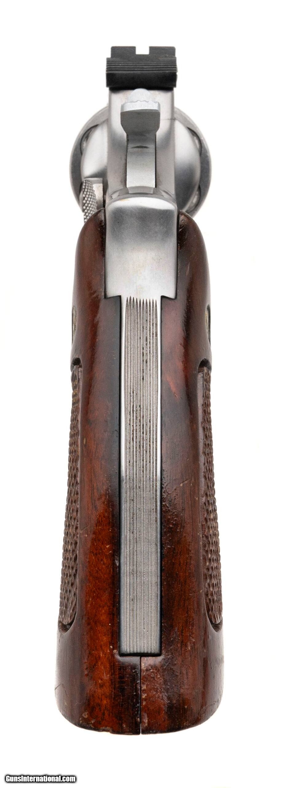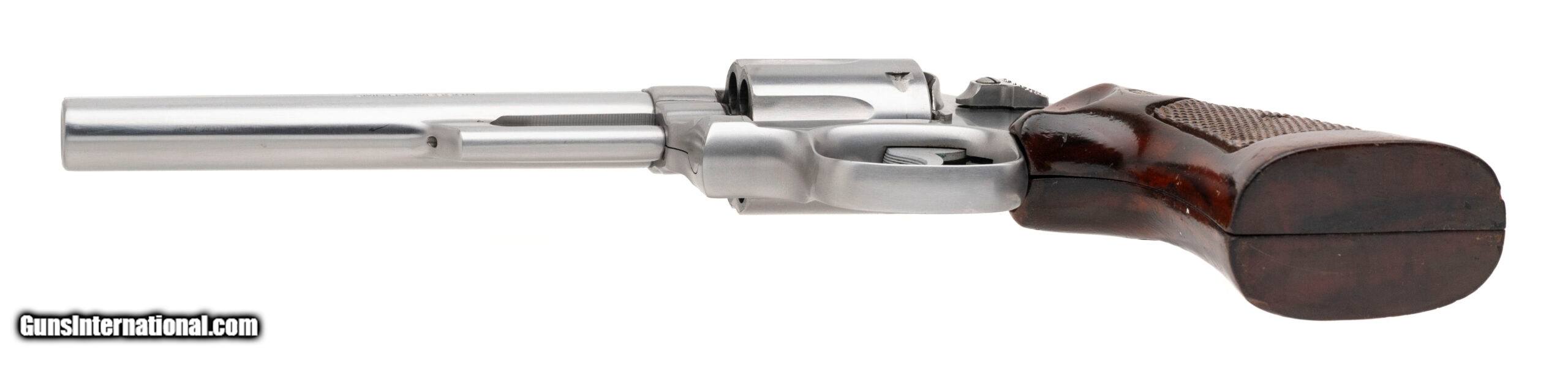Description: "SN: 55K9310 made circa 1970's. Stainless steel double action K frame 357 magnum with a 6"" half lug pinned barrel, 6 shot fluted recessed cylinder, adjustable rear sight and checkered walnut medallion target grips, Grips have moderate wear and handling marks, metal finish is very good, overall in very good condition with an excellent bore. Price: $995.00 Contact Seller |