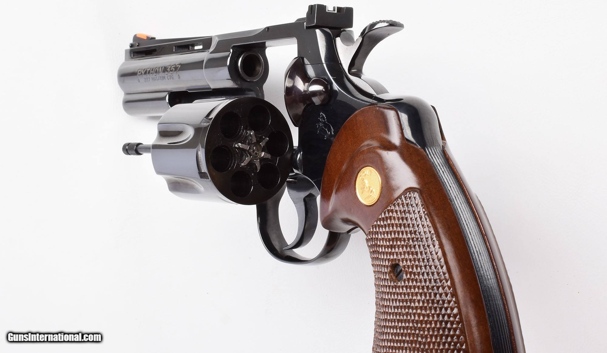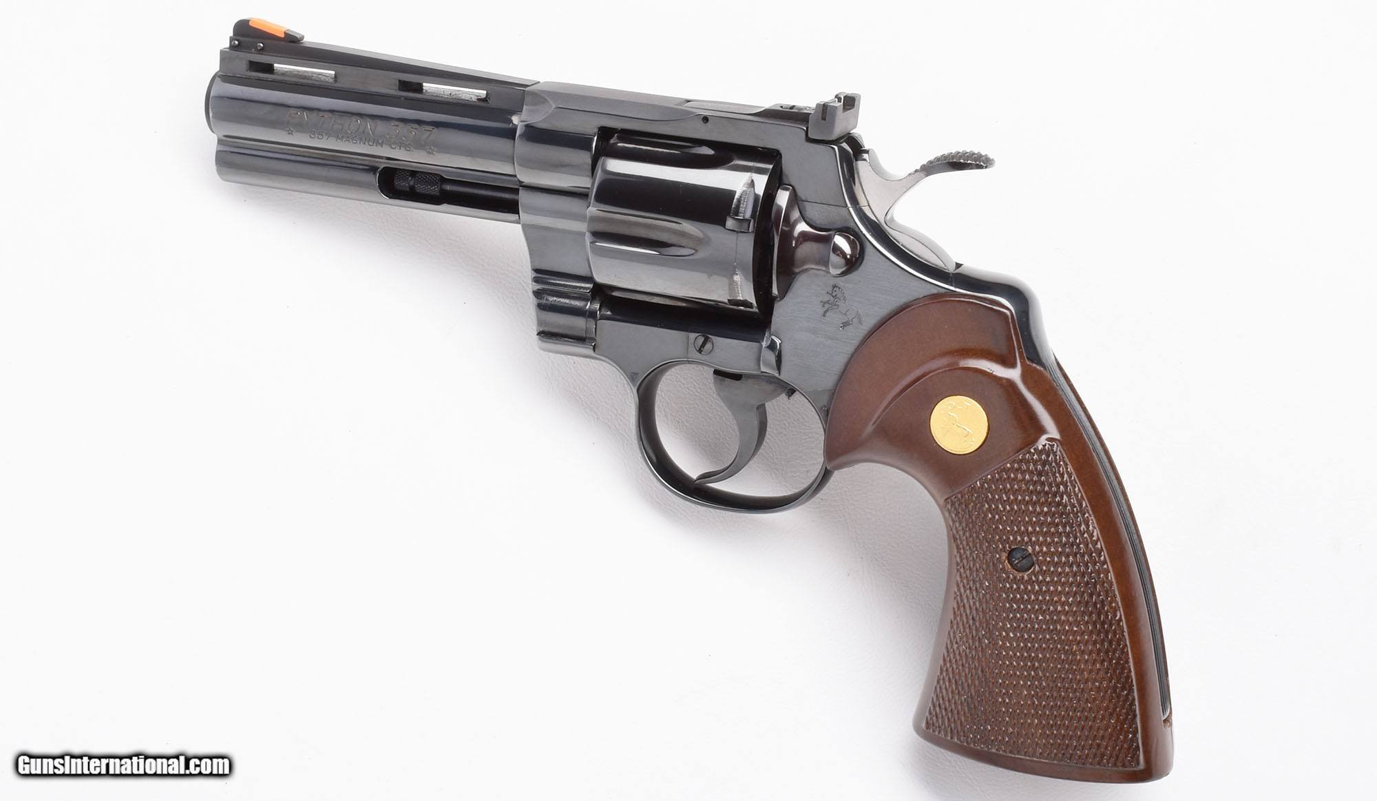 Description: High Condition pre-owned 1977 Colt Python in .357 Magnum. Excellent bore presents bright and sharp. Bluing remains in very good order throughout exhibiting a well-preserved finish with minimal wear with only light signs of honest use. The revolver bears minor surface abrasions, commensurate with age and handling. Mechanism is crisp and appears to be mechanically sound. Includes soft case. SOLD Handgun Caliber: .357 Magnum Manufacturer: Colt Model: Python Caliber Info: .357 Magnum Condition: High Condition Metal Condition: High Polished Blue Bore Condition: Bright and Sharp Action: DA/SA Weight: 39 oz Sights: Front Orange Ramp / Rear Adjustable Manufacture Date: 1977 Item Location: Buda, TX |