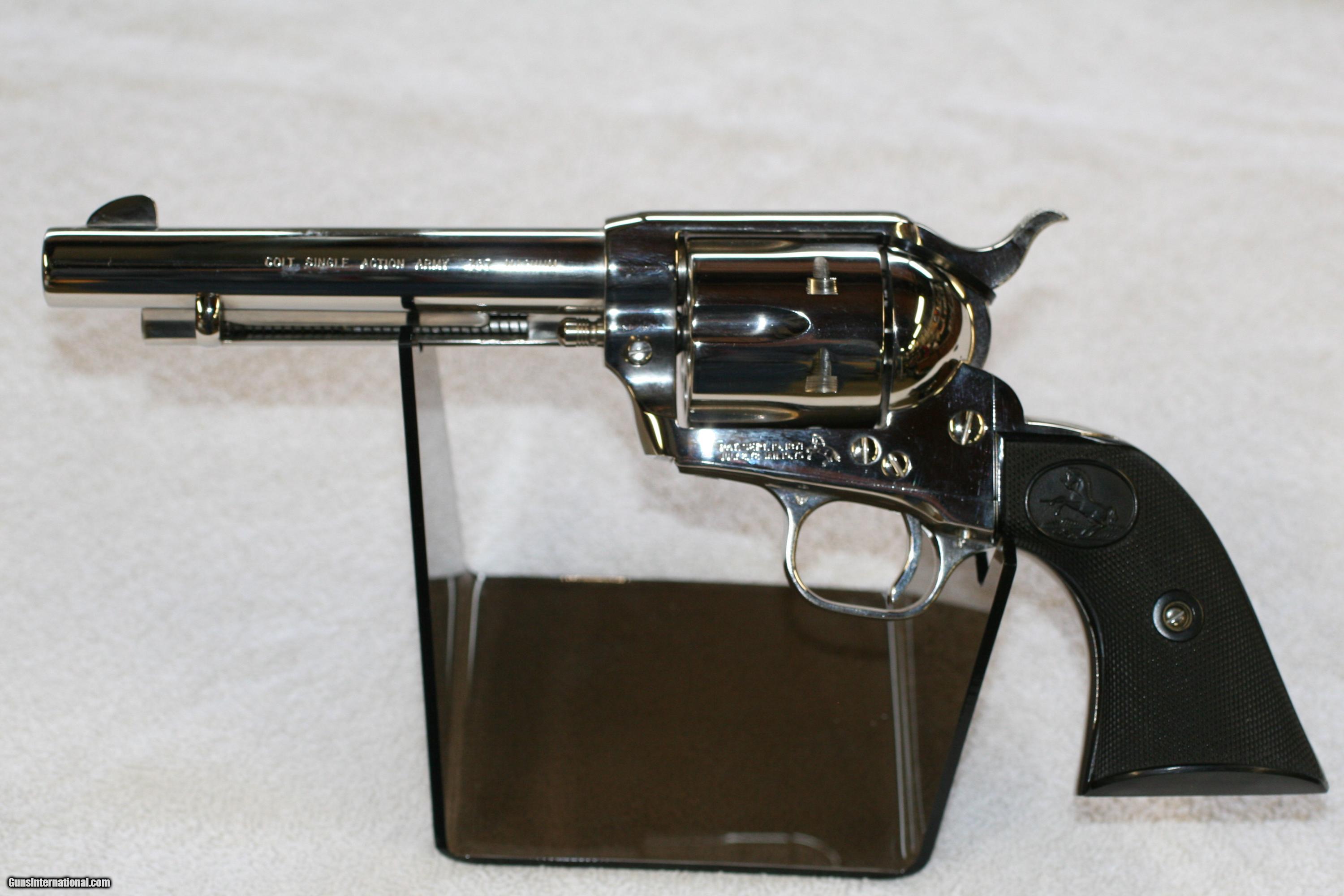 Description: Colt's Single Action Army Revolver, 5 1/2" Barrel, .357 Magmun Caliber, Nickel finish, Serial No. 32742SA. Shipped from Colt 1960 to Jackson, MS. Colt made only 556 in this configuration. This revolver is in perfect condition with no drag marks or scratches to the nickel finish. In the black box with papers and brush. Colt factory letter included. SOLD Curio/Relic: Yes Manufacturer: Colt's Manufacturing Company Model: Single Action Army Serial Number: 32742SA Caliber Info: .357 Magnum Chambers: 6 Condition: Excellent Metal Condition: Excellent Barrels: 5 1/2 Finish: Nickel Manufacture Date: 1960 |