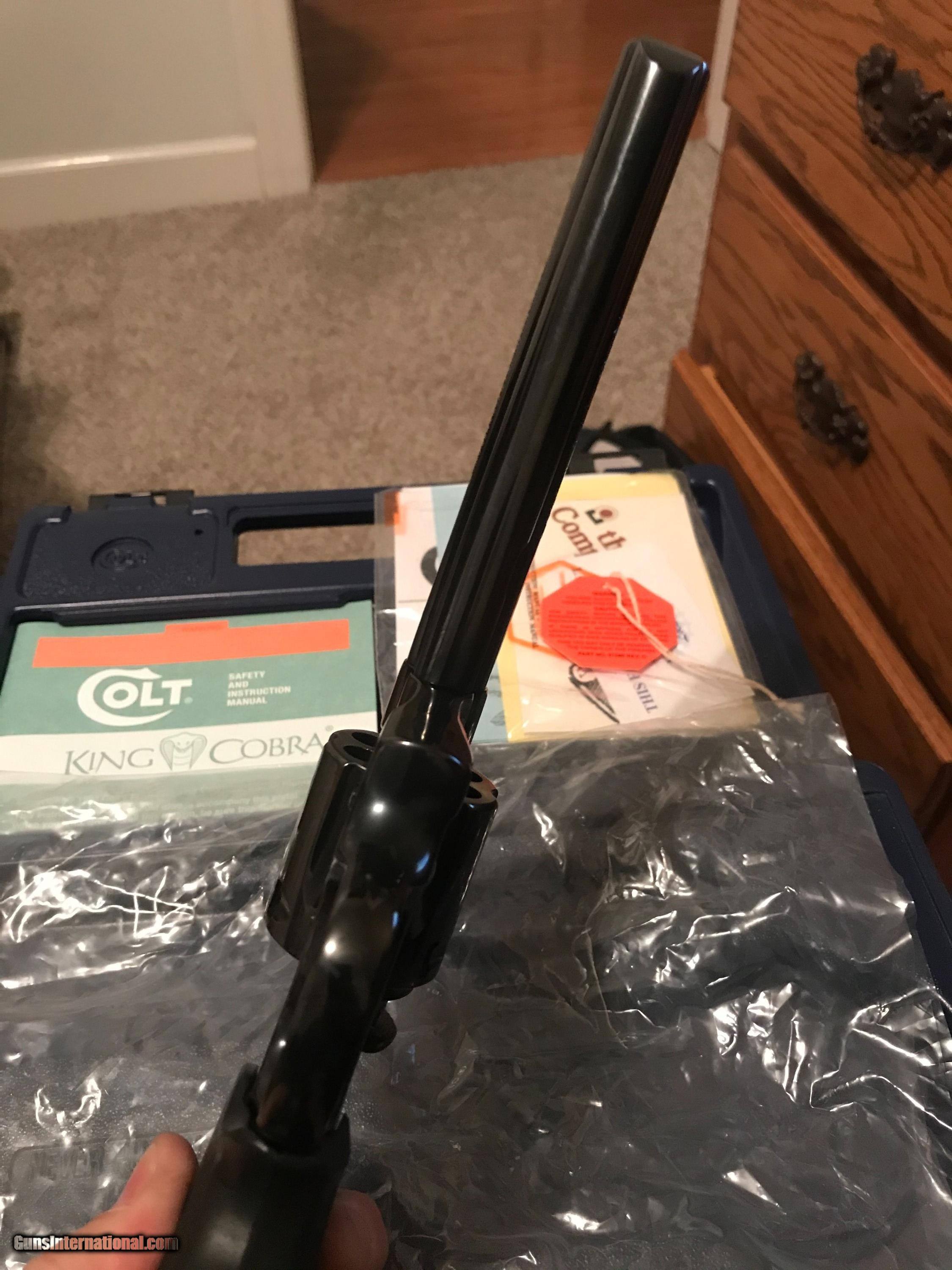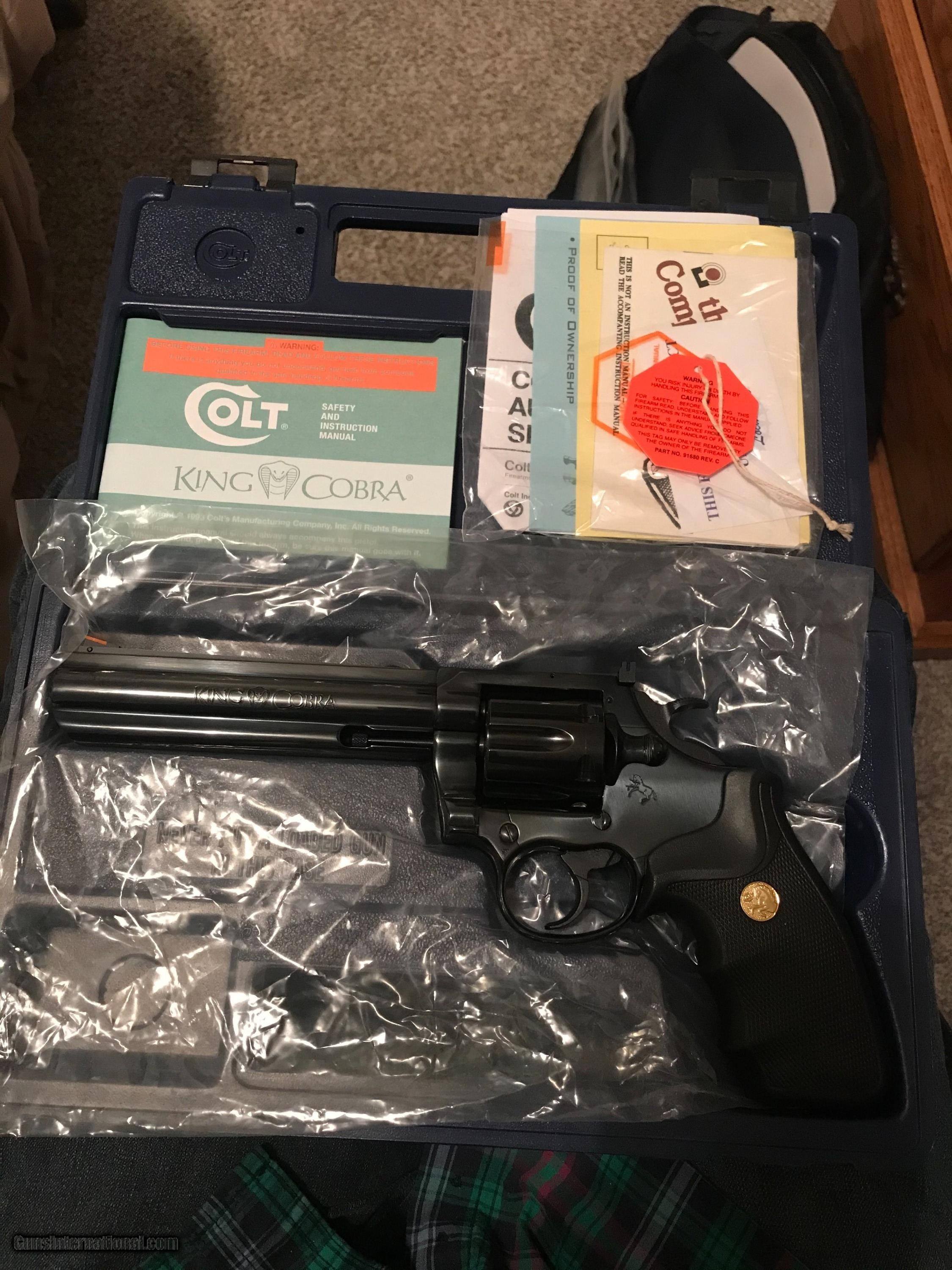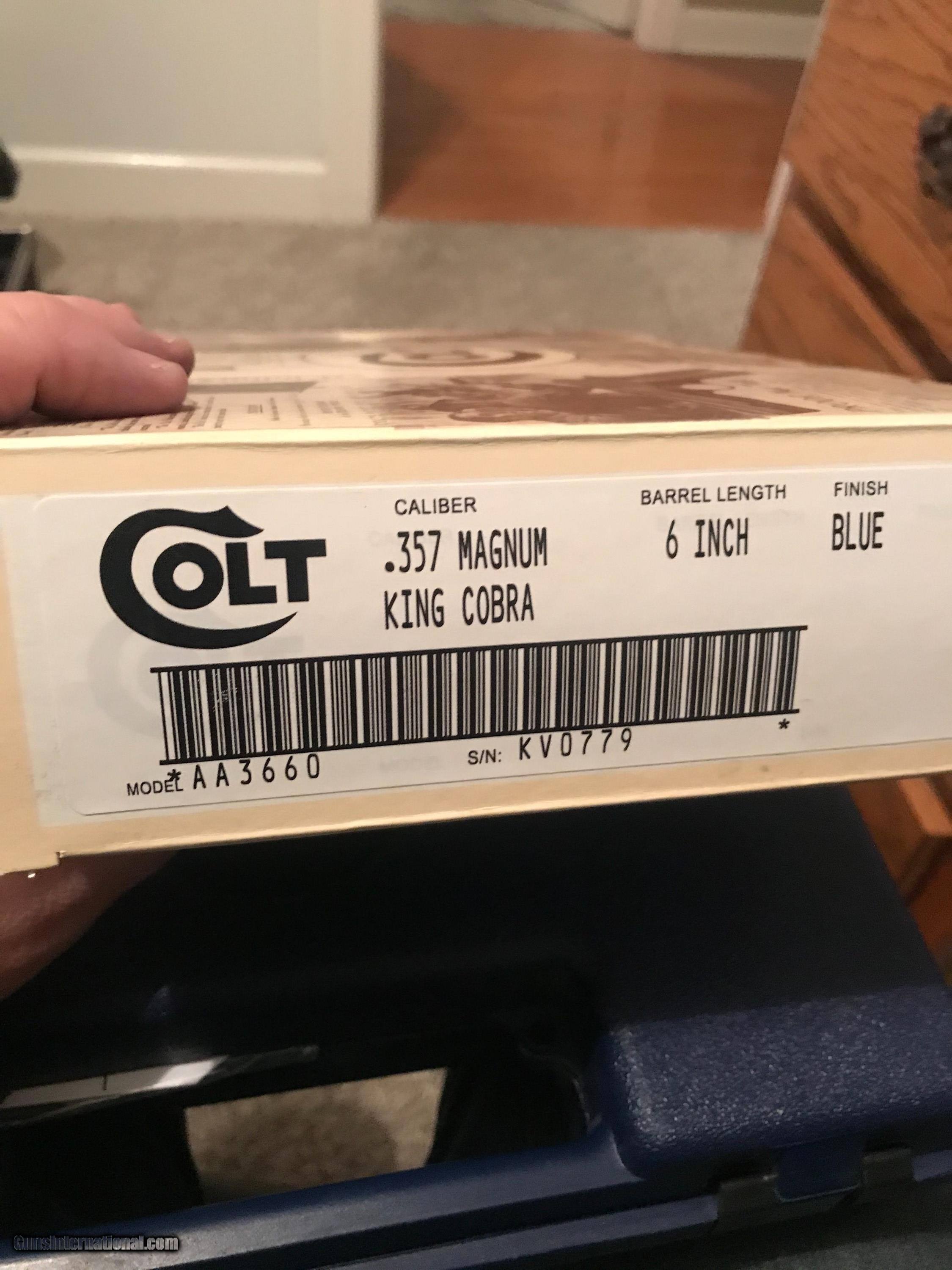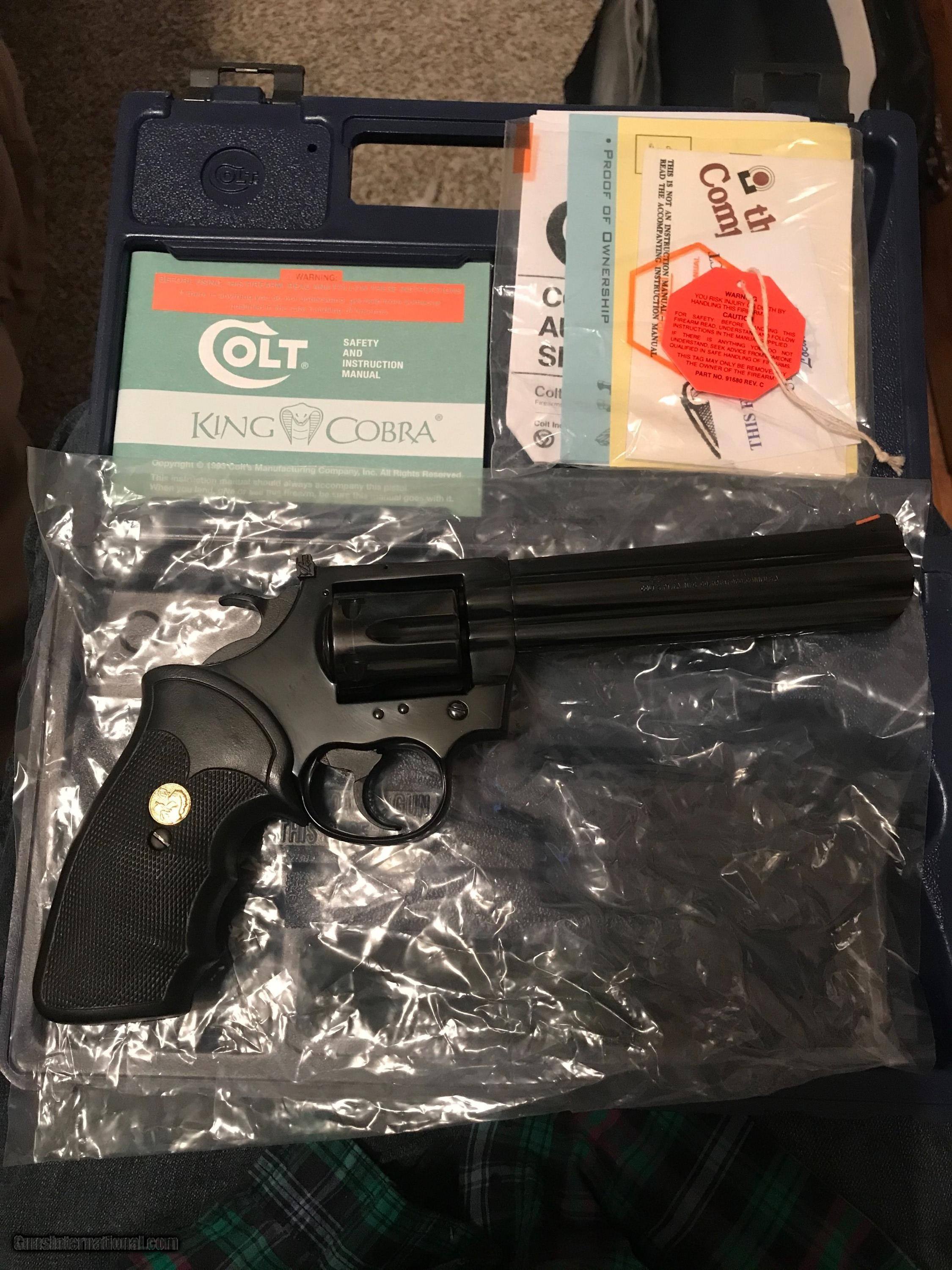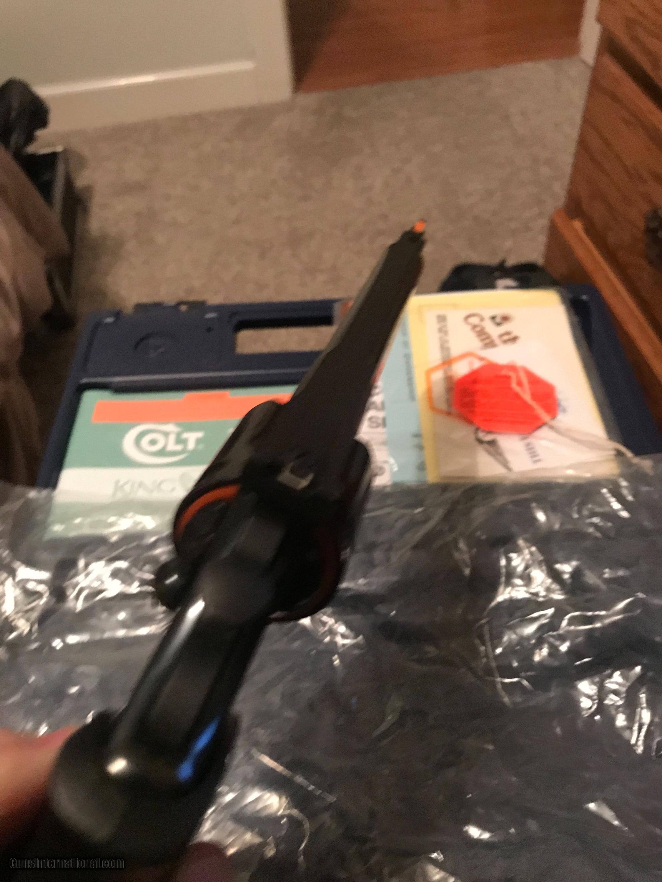 Description: Kings are hard to find and one like this is nearly impossible! 6 inch full lug barrel, BLUE finish, target sights, hammer, and trigger, original numbered box, papers, and sleeve. One fine King cobra! Please email with questions. Shipping included. Cards add 3% *pictures of the box are to show it isn't a reproduction. Slide marks and scuffs show it's original SOLD Manufacturer: Colt Model: King Cobra Barrel Length: 6 in Condition: Used Metal Condition: Excellent Bore Condition: Excellent Action: Double Rib: Yes Finish: Blue Sights: Target Item Location: 37075 |