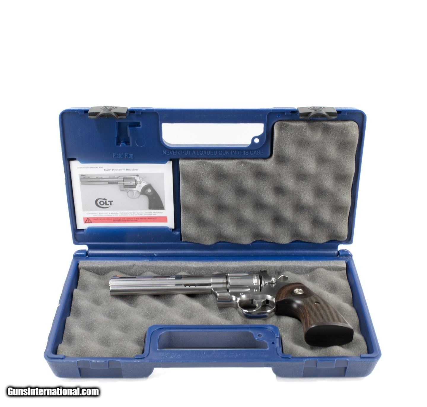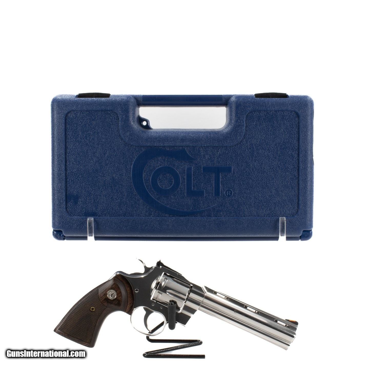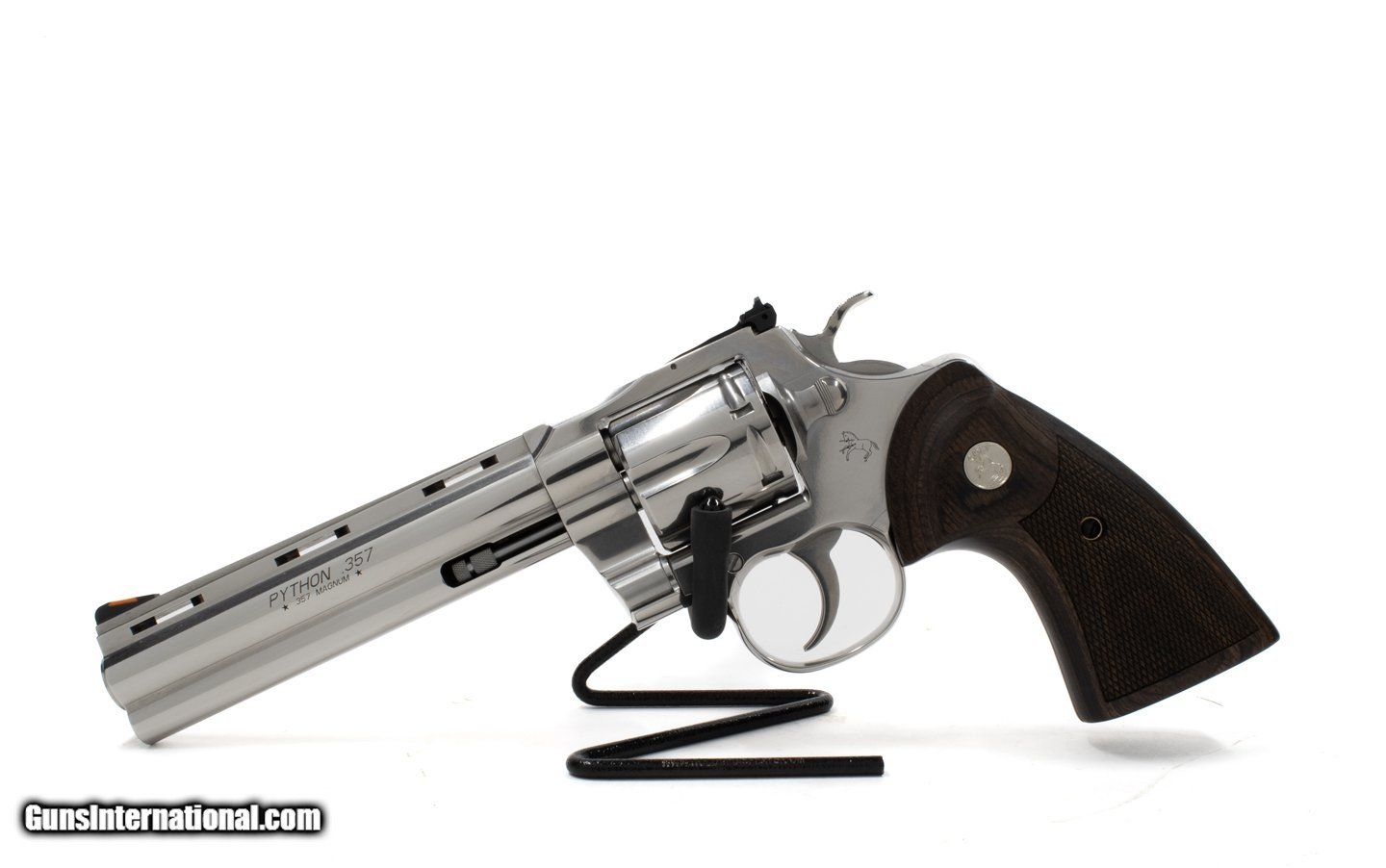 Description: Guns Listing ID: 586355 Colt Python Stainless Steel Revolver .357 MAG 6\" w/ Original Case Manufacturer: Colt Model: Python Condition: Excellent Caliber/Gauge: .357 Magnum Action: DA/SA Barrel Length: 6\" Capacity: 6 Sights: Orange front ramp & adjustable rear sights Finish: Stainless Steel Grips: Wood Origin: Made in USA Other Features: Full lug, vented ribbed barrel, fluted cylinder What‚‚s Included: Firearm, original case, manual. SKU: 6470181 • Please be aware that we have not test-fired this firearm. Unless stated otherwise, expect this firearm to fire and function safely. Manufacturer: COLT Model: PYTHON Caliber Info: .357 MAG Condition: Used - Non-Certified Barrels: 6" BARREL Action: REVOLVER Finish: stainless steel Price: $1,374.99 Contact Seller |