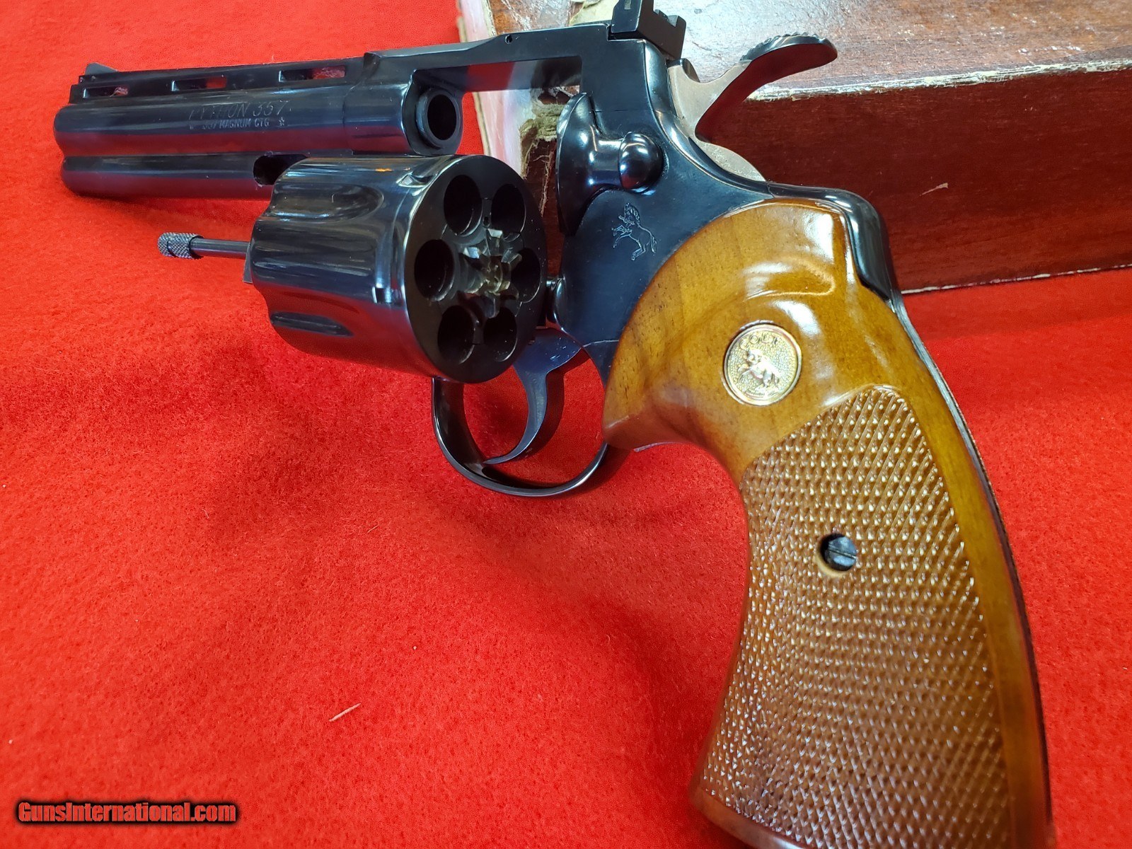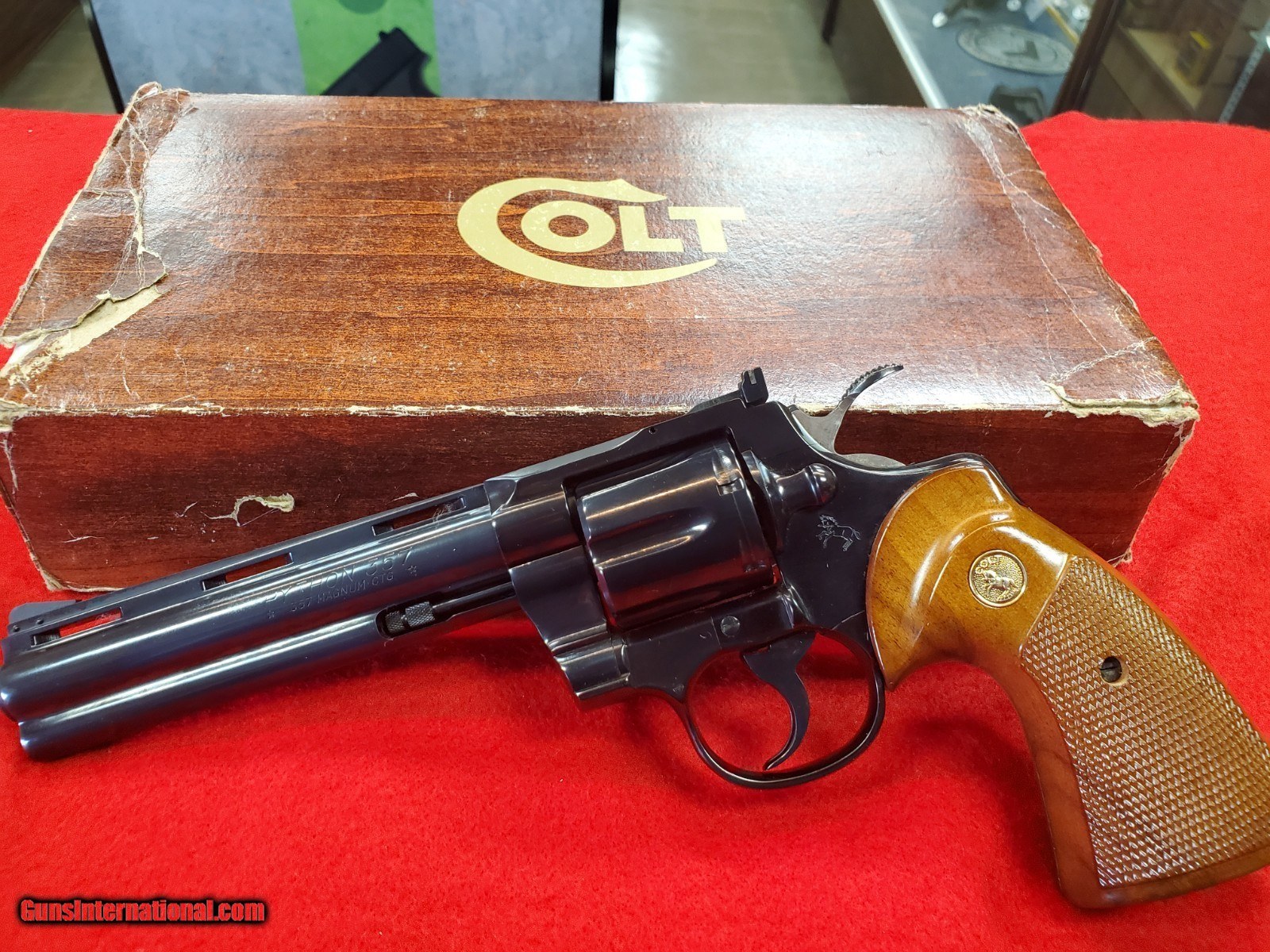 Description: Today we have a very nice Colt Python Revolver, 1977 Mfg., great cylinder lock-up, no end shake, clean bore, great finish, with factory box, grips in fine shape. These guns have that awesome, deep charcoal blue finish and actions as smooth as glass. This will make a fine addition to a collection and a great shooter if that is your interest. Don't let this one slip through your hands! SOLD Handgun Caliber: .357 Magnum Manufacturer: Colt Model: Python Serial Number: 68705E Barrel Length: 6 Chambers: 6 Condition: Used Metal Condition: Excellent Wood Condition: Excellent Bore Condition: Excellent |