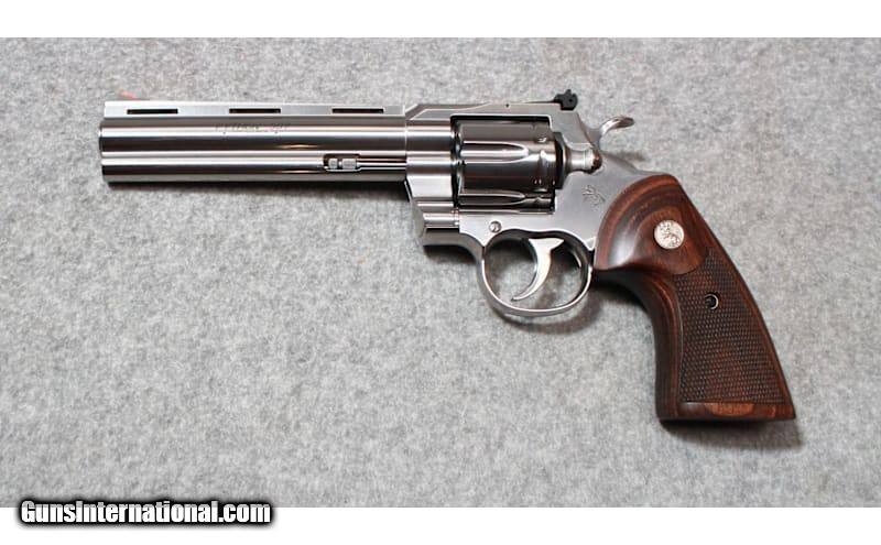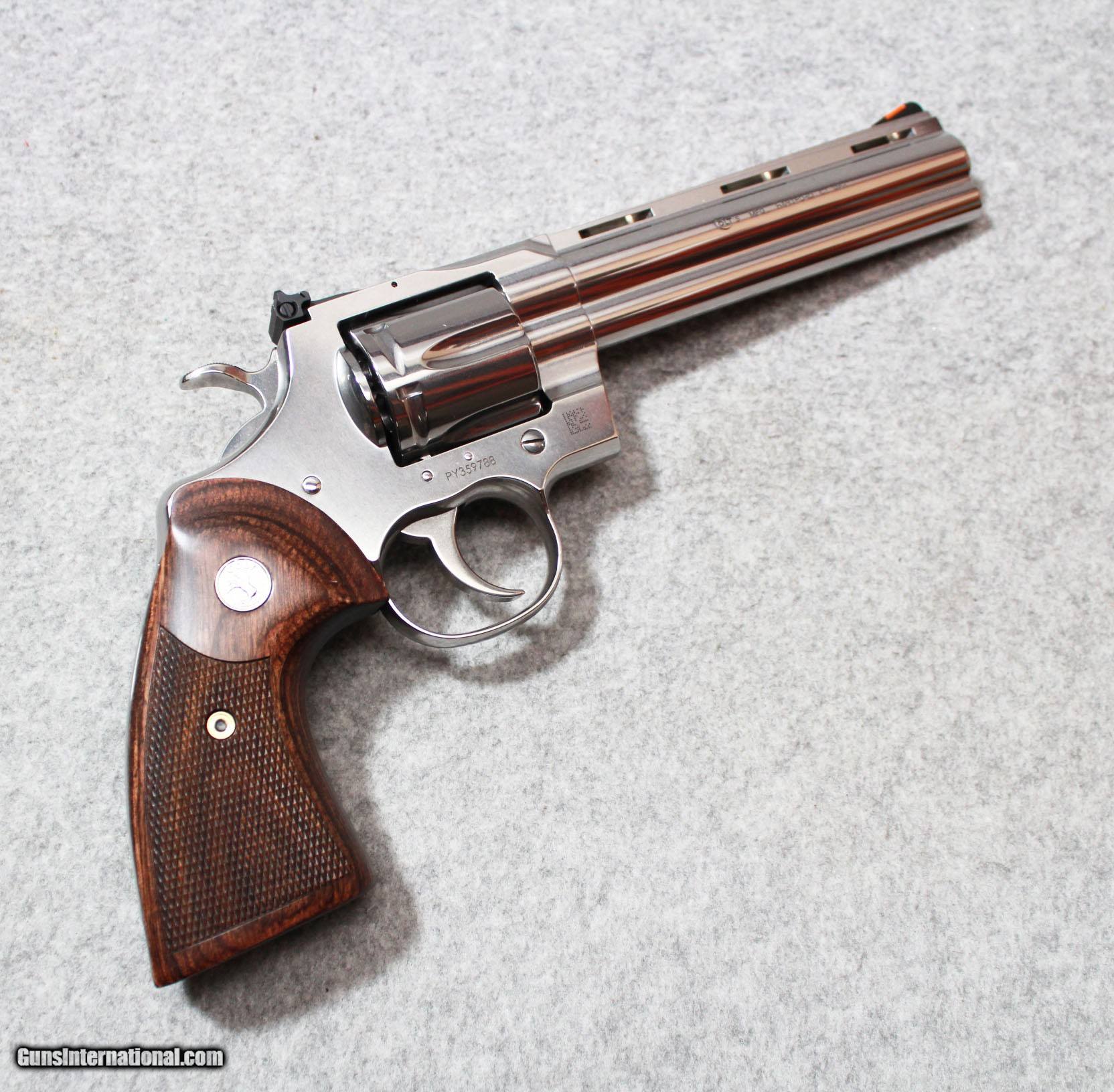 Description: Colt Python stainless steel, double action revolver chambered in .357 Magnum. It has a 6" vent rib barrel with full lug. The front sight is a black blade with orange insert, and the rear sight is an adjustable black u-notch. The factory grips have Colt medallion inlays. Includes factory hard case, and manual. Free Shipping to any Bass Pro Shops or Cabela's store. .357 Magnum Metal Condition: Very Good Wood Condition: Very Good Bore Condition: Bright And Clear Barrels: 6 inch Triggers: Double Action Weight: 47 oz Sights: Front: Black Blade with Orange Insert / Rear: Black Adjustable U-Notch Item Location: Allen, TX Price: $999.99 Contact Seller |
