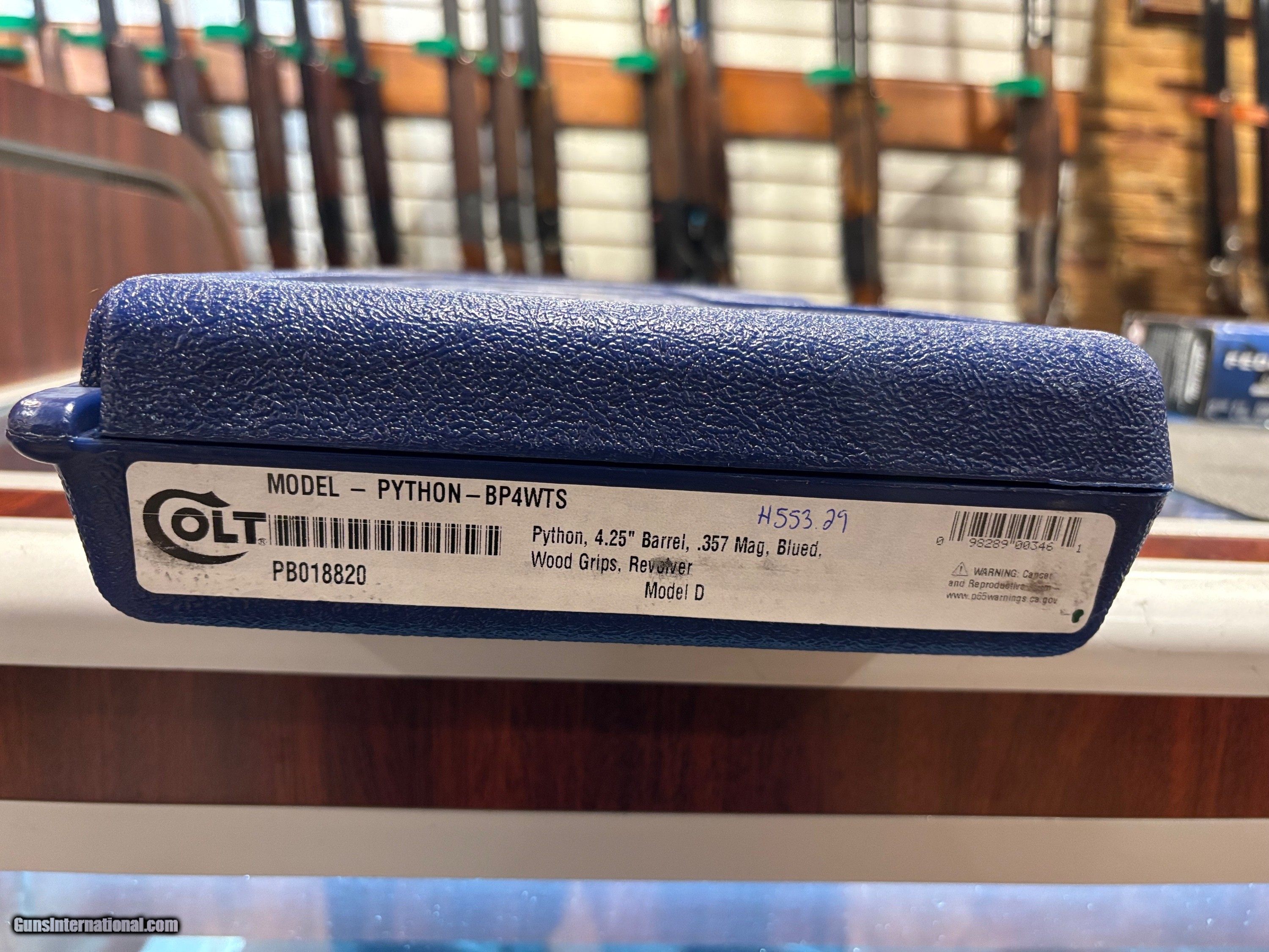 Description: Colt Python Model D .357 Magnum DA/SA 6 round capacity Blued w/wood grips Handgun Caliber: .357 Magnum Manufacturer: Colt Model: Python Serial Number: PB018820 Barrel Length: 4.25 Condition: NEW Price: $1,575.00 Contact Seller |