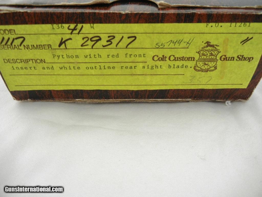 Description: This is a Colt python 357 with a 4 inch barrel. This gun is 100% new in the box. Serial # is K29xxx. Buyer pays 65.00 shipping. Thank you. 34-21-9 SOLD |