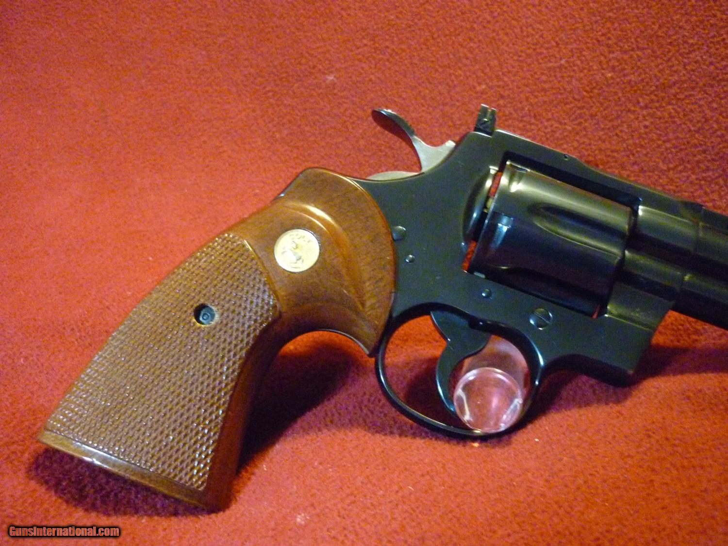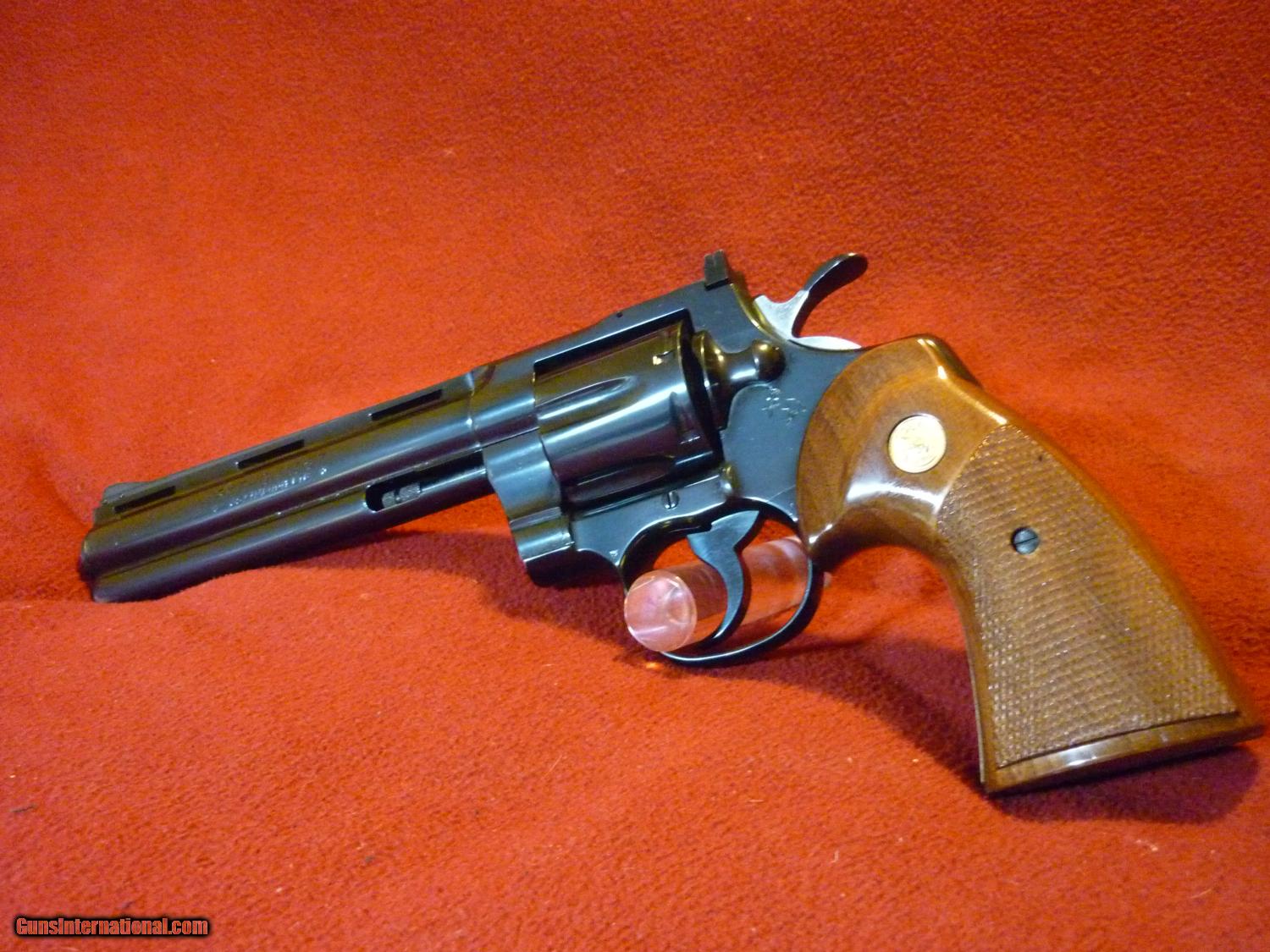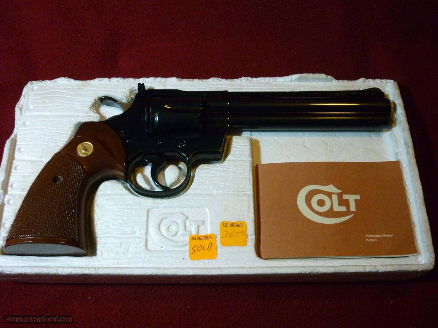 Description: Colt Python revolver 6 inch blue, was manufactured in 1976! The Python is exceptionally clean, with a perfect bore, and locks up tight, and is in perfect time! It comes from the factory witha deep Colt blue finish, the original box, owners manual, hang tag, and Colt welcome letter! This Python looks unfired, with no cylinder ring, but does have a very slight loss of bluing at the end of the barrel lug on the one side of this beautiful revolver! I have to believe that this Colt was carried for a short time, and maybe unfired! This beautiful Colt python has the original box..... showing where this Colt was purchased at Ace Hardware in 1976 for $365.00 a VERY RARE FIND!!! This Python would make a great addition to any Colt collection!! I will also offer a LAYAWAY option for the buyer to take advantage of, and you can make payments on this Colt... if the buyer wishes!! Buyer to pay 50.00 shipping to a FFL dealer of your chouce in the lower 48 states, and your FFL dealer, with do the background check paper work... at the time of sale! Call Steve 605-212-7213 SOLD |