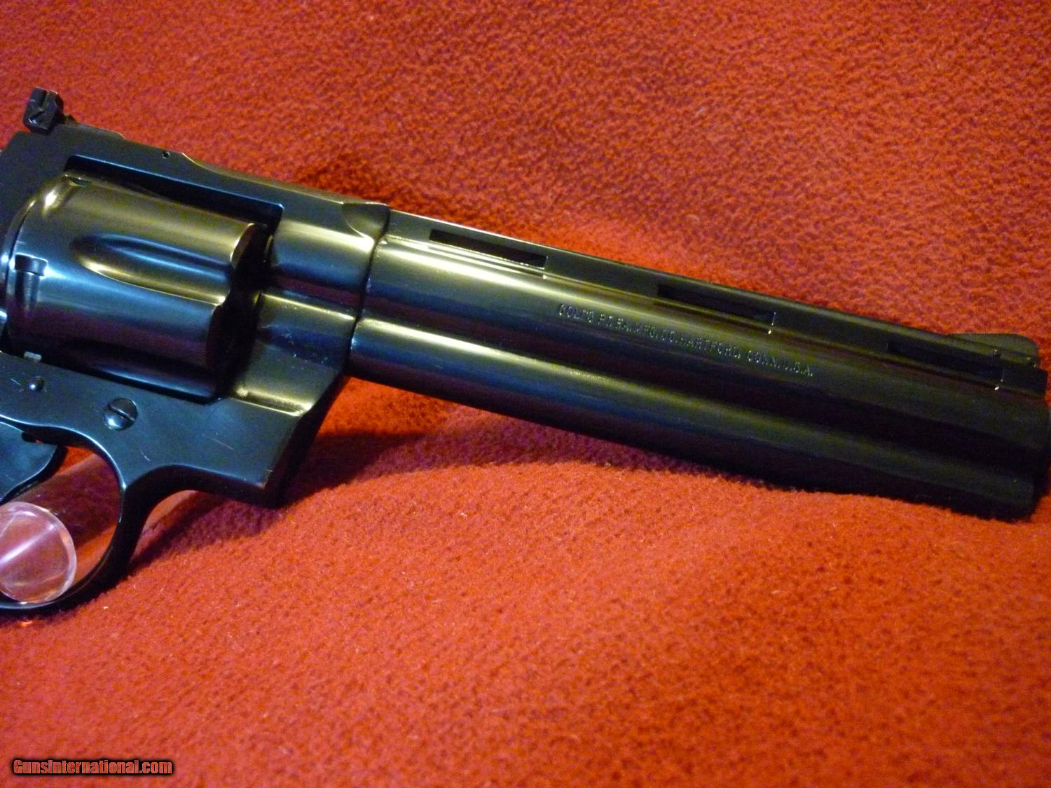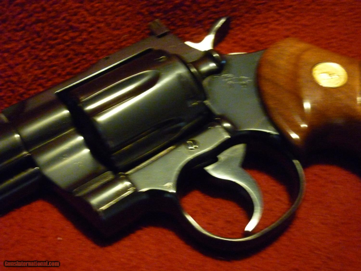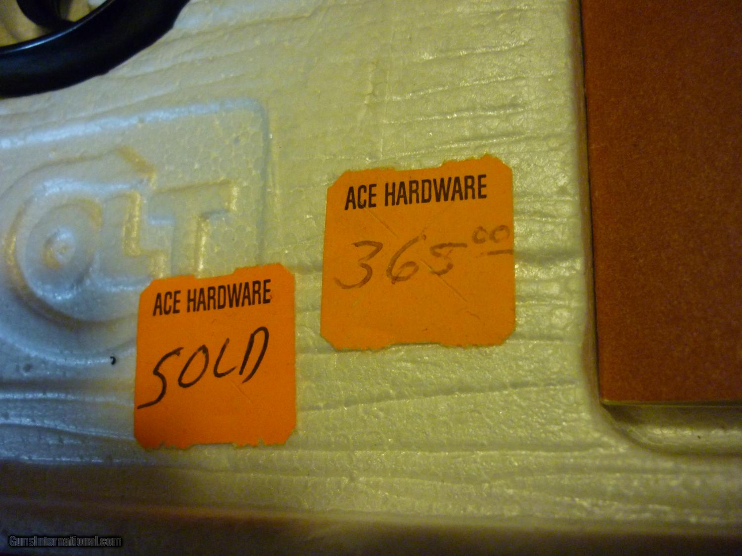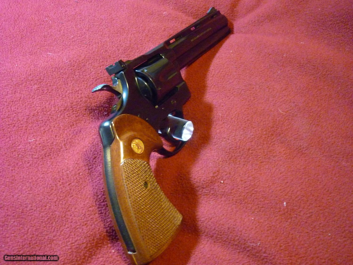 Description: Colt Python revolver 6 inch blue, was manufactured in 1976! The Python is exceptionally clean, with a perfect bore, and locks up tight, and is in perfect time! It comes from the factory witha deep Colt blue finish, the original box, owners manual, hang tag, and Colt welcome letter! This Python looks unfired, with no cylinder ring, but does have a very slight loss of bluing at the end of the barrel lug on the one side of this beautiful revolver! I have to believe that this Colt was carried for a short time, and maybe unfired! This beautiful Colt python has the original box..... showing where this Colt was purchased at Ace Hardware in 1976 for $365.00 a VERY RARE FIND!!! This Python would make a great addition to any Colt collection!! I will also offer a LAYAWAY option for the buyer to take advantage of, and you can make payments on this Colt... if the buyer wishes!! Buyer to pay 50.00 shipping to a FFL dealer of your chouce in the lower 48 states, and your FFL dealer, with do the background check paper work... at the time of sale! Call Steve 605-212-7213 SOLD |