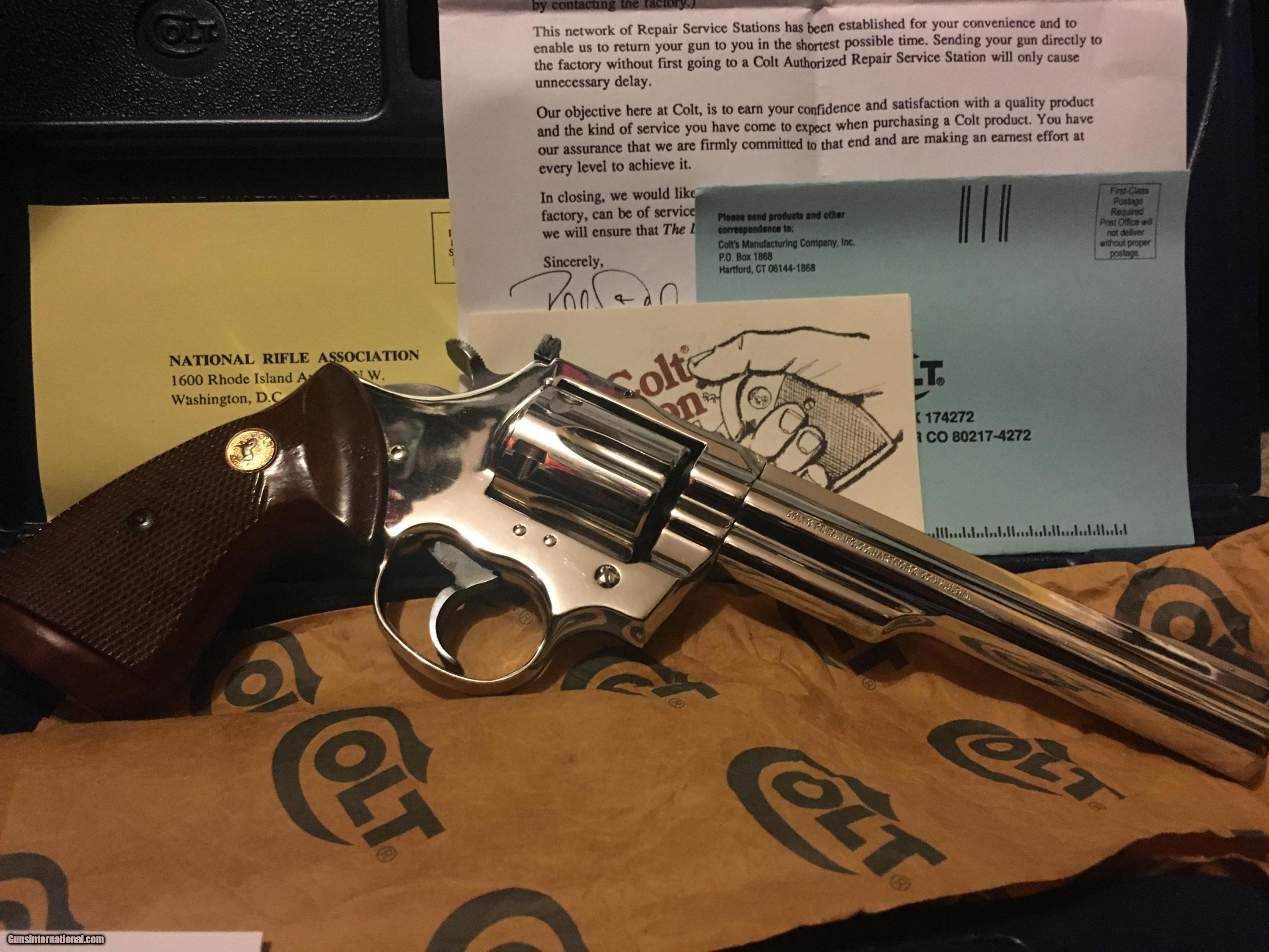 Description: Very nice nickel Trooper in .357 Magnum. Beautiful wood grips with sharp checkering. Action is smooth. Bore shiny. Nickel is bright. 2 flaws, one adjacent to the cylinder release (see photo) and scratch below the cylinder itself (see other photo). Comes with blue plastic box with some paperwork and an orange hang tag. Beautiful pistol to shoot or to add to your collection. Price includes shipping. Please email with any questions. SOLD Manufacturer: colt Model: trooper Caliber Info: .357 mag. Condition: used Metal Condition: excellent Wood Condition: excellent Bore Condition: excellent Finish: nickel Case: plastic Item Location: 37075 |