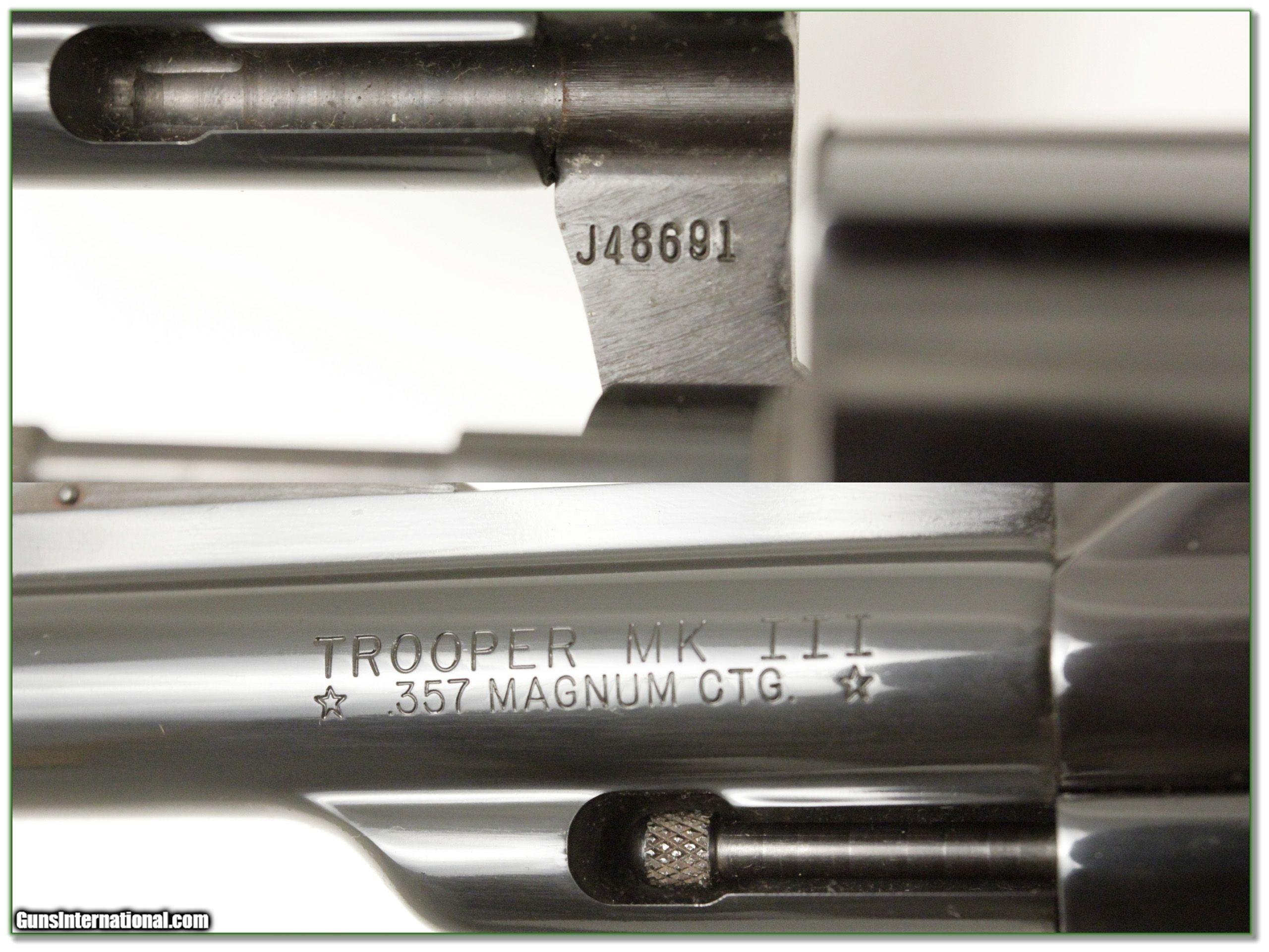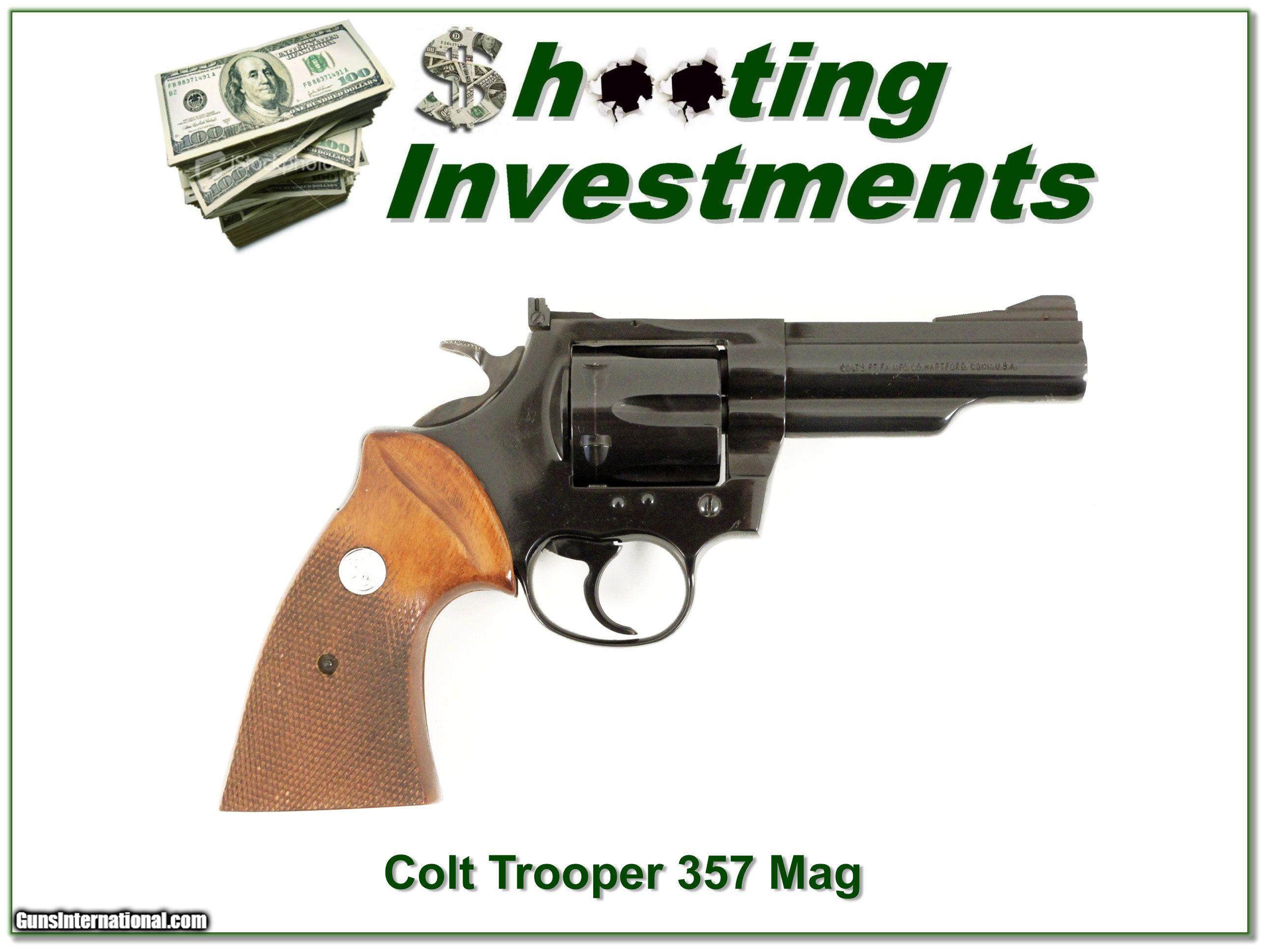 Description: This is an excellent condition 4in Colt Trooper MK III in 357. It has light use with no marks of note. I am selling this one on consignment and as such lay-a-way can’t be used. It does of course have the standard 3-day inspection. Shipping and insurance is $29. Please email me with any questions or larger pictures. (Consign your quality firearms with Shooting Investments for only 10%! Let me know if you have any you would like to sell!) 18-0043 Payment: Payment is by Money Order, Cashiers Check or Personal Check. I can now also accept MasterCard and Visa with a 3% convenience fee. PayPal can be used for some items but never firearms. Please let us know if you would like to pay via PayPal. Shipping: The shipping charge will be listed in each description. It is $39 for most long guns and $29 for most handguns. Some heavy guns or those insured for over $2000 will be higher. Shipments to Alaska and Hawaii are higher because air shipment is required. Most firearms are shipped on Tuesday and Thursday and usually in 5 days of receipt of payment. We package all shipments carefully and insure them. For long guns you can purchase a new Plano case for $19. They now cost us $22 when buying 100 at a time. Optics are shipped Priority Mail and most other non-firearm shipments are shipped First Class. Returns: Our return policy is simple. If for any reason you are not pleased with your purchase, you may return your item for a full refund of purchase price. Ammunition cannot be returned. It is important to us that you are happy. Guns cannot be fired or dissembled before returning them and they must be returned in the same condition as received. Notification of a return must occur with-in 3 days of receipt at your dealer. Shipping, convenience and dealer fees are not refundable and are the responsibility of the buyer. Lay-a-way: If needed, we offer a 60 day lay-a-way option on most firearms. It is 1/3 now, 1/3 in 30 days and 1/3 in 60 days. Lay-a-way firearm sales are final and if not completed the first payment cannot be returned. Consigning your firearms with Shooting Investments: We will help you get top dollar for your firearms. While most local guns shops charge 20% or more, our fee is only 10% with a minimum of $75. At your local gun shop it might take months to sell. Selling on-line provides instant access to thousands of interested buyers. You won’t find any other on-line dealer willing to sell your firearms for only 10% or listing every gun on 3 separate s. Selling through an House typically costs the seller 15% and the buyer an addition 15% (so 30%) and you have to wait several months to sell and longer to receive funds. If properly priced, we will sell your firearms in a few weeks. Send us an email or give us a call and we’ll explain how easy it is for you to get top dollar. Trading: Trading for use is really just buying your gun to re-sell. If you have a gun you want to trade, please email a picture and we will let you know what we can give or it. You will always get more if we sell it for you on consignment. Help for California Buyers: We are happy to ship to California. It is the buyer’s responsibility to make sure any item you buy is legal in your state. We are also happy to help with your purchase of a firearm from someone other than us. If you see a gun you would like to buy but the seller can’t or won’t ship to California they can ship to use and we’ll then ship it to your California dealer. The cost for this service is only $30 + shipping. Let us know if we can help! SOLD |