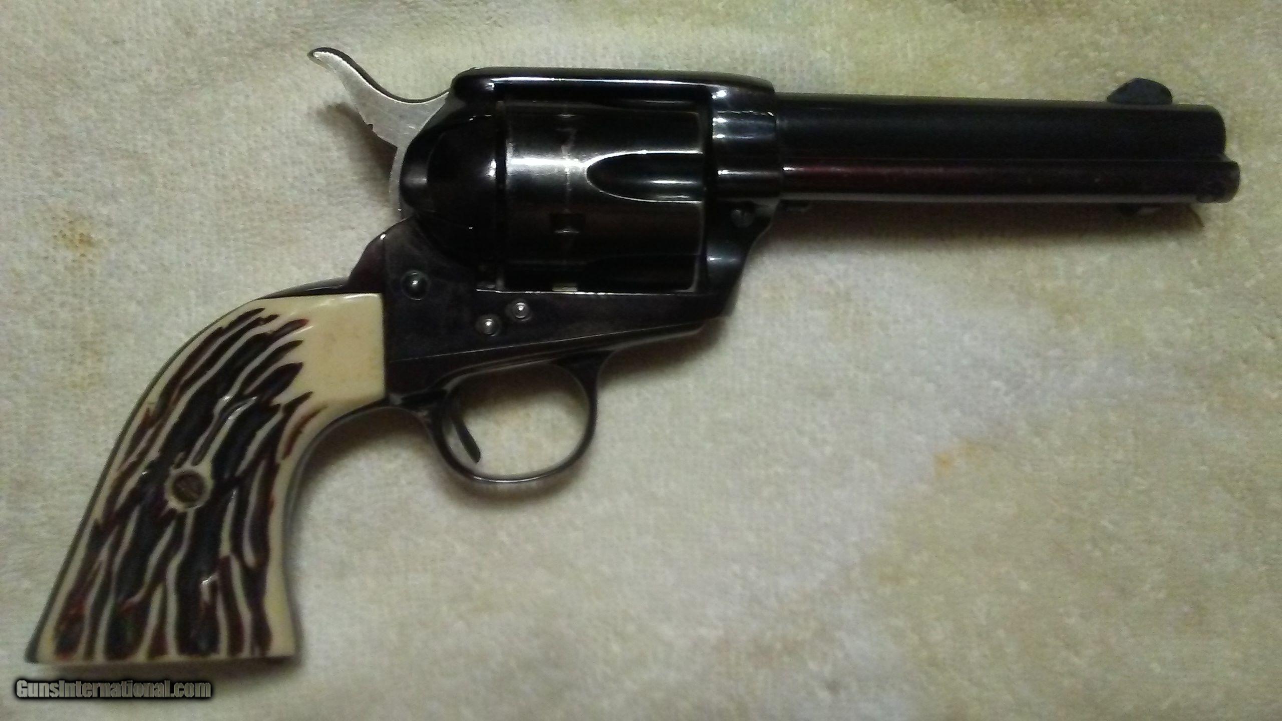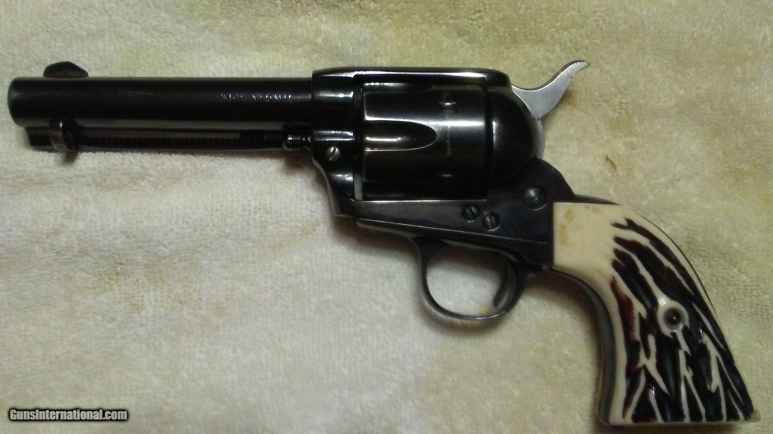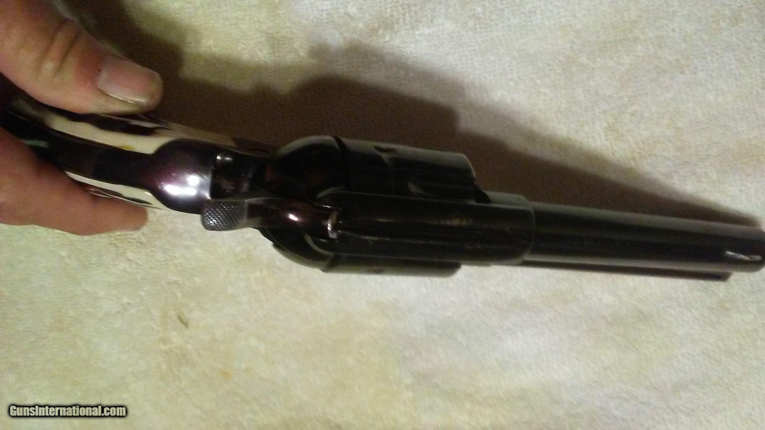 Description: What we have here looks to be a frontier 357 atomic. everything from blue book values fit's.4 3/4 barrel,faux stag grip's,blued,pin mounted in recoil shield.Look these firearms up on internet they have a great story behind them.these were used by john wayne,don knots and more in the movies.bore is bright and in good shape.Has score marks on cyclinder and handling marks on the gun.fires and funtions perfect. I had the hammer recut to ensure funtion of the firearm. This is a low sn# gw732. This is a hard to find colectors. SOLD Manufacturer: great western arms Model: frontier Serial Number: gw732 Caliber Info: 357 atomic Condition: good Finish: blue Manufacture Date: 1958 |