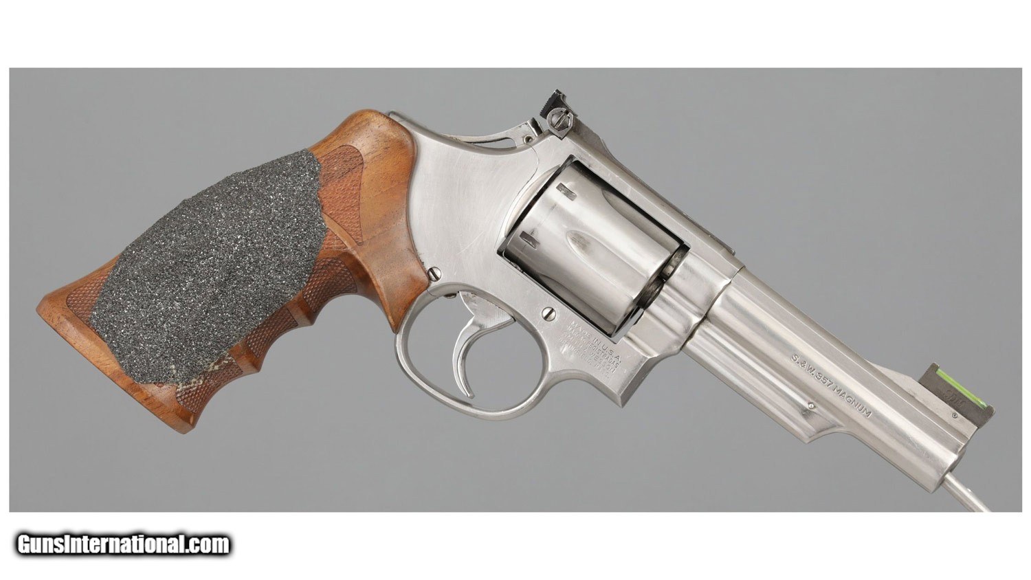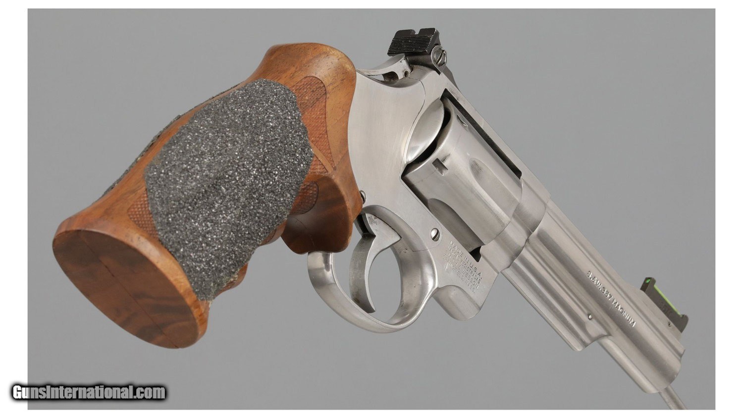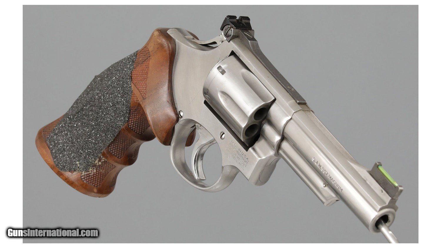 Description: Stainless gun with super smooth reworked action, green fiberoptic front dot sight, skeletonized and bobbed hammer, super nice checkered custom grips that have been made even grippier by the application of some kind of grit tape. Even the chamber mouths have been radiused for fault-free speedloading. Someone spent a ton of money on this gun, so you don't have to. In the factory blue plastic case. Price: $1,000.00 Contact Seller |