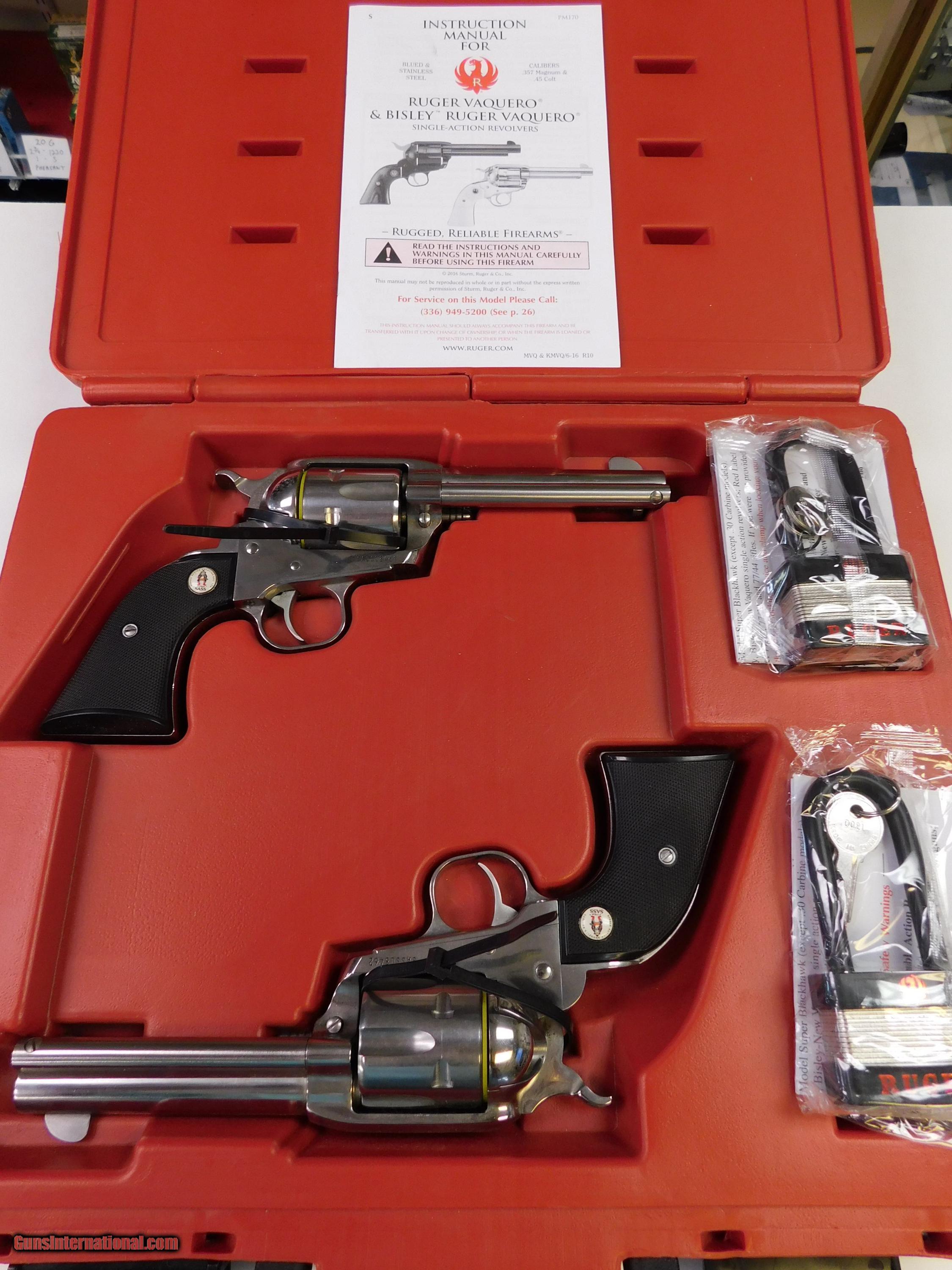 SOLD Manufacturer: RUGER Model: SASS VAQUERO Serial Number: SASSD8461/SASSD8462 Caliber Info: 357 MAG Condition: NIB Barrels: 4.62 Action: SINGLE Finish: HI GLOSS STAINLESS Weight: 45oz |