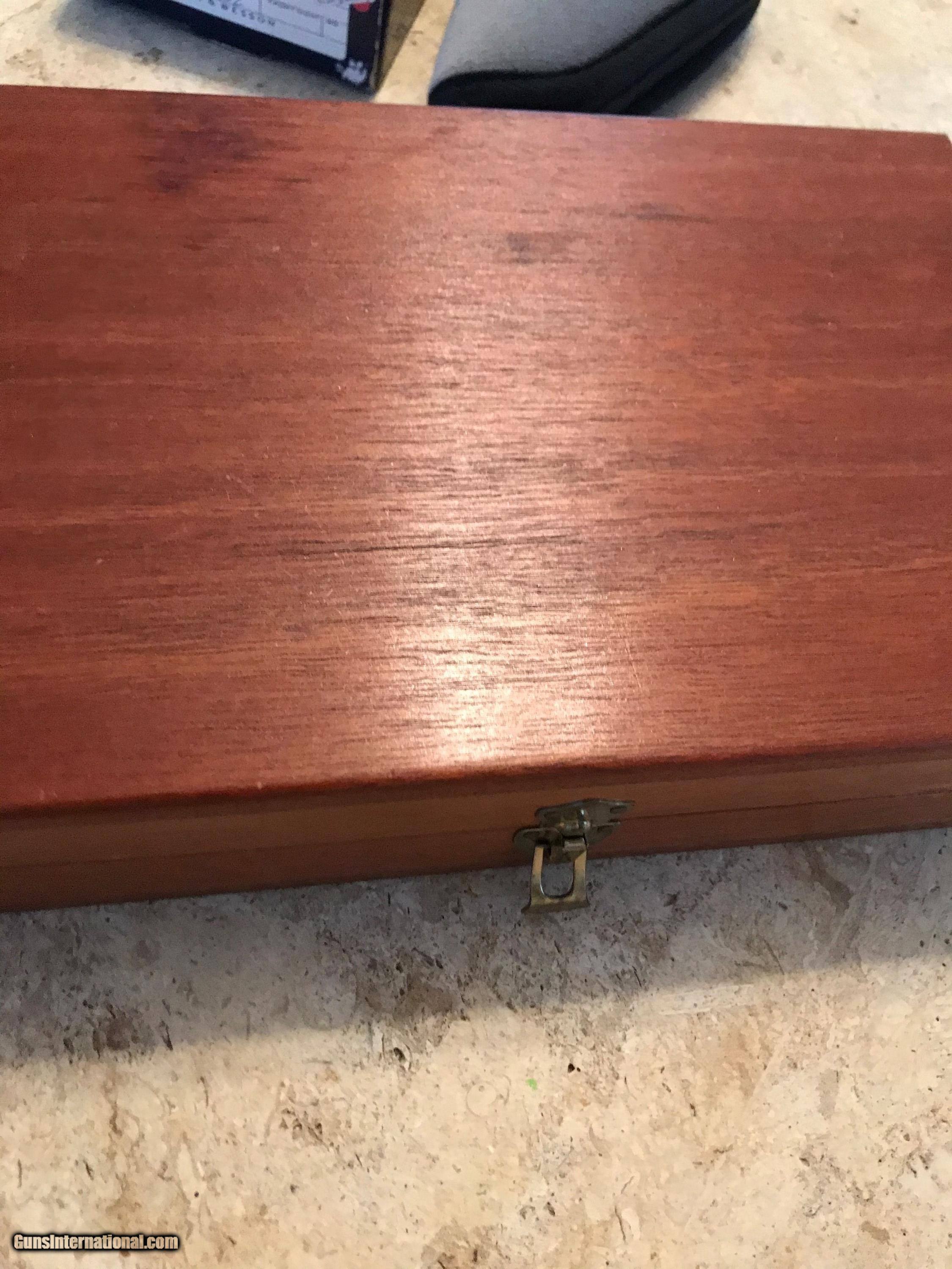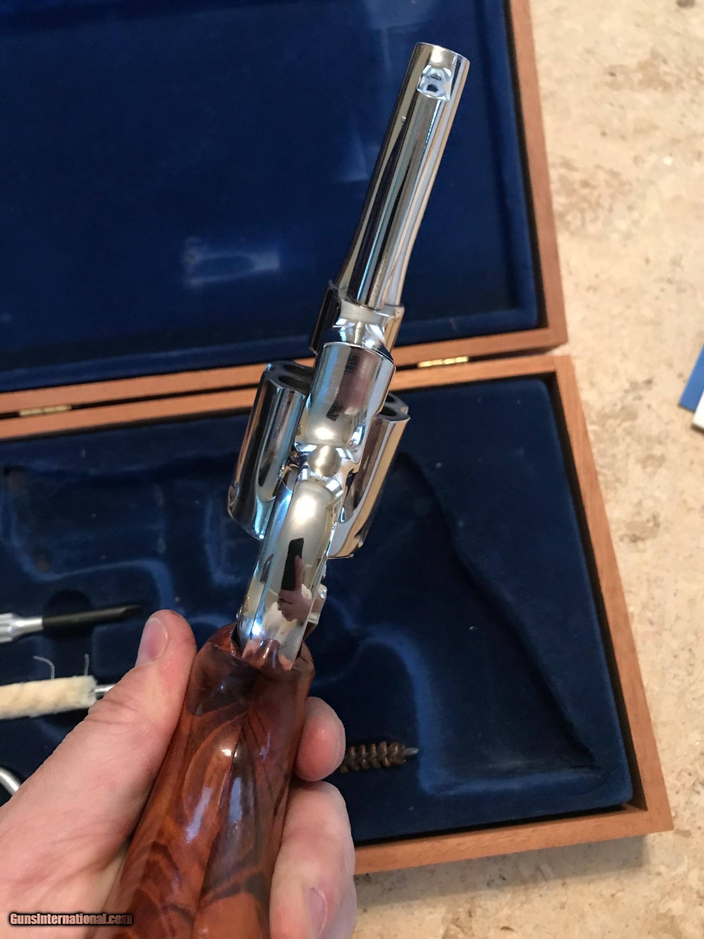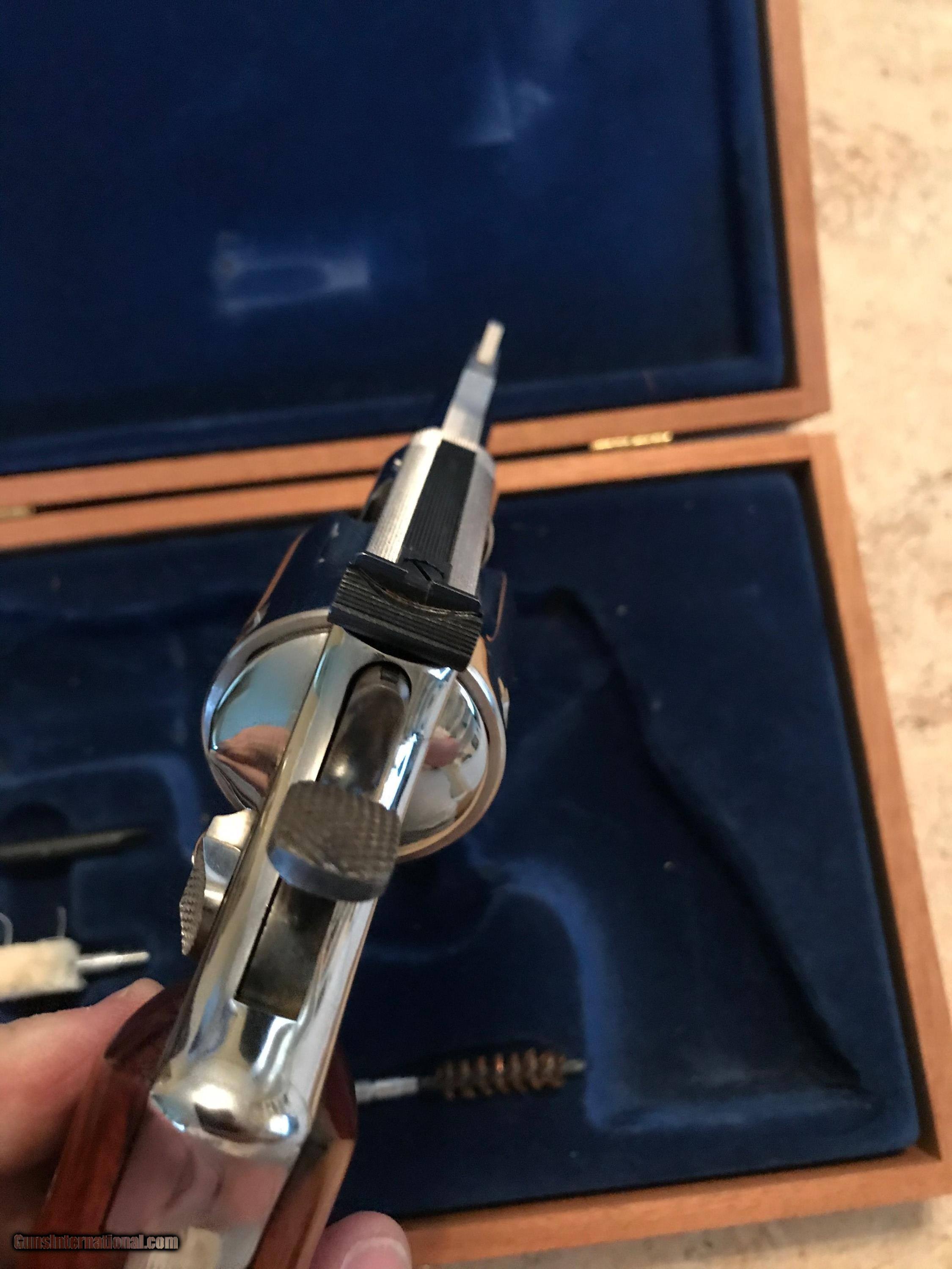 Description: Wow! This is one of the most beautiful revolvers I've ever seen. This 27 has a pinned barrel and recessed cylinder. It has gorgeous nickel finish. Smooth target handles. Case hardened, target hammer and trigger. Target sights. Original wood box, papers, and tools. THE COMPLETE PACKAGE! Please email with questions. Shipping included. Cards add 3% SOLD Manufacturer: Smith and Wesson Model: 27-2 Barrel Length: 3 1/2 inches Condition: Used Metal Condition: Excellent Wood Condition: Excellent Bore Condition: Excellent Action: Double Triggers: Target Finish: Nickel Sights: Target Case: Yes Item Location: 37075 |