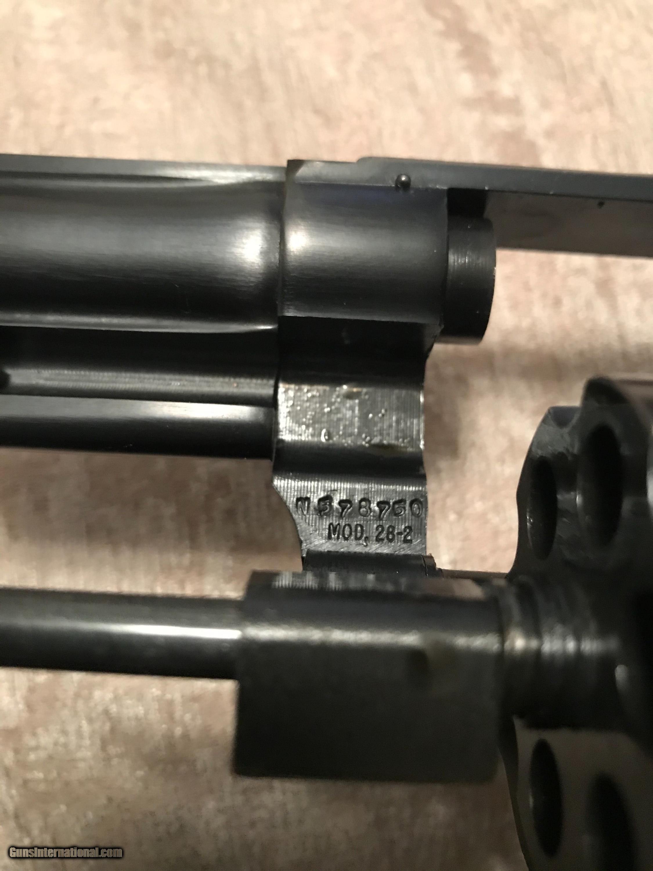 Description: This is a very nice highway patrolman 28. N prefix, Dash 2 is pinned barrel and recessed cylinder. Bluing is beautiful, no rust. Comes with a non original set of target grips and a non original 28-2 smith and Wesson box. Nice gun. Please email with questions. Shipping included. Cards add 3%. SOLD Manufacturer: Smith and Wesson Model: 28-2 Barrel Length: 6 Bore: Excellent Condition: Used Metal Condition: Excellent Wood Condition: Excellent Bore Condition: Excellent Action: Double Finish: Blue Sights: Targets Item Location: 37075 |