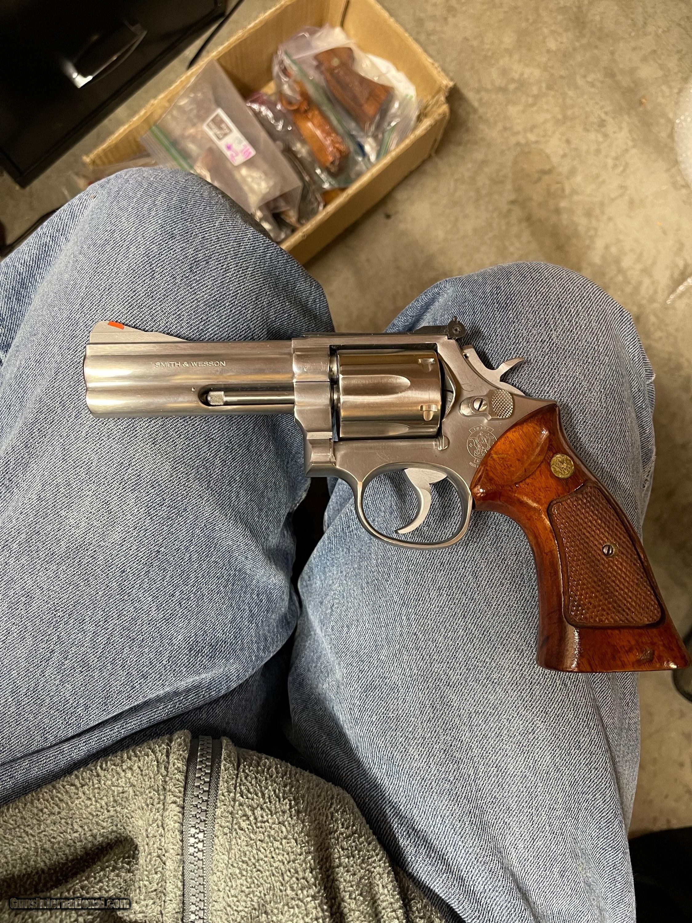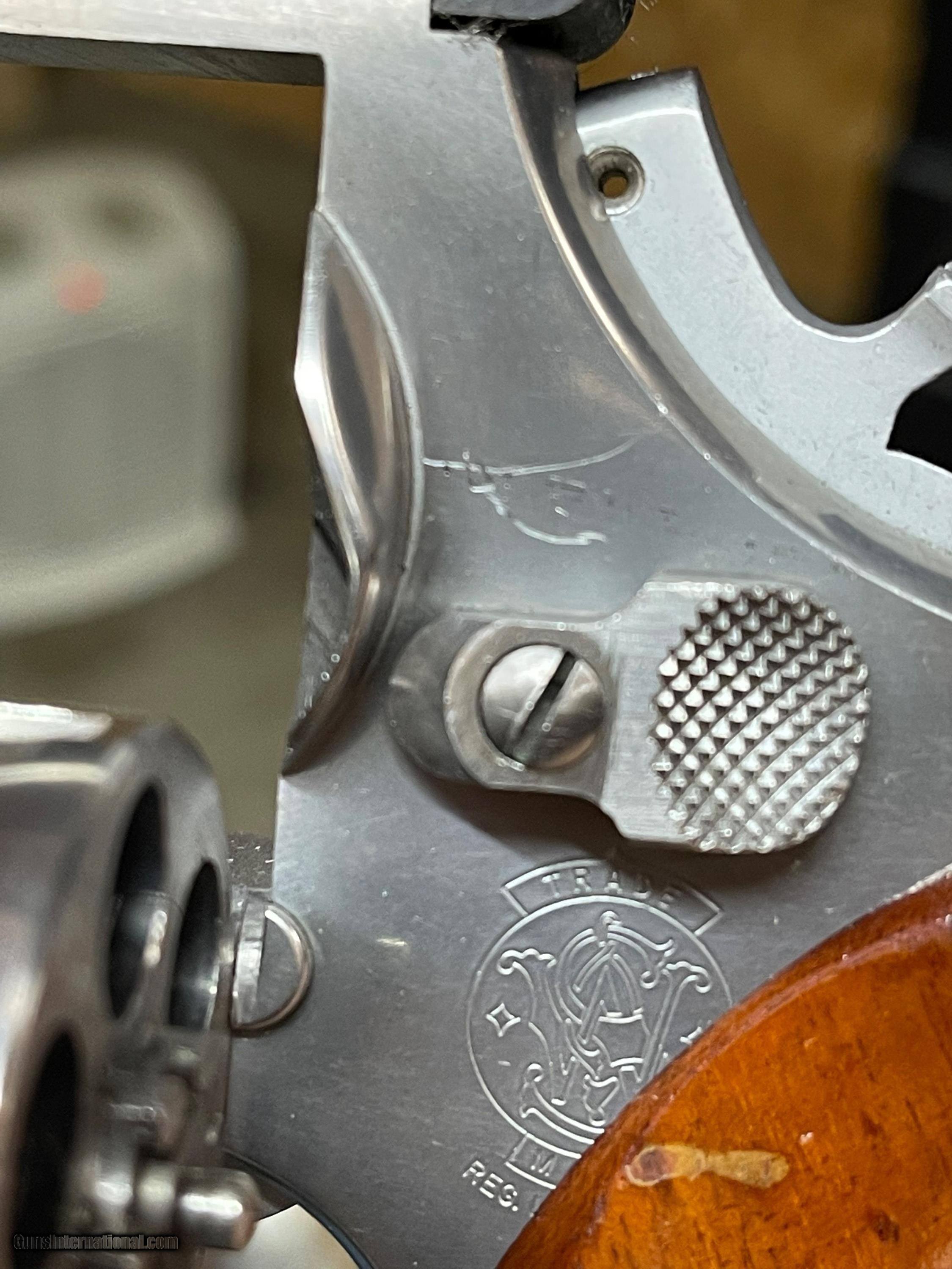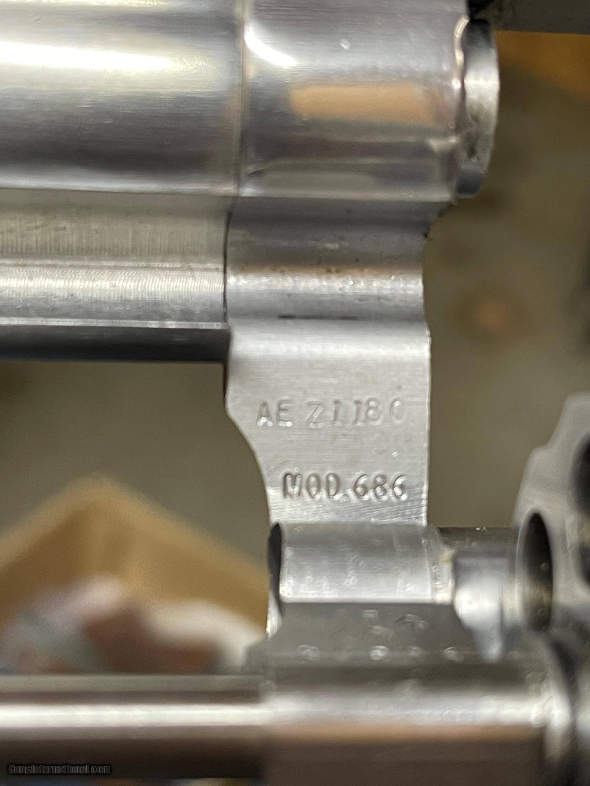Description: Another fine 4 inch 686. This no dash gun features white outline rear sight and red ramp front sight, stainless finish, and wood target grips. Many of these no dash guns were sent back to the factory for a flaw early in the release of the gun. Thus, the infamous m stamping in the yoke. This one has not been modified. No box. Please email with questions. Shipping included (west coast add $75). Venmo and cash app accepted. SOLD Manufacturer: Smith and Wesson Model: 686 Barrel Length: 4 inch Condition: Used Metal Condition: Excellent Wood Condition: Very good Bore Condition: Excellent Action: Sa, da Finish: Stainless Sights: Target Item Location: 37075 |
