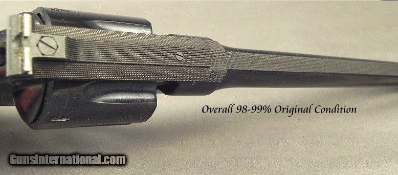Description: S 125945, Smith & Wesson 357 Magnum Pre-Model 27, It was shipped from the factory on November 23, 1954 to Evaluators Limited in Quantico, Virginia, 8 3/8" pinned barrel with a rib, Micrometer adjustable rear sight, Ramped blade front sight, Serrated top strap & rib, Case hardened trigger and hammer, N frame, Serial numbers match on the cylinder and ejector rod housing, This piece remains original, The original high gloss barrel blue remains at 99%, The frame and cylinder blue at 98%, The grips remain at 99%, The bore is excellent plus. It comes with a period blue and gold factory box. These were well made and well finished by S&W in the late 1940's to the late 1950's. They were offered from 1947 to 1957. SOLD Curio/Relic: Yes Handgun Caliber: .357 Magnum |