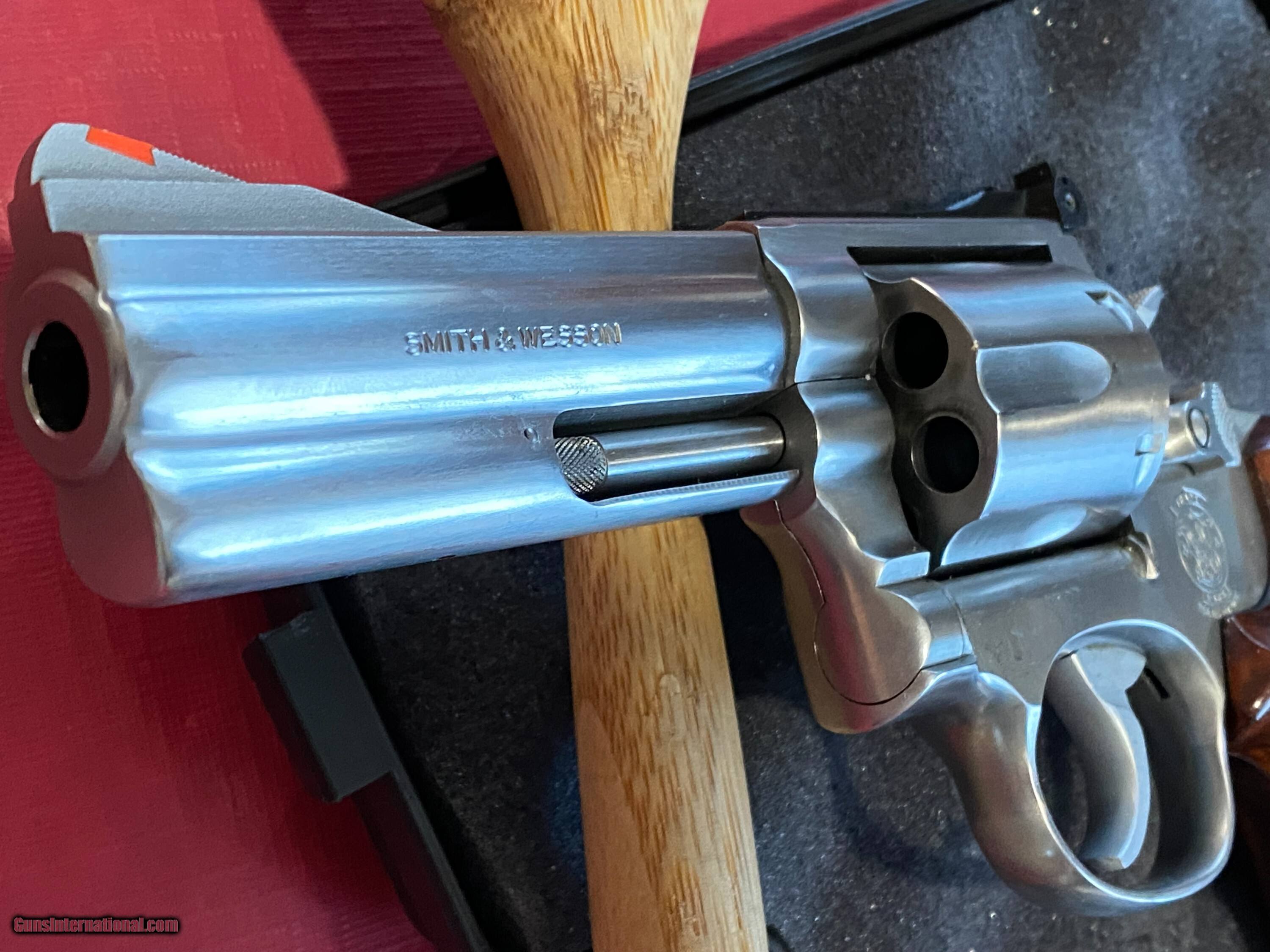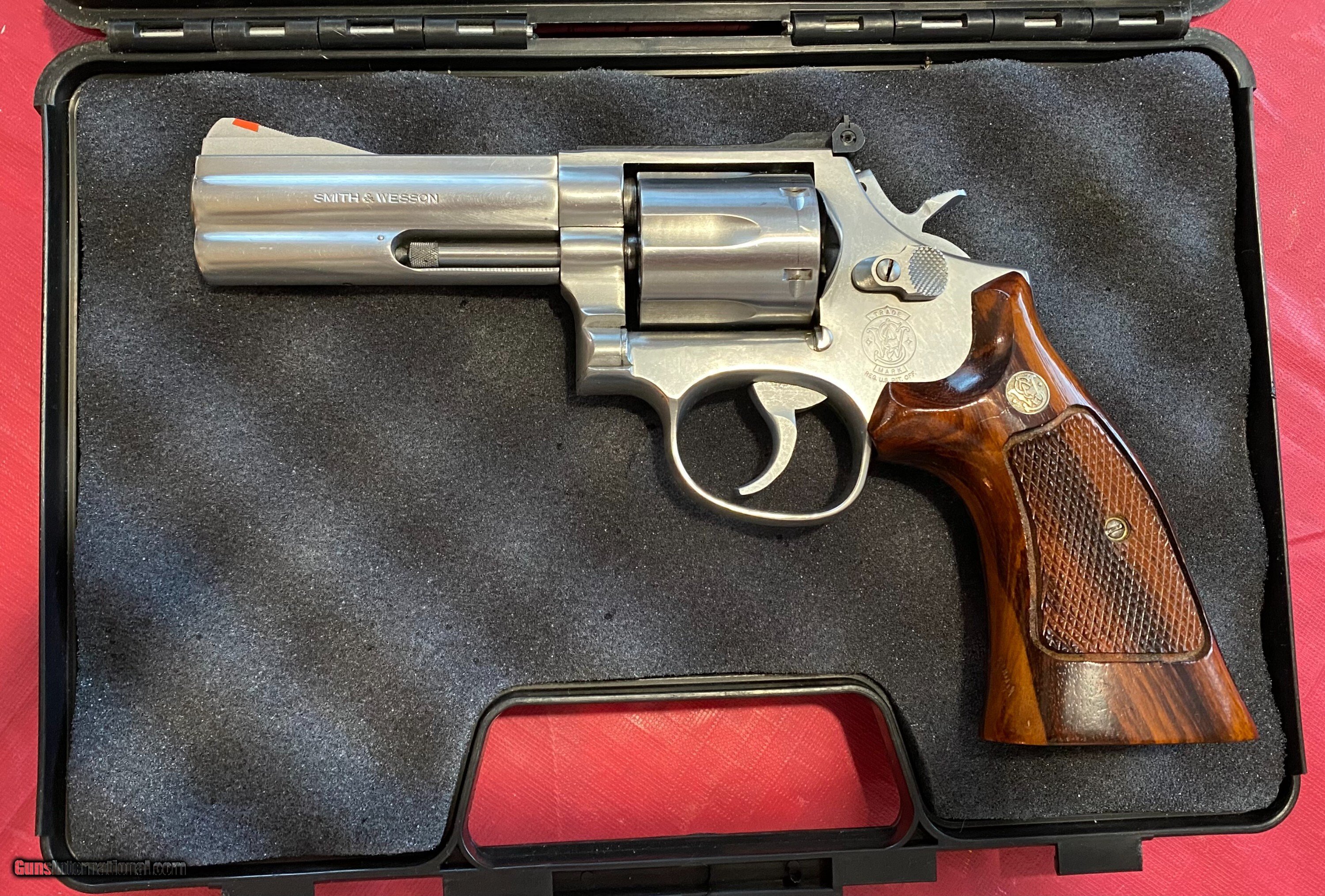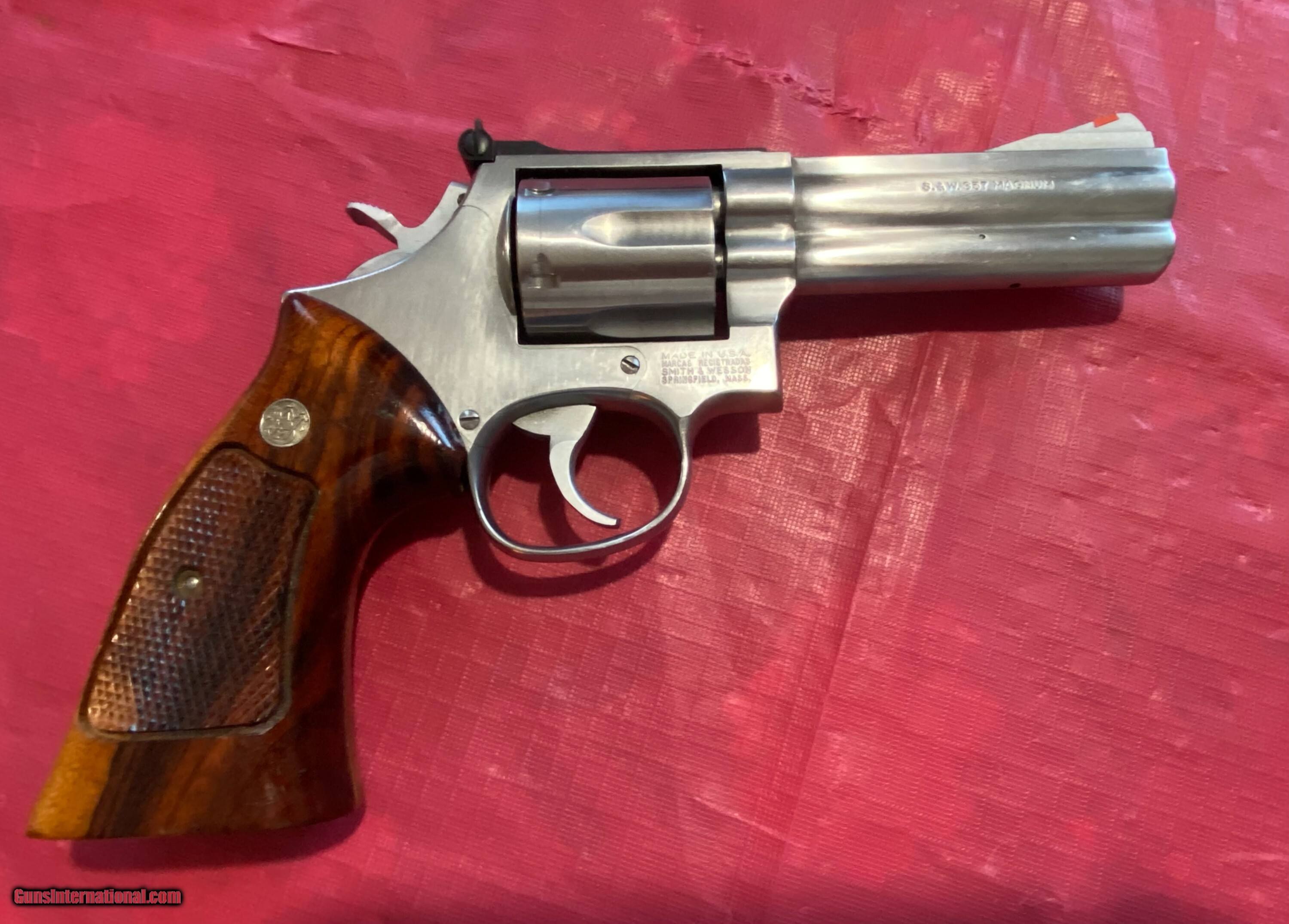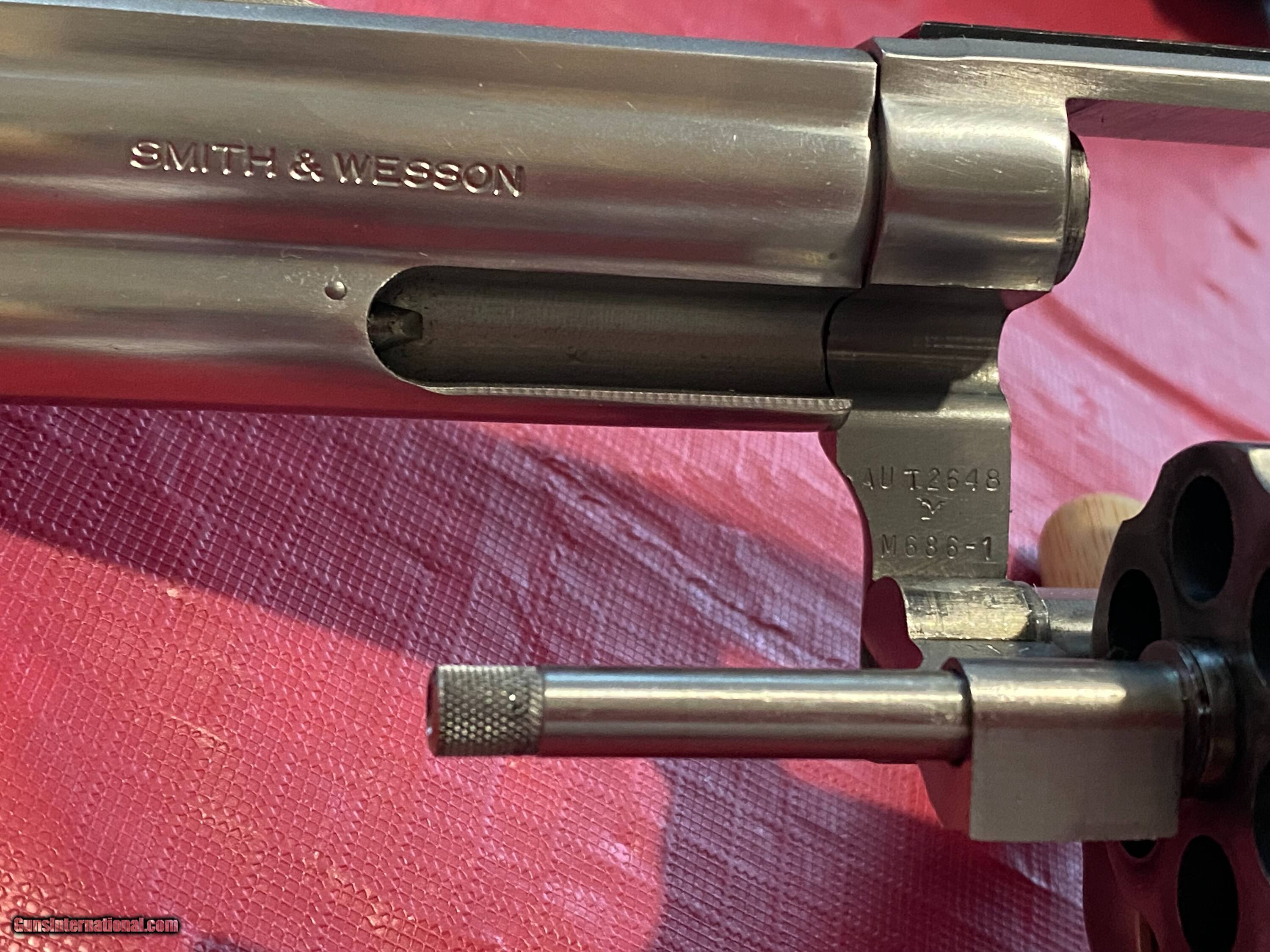 Description: Smith & Wesson 686-1 (M), 4" barrel, stainless .357 revolver. Shoots .38 Special also. No mims, no lock. Gun has "M" stamping to address recall to upgrade the firing pin and cylinder bushing. The factory tuned the gun and gave it an "E", excellent rating on paperwork. Gun is s square butt, which is no longer made by SW. Gun is in excellent condition. Action is crisp and tight. Gun has not been used much. No marks, damages, nicks or dents. I believe these are original wooden, target grips. Comes with gun case, not original. Buyer pays actual shipping cost. $40.00 is estimate only. You'll be pleased with this gun. I've owned gun for many years. Feel free to call me if you have questions. Thanks for looking. Jenno 520 255 4242 Handgun Caliber: .357 Magnum Manufacturer: Smith & Wesson Model: 686-1 Serial Number: AUT2648 Barrel Length: 4 Chambers: 6 Condition: excellent Metal Condition: excellent Wood Condition: excellent Bore Condition: excellent Manufacture Date: 1986 Case: yes Price: $969.00 Pay with