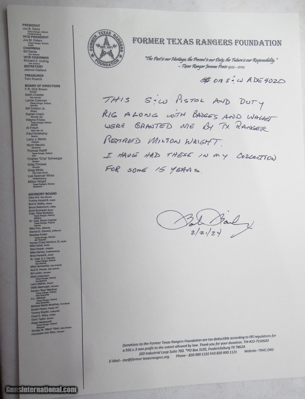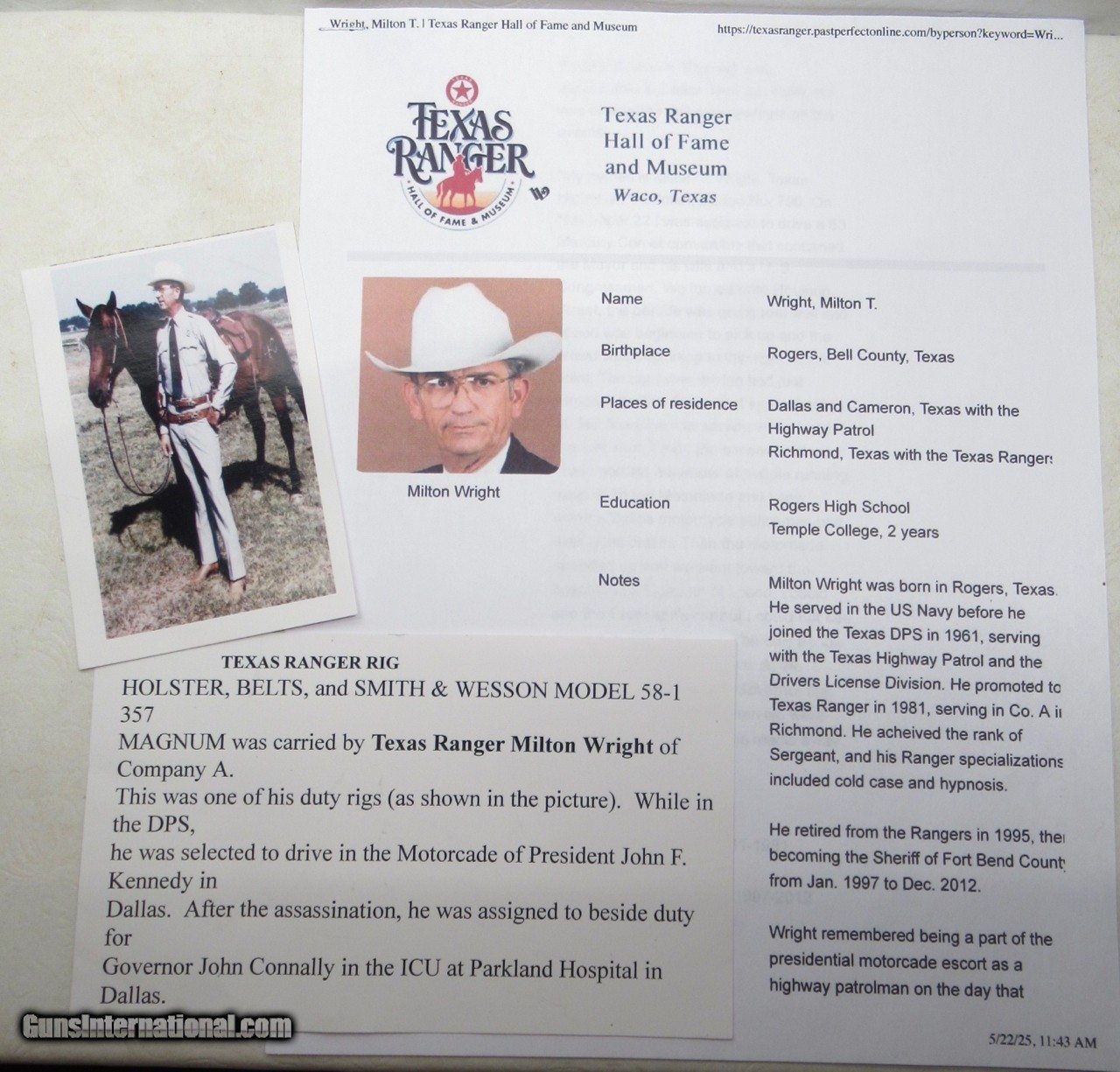 Description: Smith & Wesson .357 Magnum Revolver; Serial No. ADE4020; Model 68-1 with Factory Over Stamp 58-1 (See Supica Page 210); 4” Barrel with Nickel Finish; Near Perfect Condition; Formerly Owned by Texas Ranger Milton T. Wright – Extensive Documentation and Photo of Ranger Wright Wearing Gun and Rig Included; Much Internet Information Available; Wright was also Sheriff of Fort Bend County, Texas 1997 to 2012 and was Selected as a Driver in the John F. Kennedy Motorcade During the Assassination in Dallas, Texas; See All Photos for Condition; No Texts; Call (254)541-5765 or Email Only; PERSONAL PROPERTY of Harold Wieser; NOTICE: We Do Not Do Any Consignments - All Items Listed are Owned by Us - NO SALES to New Jersey or New York City - Antiques Only to Massachusetts and California; NOTE: All Modern Firearms Must Go to FFL Dealer who will Accept From Individual with Texas Driver License; Price: $1,975 + $50 S&H; Payment Address: Harold Wieser - 1466 U.S. Hwy 77 - Rosebud, TX 76570; SEND PAYMENTS VIA USPS PRIORITY MAIL; BEWARE of SCAMS!!! - DO NOT SEND MONEY or CORRESPONDENTS ELECTRONICALLY UNLESS YOU HAVE SPOKEN to HAROLD WIESER FIRST! (254)541-5765 Manufacturer: Smith & Wesson Model: 68-1 / 58-1 Serial Number: ADE4020 Price: $1,975.00 Contact Seller |