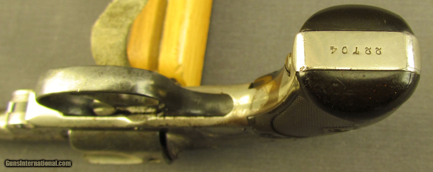 Description: S# 22704, 38 S&W, 3 1/4 inch barrel, bright very good bore with light erosion. This model was built from 1887 to 1890. This one remains in good condition with about 60% nickel showing most loss on cylinder and barrel. Trigger still shows strong case colors on sides and trigger guard retains about 60% blue. Right grip shows wear with checkered area worn near flat, left grip is from a different gun, it shows light wear, neither one is numbered. Frame, barrel and cylinder show matching numbers. Action works well. Antique. SOLD Antique: Yes Manufacturer: S&W Model: Safety Hammerless Serial Number: 22704 Caliber Info: .38 S&W Gauge Info: .38 S&W |