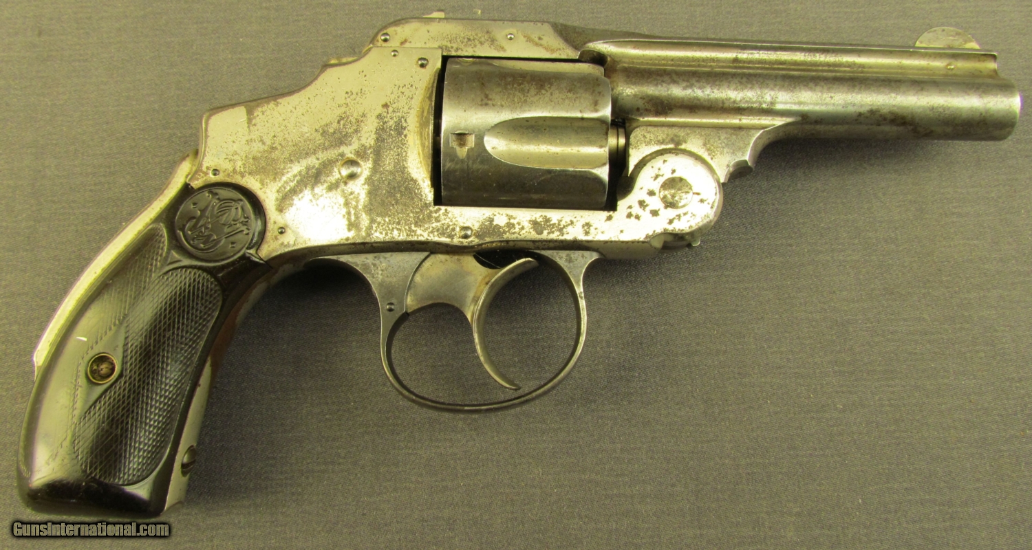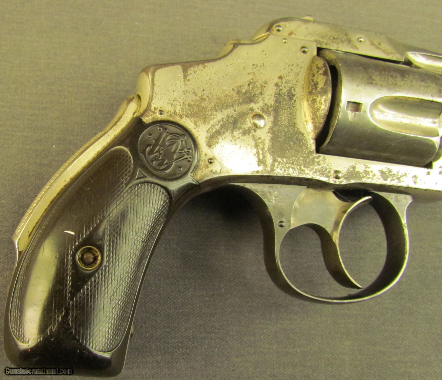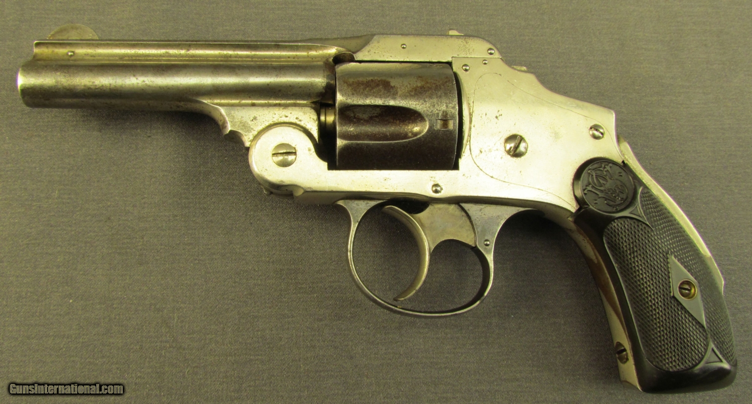 Description: S# 22704, 38 S&W, 3 1/4 inch barrel, bright very good bore with light erosion. This model was built from 1887 to 1890. This one remains in good condition with about 60% nickel showing most loss on cylinder and barrel. Trigger still shows strong case colors on sides and trigger guard retains about 60% blue. Right grip shows wear with checkered area worn near flat, left grip is from a different gun, it shows light wear, neither one is numbered. Frame, barrel and cylinder show matching numbers. Action works well. Antique. SOLD Antique: Yes Manufacturer: S&W Model: Safety Hammerless Serial Number: 22704 Caliber Info: .38 S&W Gauge Info: .38 S&W |