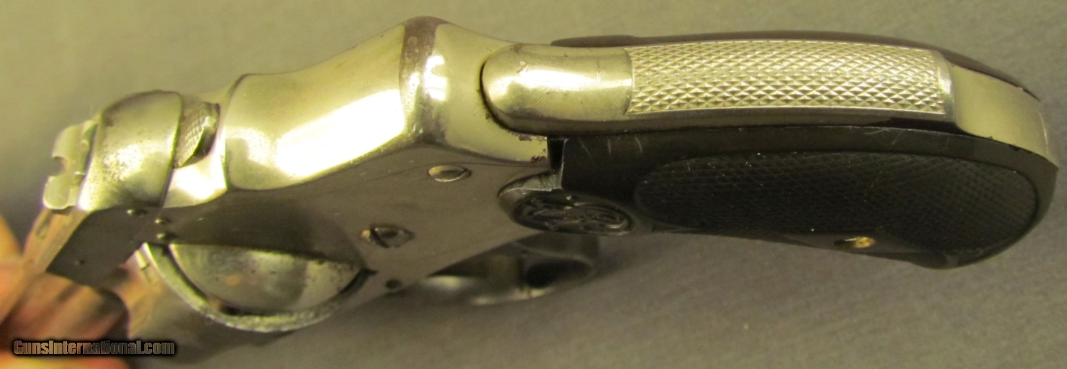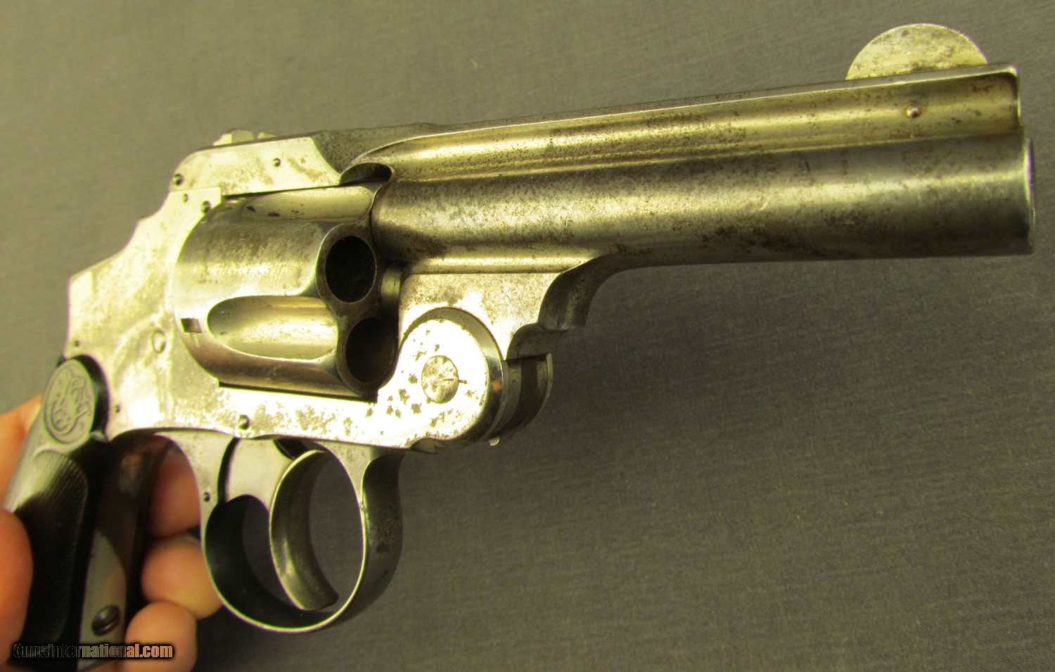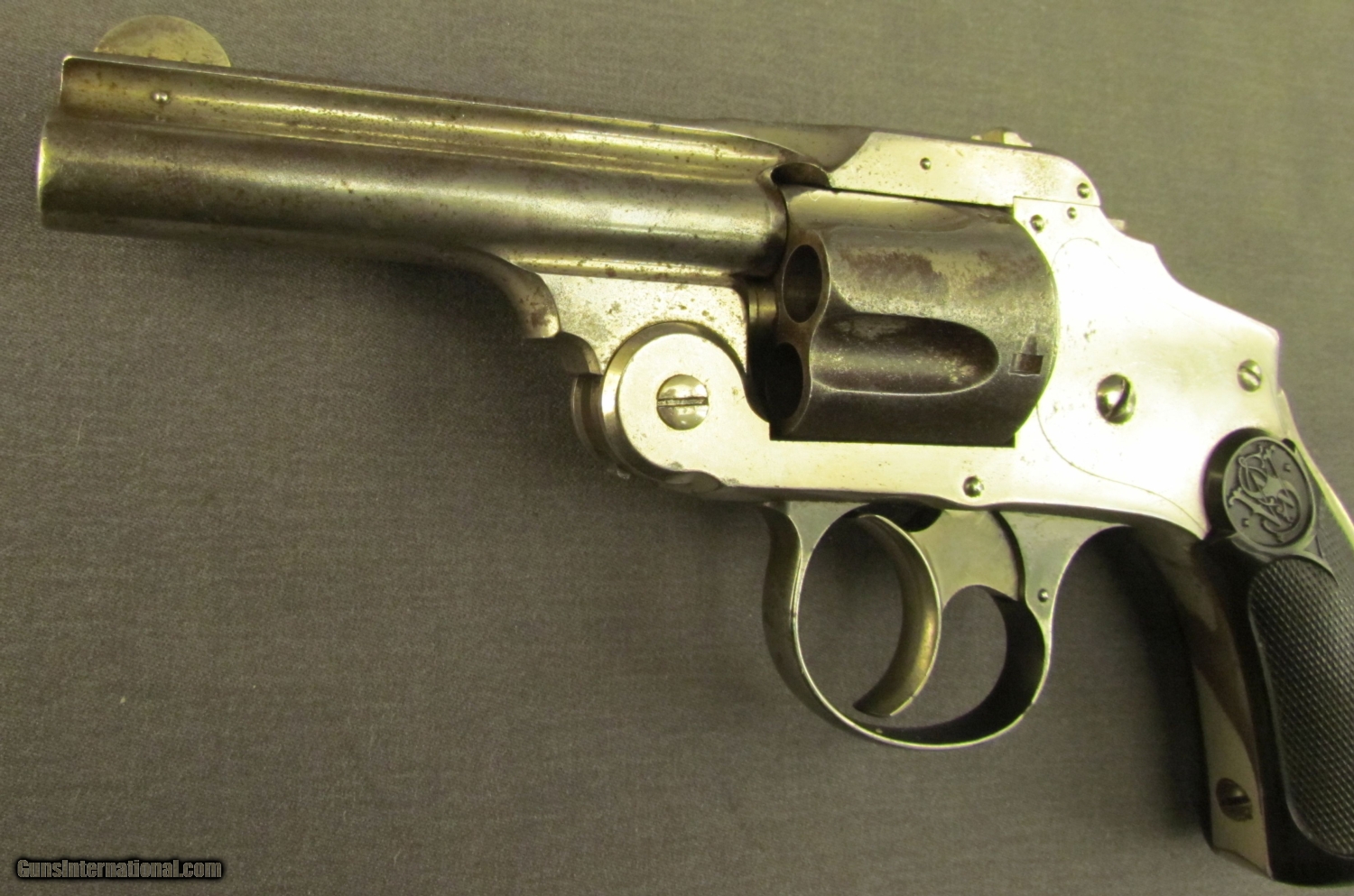 Description: S# 22704, 38 S&W, 3 1/4 inch barrel, bright very good bore with light erosion. This model was built from 1887 to 1890. This one remains in good condition with about 60% nickel showing most loss on cylinder and barrel. Trigger still shows strong case colors on sides and trigger guard retains about 60% blue. Right grip shows wear with checkered area worn near flat, left grip is from a different gun, it shows light wear, neither one is numbered. Frame, barrel and cylinder show matching numbers. Action works well. Antique. SOLD Antique: Yes Manufacturer: S&W Model: Safety Hammerless Serial Number: 22704 Caliber Info: .38 S&W Gauge Info: .38 S&W |