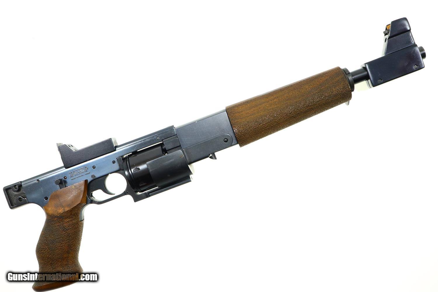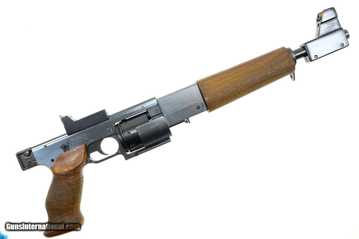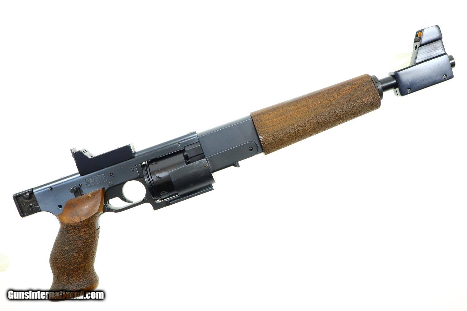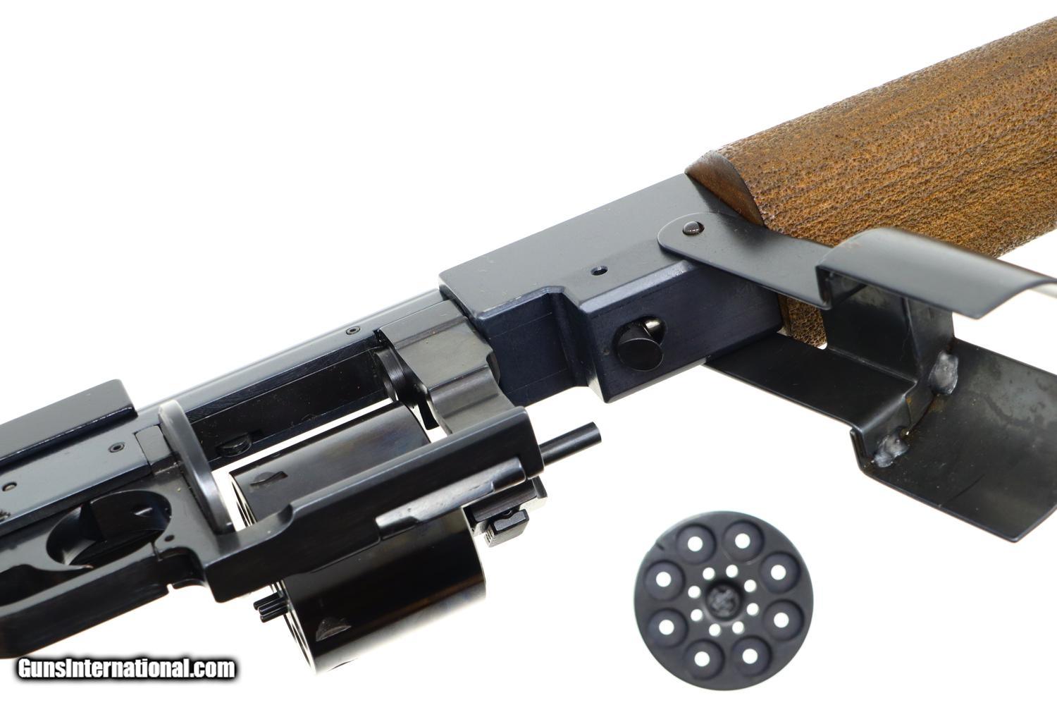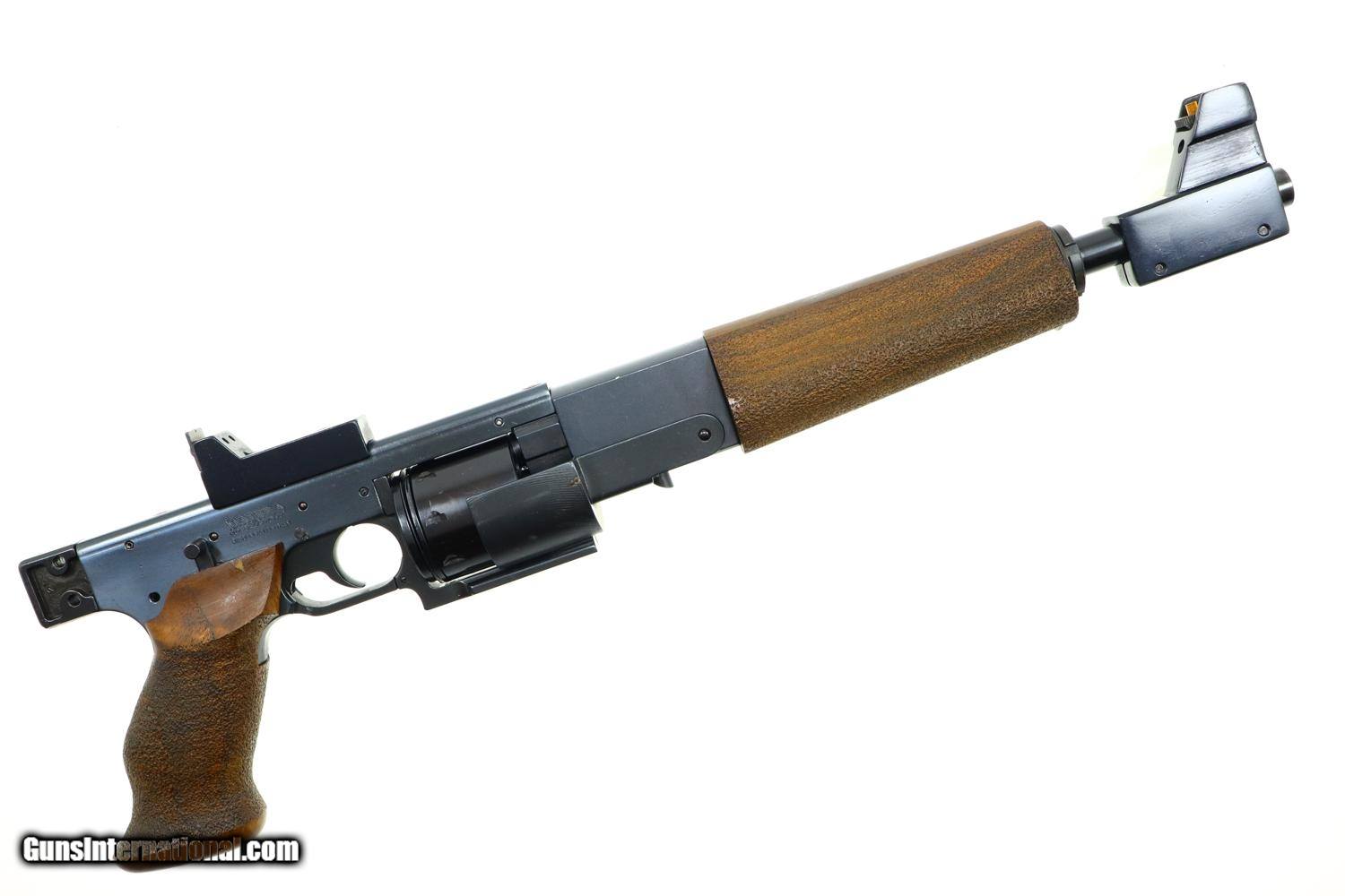 Crisp 99% original finish, with a few handling marks. Comparable condition wood furniture. Mirror bore. Perfect manual mechanics. A REALLY crazy looking and futuristic revolver….. Only from Mateba!