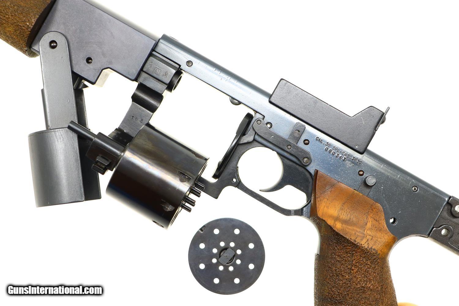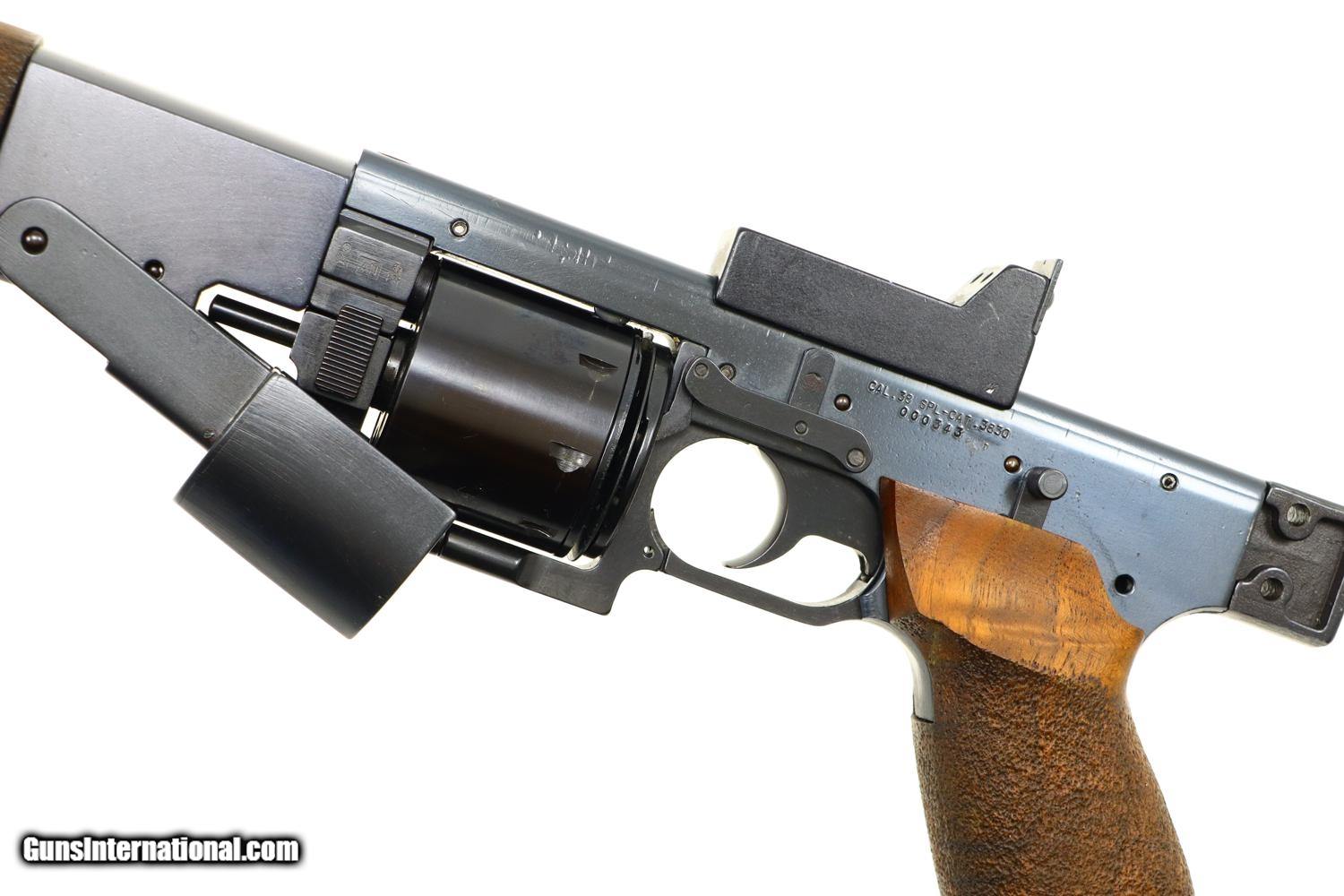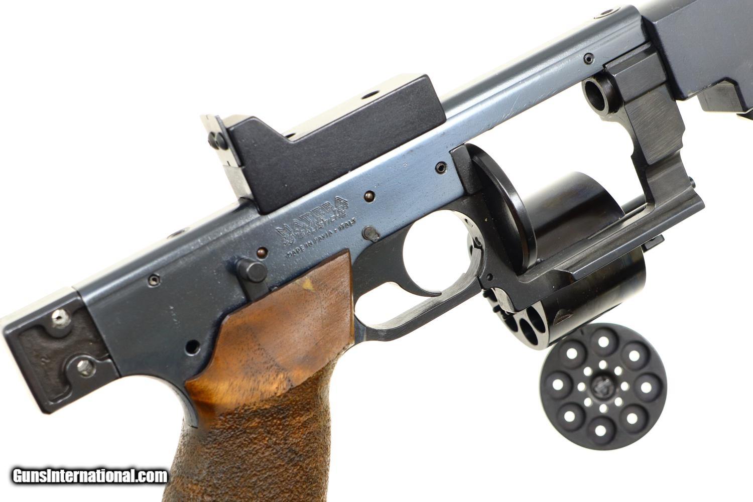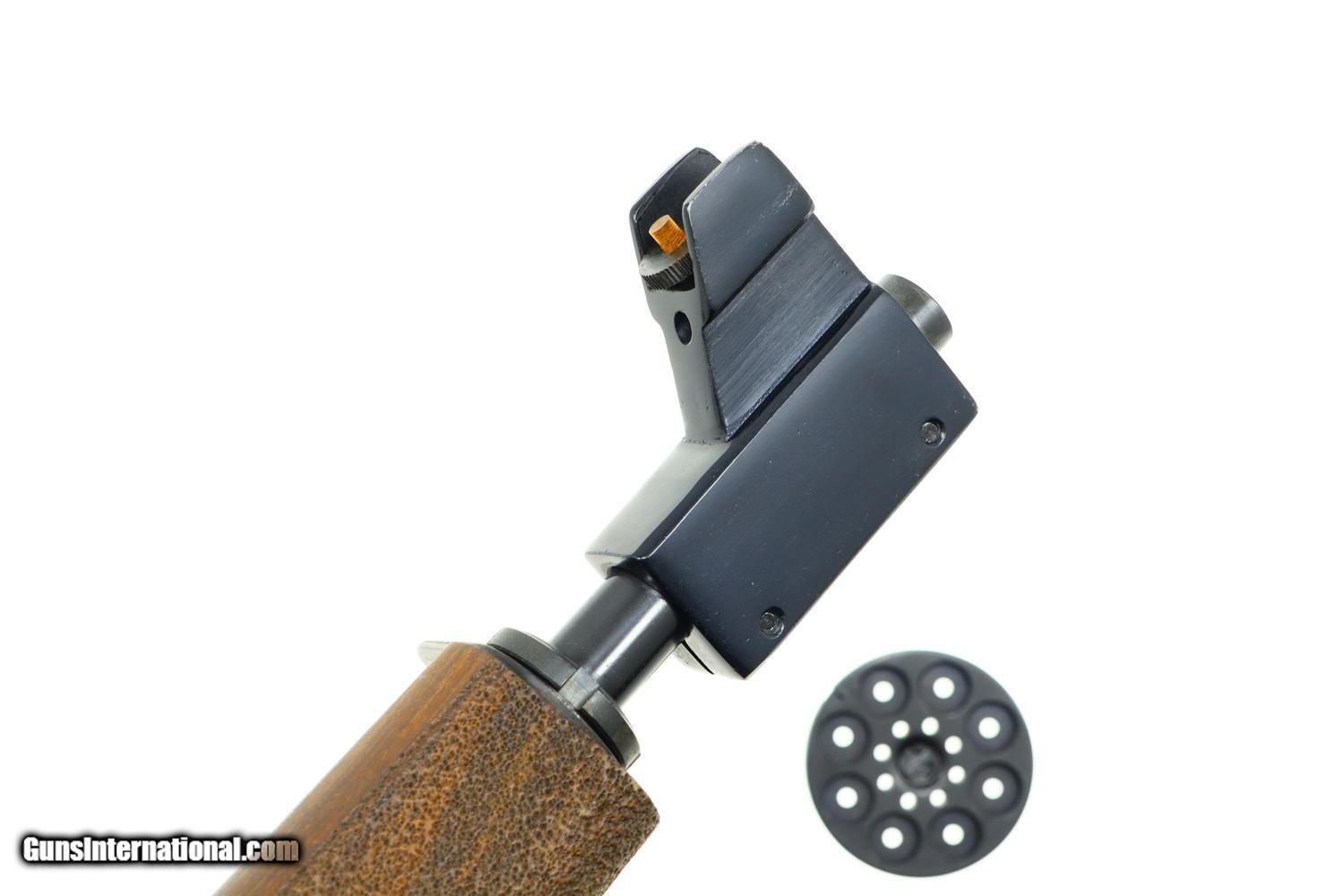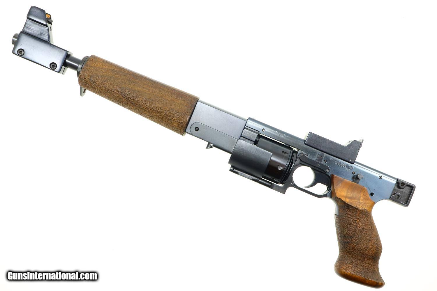 Crisp 99% original finish, with a few handling marks. Comparable condition wood furniture. Mirror bore. Perfect manual mechanics. A REALLY crazy looking and futuristic revolver….. Only from Mateba!