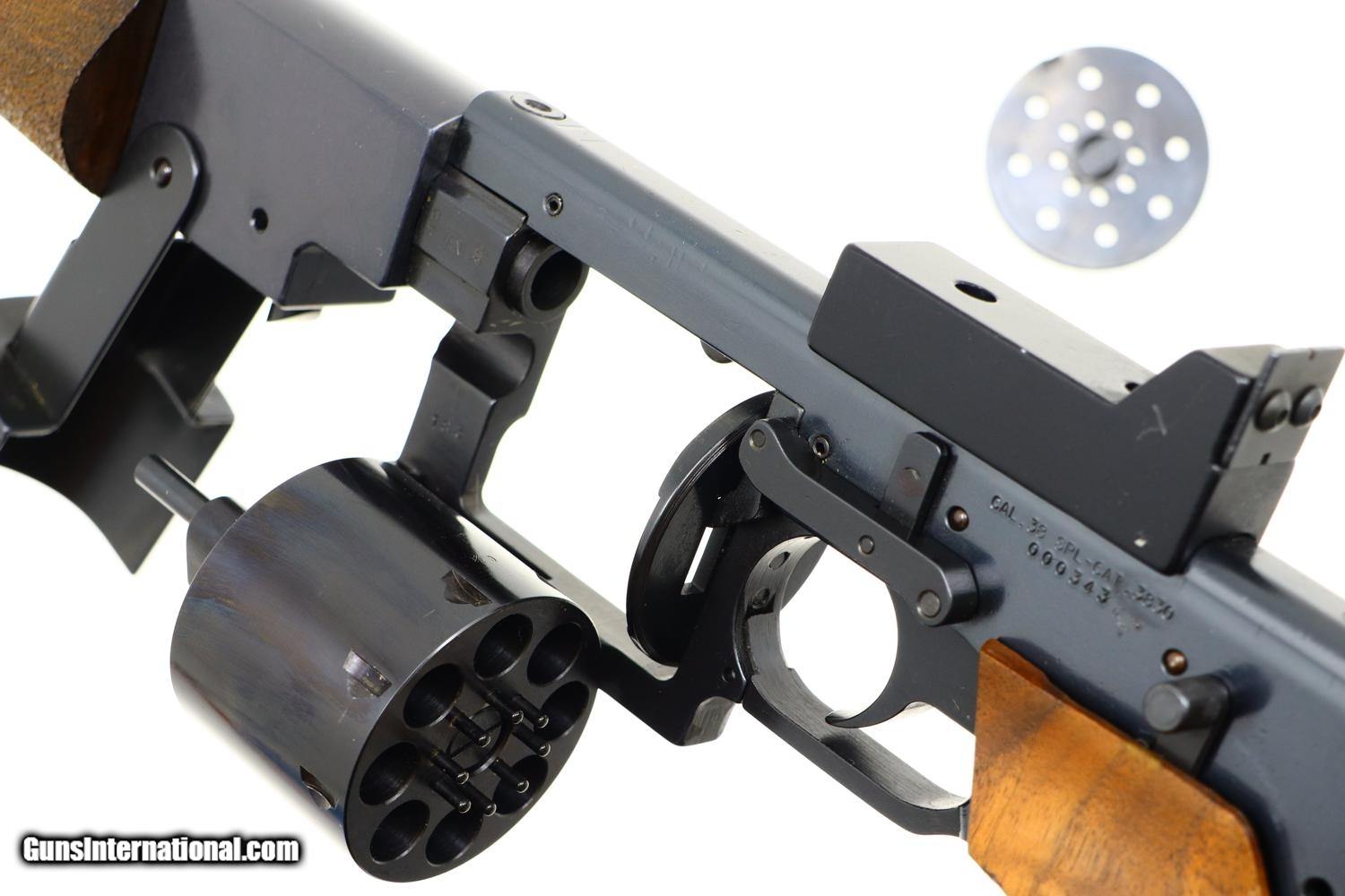 Description: Synopsis: Mateba, MTR-8, Italian Revolver, .38 special, 343, I-1162 Description: Phenomenal Mateba MTR-8 Revolver, scarcer than the 6-Unica, with 11-7/8” barrel, speed loading disc, etc. Standard configuration with separable front sight that elevates a translucent red post with serrated knob. Windage adjustable rear sight blade secured with two Allen head screws. SA/DA mechanism with cocking lever for SA above left side of grip. Plunger retained cylinder shroud that rotates down to access the cylinder release lever. Speed loading disc separates to insert loaded cartridges then locks in place before positioning on cylinder pins. Walnut forend behind rotatable swivel and single piece grip with textured surfaces. Condition: Crisp 99% original finish, with a few handling marks. Comparable condition wood furniture. Mirror bore. Perfect manual mechanics. A REALLY crazy looking and futuristic revolver….. Only from Mateba! SOLD Manufacturer: Mateba Model: MTR-8 Serial Number: 343 Caliber Info: .38 Special Condition: 0.99 |