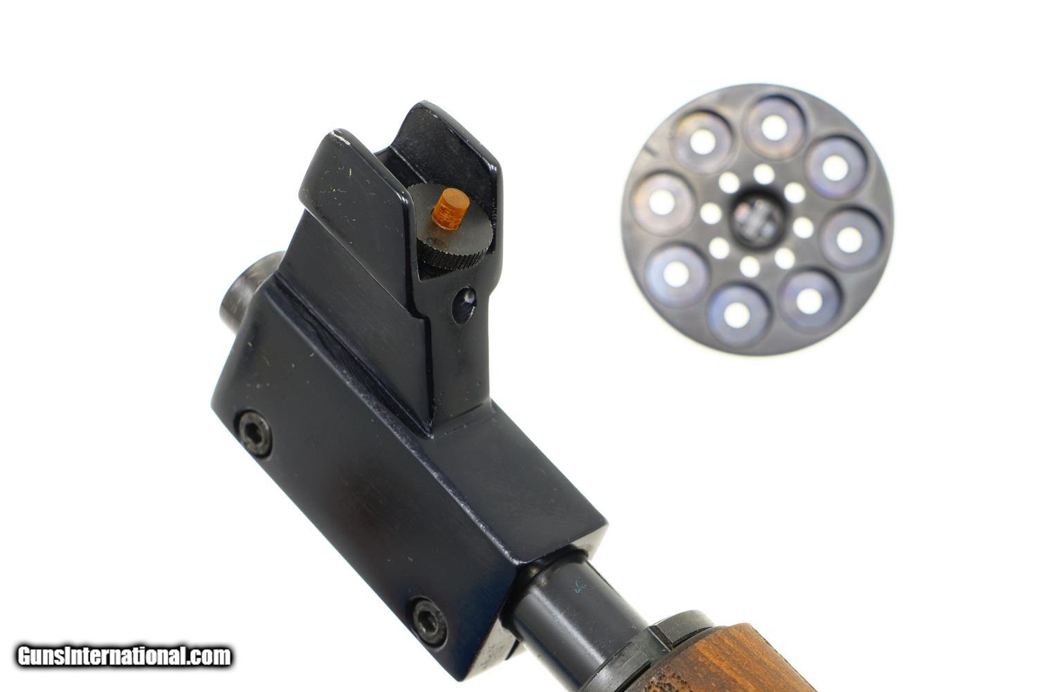 Phenomenal Mateba MTR-8 Revolver, scarcer than the 6-Unica, with 11-7/8” barrel, speed loading disc, etc. Standard configuration with separable front sight that elevates a translucent red post with serrated knob. Windage adjustable rear sight blade secured with two Allen head screws. SA/DA mechanism with cocking lever for SA above left side of grip. Plunger retained cylinder shroud that rotates down to access the cylinder release lever. Speed loading disc separates to insert loaded cartridges then locks in place before positioning on cylinder pins. Walnut forend behind rotatable swivel and single piece grip with textured surfaces.