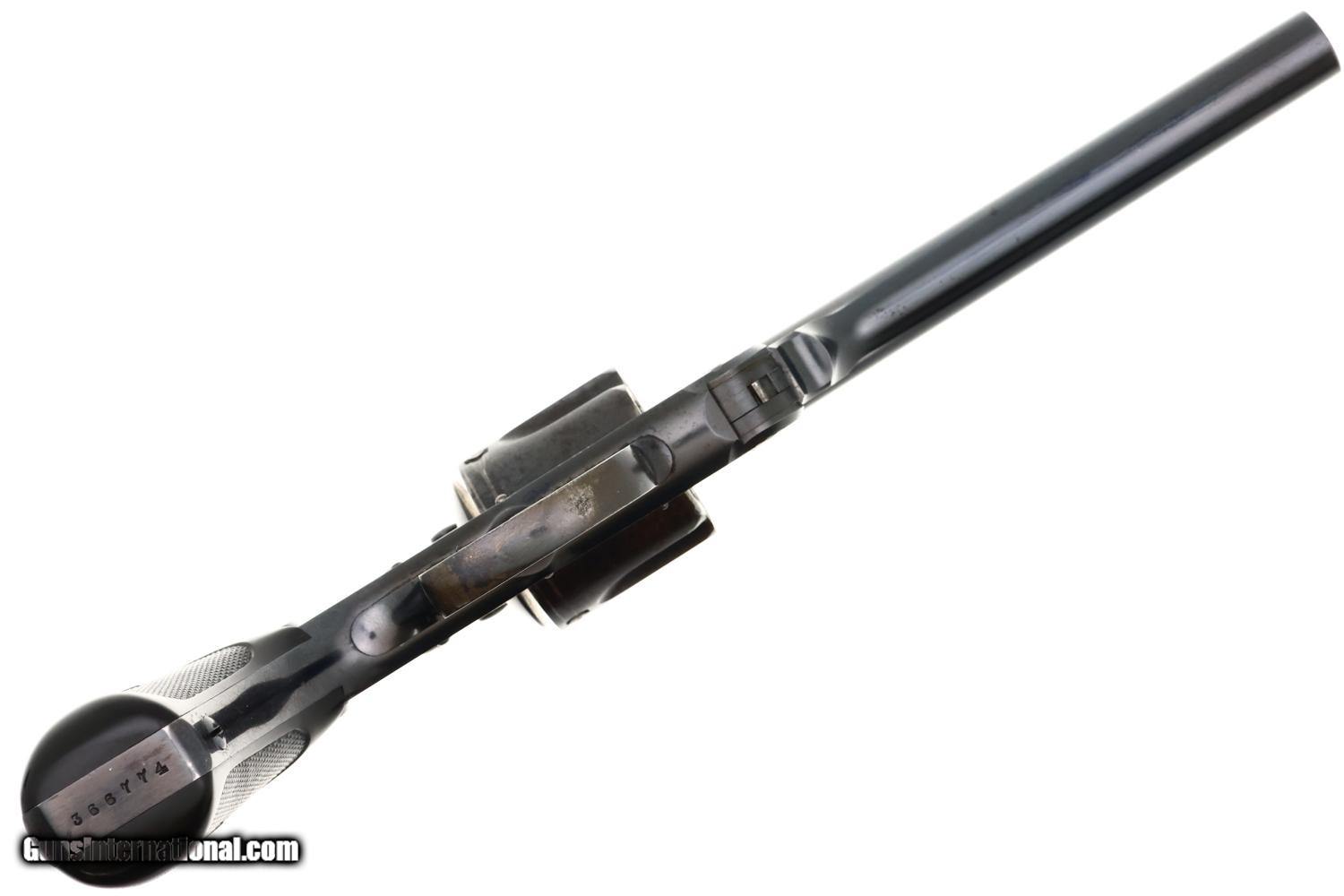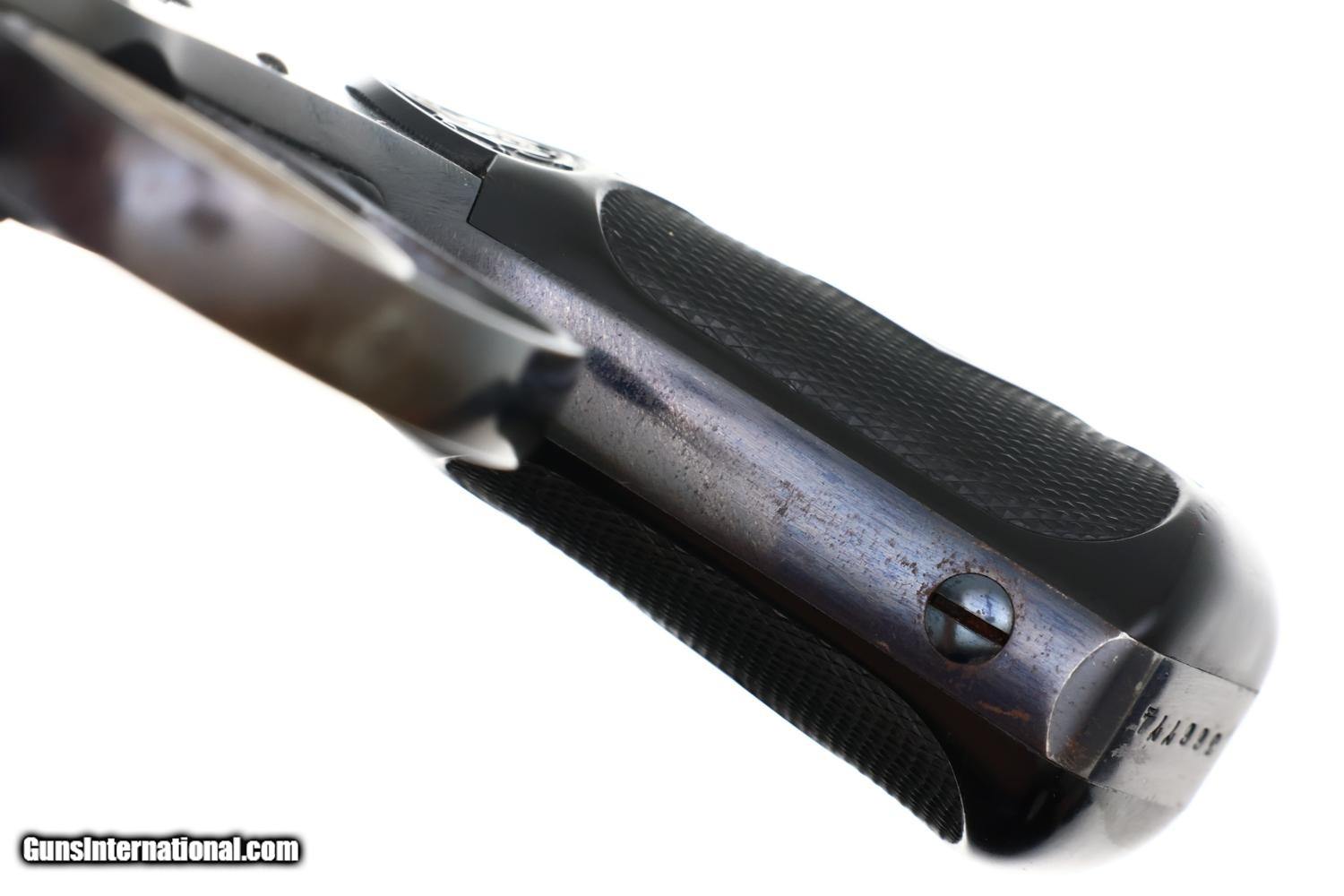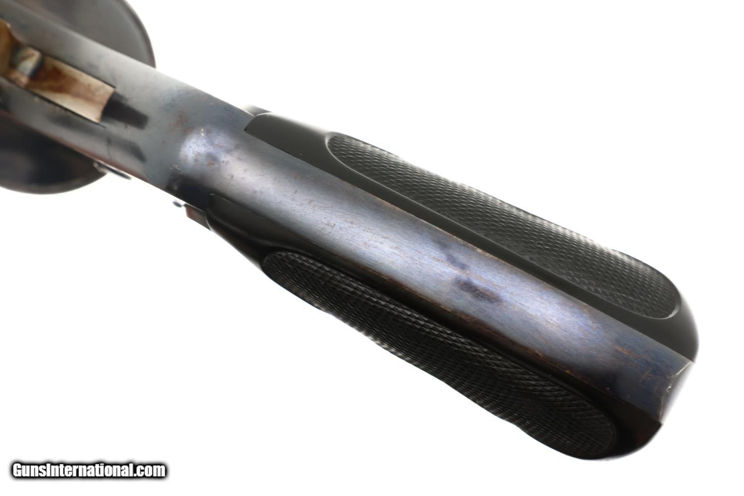 Description: Synopsis: Classic Smith & Wesson .38 Double Action Fourth Model Revolver, made 1895-1907, cal. .38 S&W, an evolution of S&W's first successful double-action revolvers, this original finish example with the scarce 5-inch barrel! ANTIQUE!!! Description: Early Smith & Wesson .38 Double Action Top-Break (4th Model) revolver with relatively scarce 5" barrel, SN: 366774, manufactured circa 1895–1909 in serial range 322,701-539,000. Chambered for the .38 S&W cartridge, this revolver features Smith & Wesson’s automatic-ejecting top-break action, five-shot cylinder, and standard SA/DA lockwork of the period. The barrel rib is marked “SMITH & WESSON SPRINGFIELD MASS. U.S.A.” with patent markings. SN: 366774 is stamped on the butt of the grip, repeated on the rear face of the cylinder, and under unlocking latch. Fitted with hard rubber grips, the SN scribed inside the right grip, though last digit may be a "3" or "7". According to ATF, the last SN that qualifies as an antique is: 382,021, this revolver easily qualifying. Condition: VG original factory blue with sharp edge wear, handling marks, and freckling on the cylinder, consistent with a revolver that has been carried and seen moderate use. Near excellent color case hardening on the hammer and trigger with grips having slightly blunted checkering but no splits or losses. Bright bore with sharp rifling. Slow single-action cocking against mild resistance shows two cylinders index properly, three requiring a slight nudge. Manufacturer: S&W Model: .38 DA Revolver, Fourth Model Serial Number: 366774 Caliber Info: 0.38 Condition: VG Price: $795.00 Contact Seller |