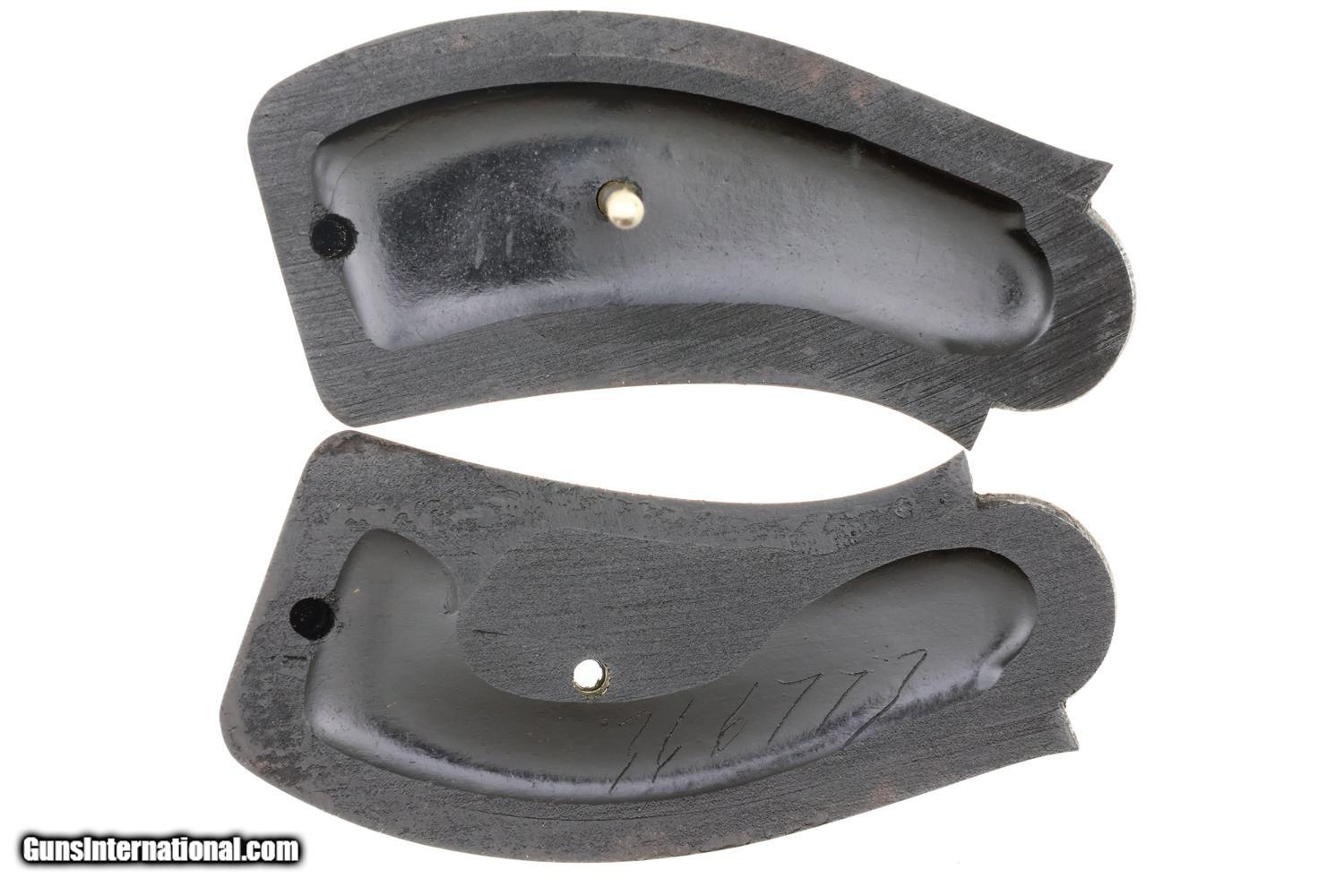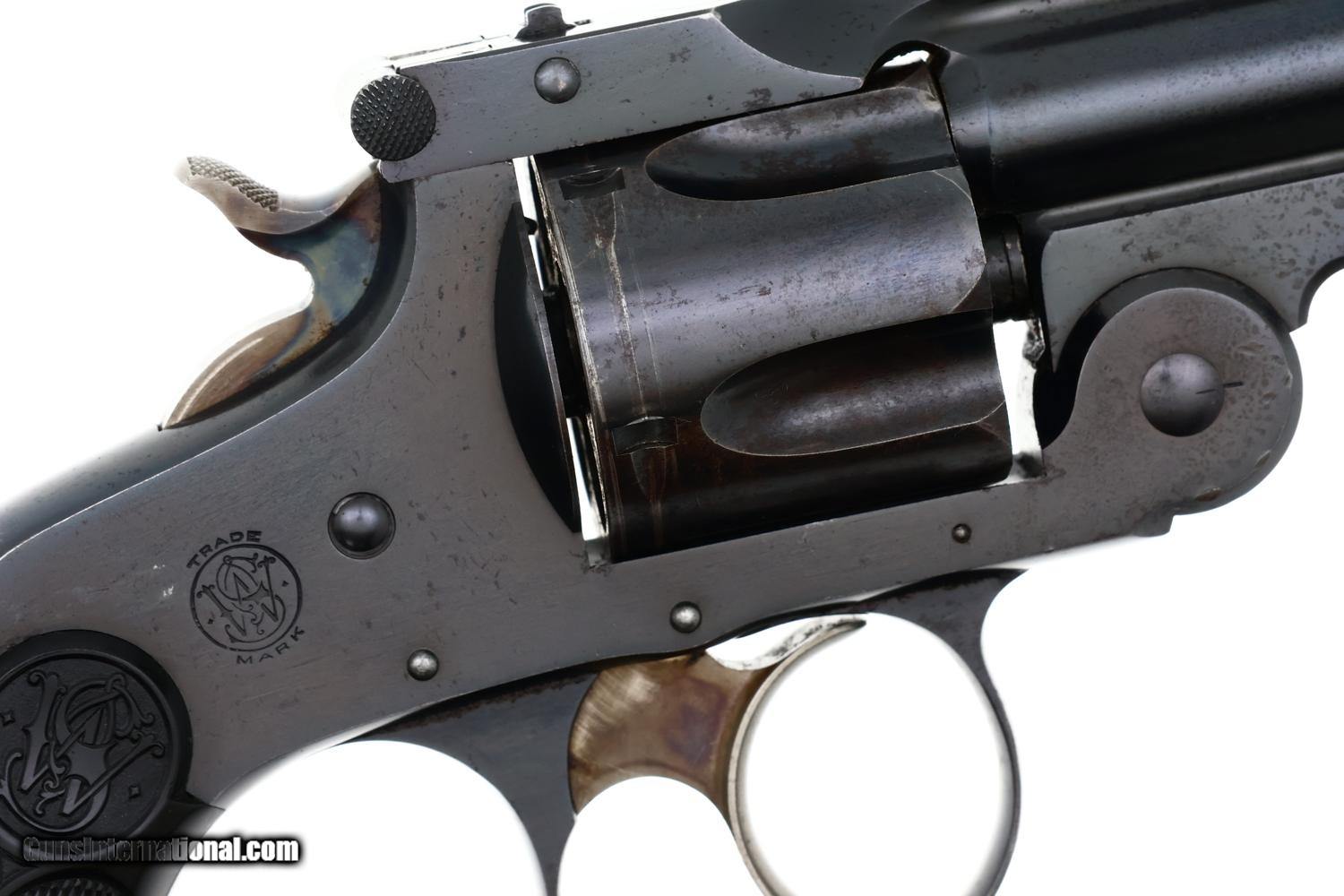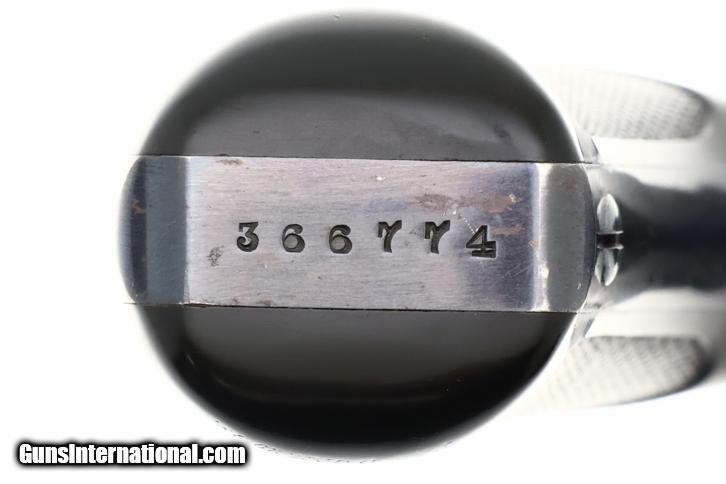 Description: Synopsis: Classic Smith & Wesson .38 Double Action Fourth Model Revolver, made 1895-1907, cal. .38 S&W, an evolution of S&W's first successful double-action revolvers, this original finish example with the scarce 5-inch barrel! ANTIQUE!!! Description: Early Smith & Wesson .38 Double Action Top-Break (4th Model) revolver with relatively scarce 5" barrel, SN: 366774, manufactured circa 1895–1909 in serial range 322,701-539,000. Chambered for the .38 S&W cartridge, this revolver features Smith & Wesson’s automatic-ejecting top-break action, five-shot cylinder, and standard SA/DA lockwork of the period. The barrel rib is marked “SMITH & WESSON SPRINGFIELD MASS. U.S.A.” with patent markings. SN: 366774 is stamped on the butt of the grip, repeated on the rear face of the cylinder, and under unlocking latch. Fitted with hard rubber grips, the SN scribed inside the right grip, though last digit may be a "3" or "7". According to ATF, the last SN that qualifies as an antique is: 382,021, this revolver easily qualifying. Condition: VG original factory blue with sharp edge wear, handling marks, and freckling on the cylinder, consistent with a revolver that has been carried and seen moderate use. Near excellent color case hardening on the hammer and trigger with grips having slightly blunted checkering but no splits or losses. Bright bore with sharp rifling. Slow single-action cocking against mild resistance shows two cylinders index properly, three requiring a slight nudge. Manufacturer: S&W Model: .38 DA Revolver, Fourth Model Serial Number: 366774 Caliber Info: 0.38 Condition: VG Price: $795.00 Contact Seller |