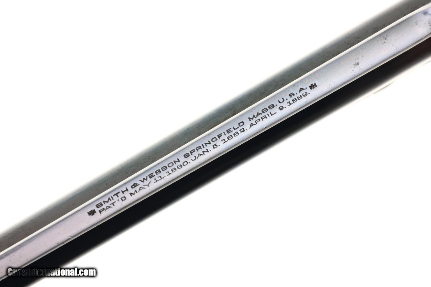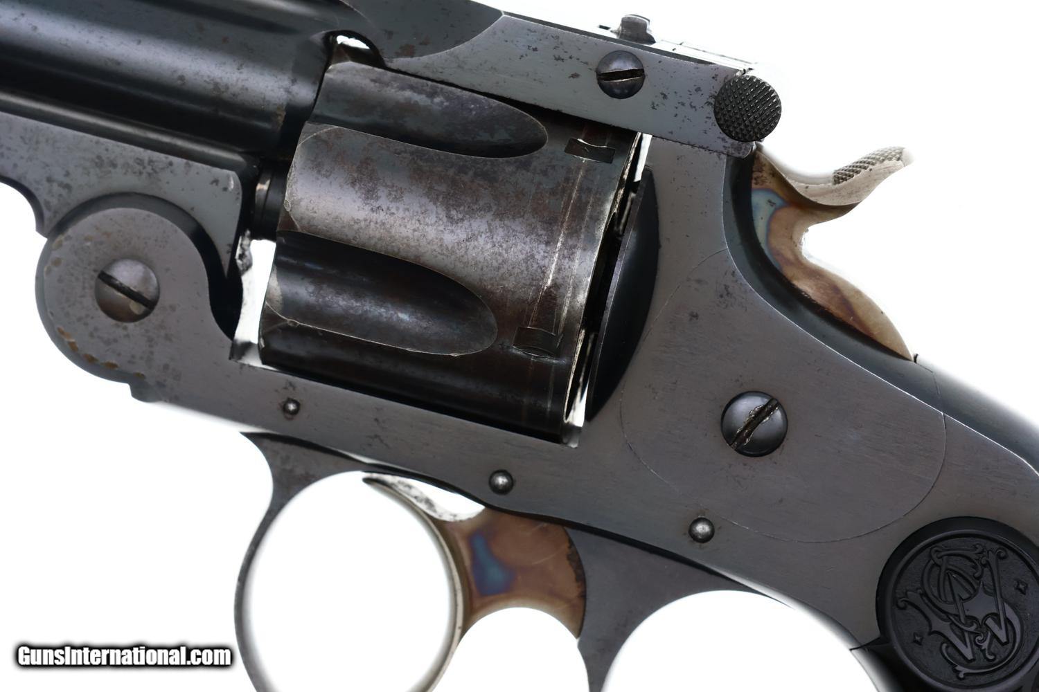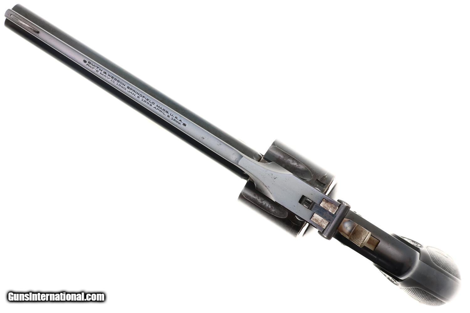 Early Smith & Wesson .38 Double Action Top-Break (4th Model) revolver with relatively scarce 5" barrel, SN: 366774, manufactured circa 1895–1909 in serial range 322,701-539,000. Chambered for the .38 S&W cartridge, this revolver features Smith & Wesson’s automatic-ejecting top-break action, five-shot cylinder, and standard SA/DA lockwork of the period. The barrel rib is marked “SMITH & WESSON SPRINGFIELD MASS. U.S.A.” with patent markings. SN: 366774 is stamped on the butt of the grip, repeated on the rear face of the cylinder, and under unlocking latch. Fitted with hard rubber grips, the SN scribed inside the right grip, though last digit may be a "3" or "7". According to ATF, the last SN that qualifies as an antique is: 382,021, this revolver easily qualifying.