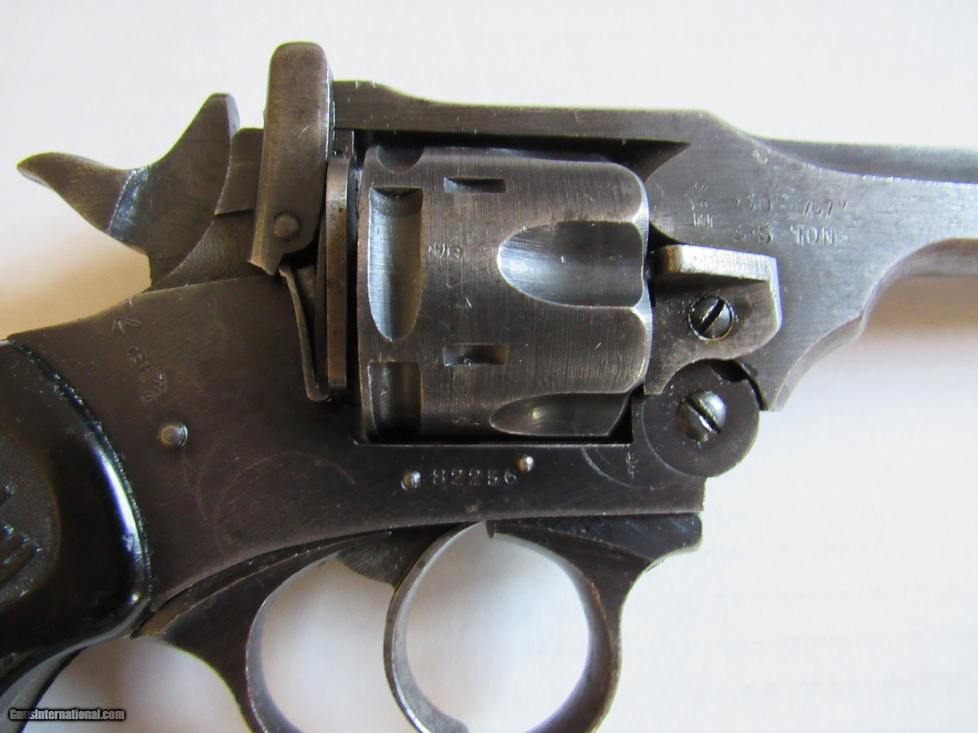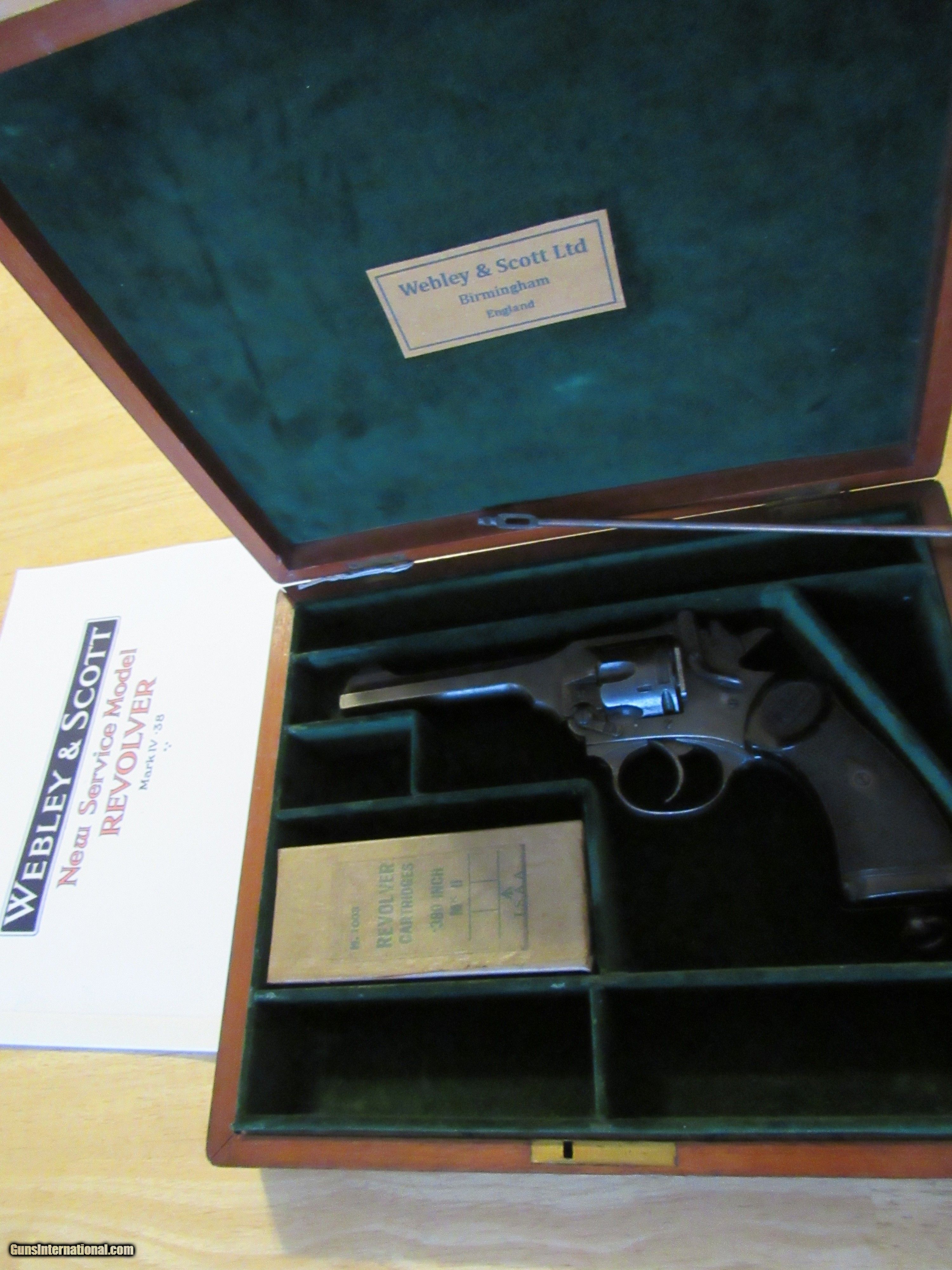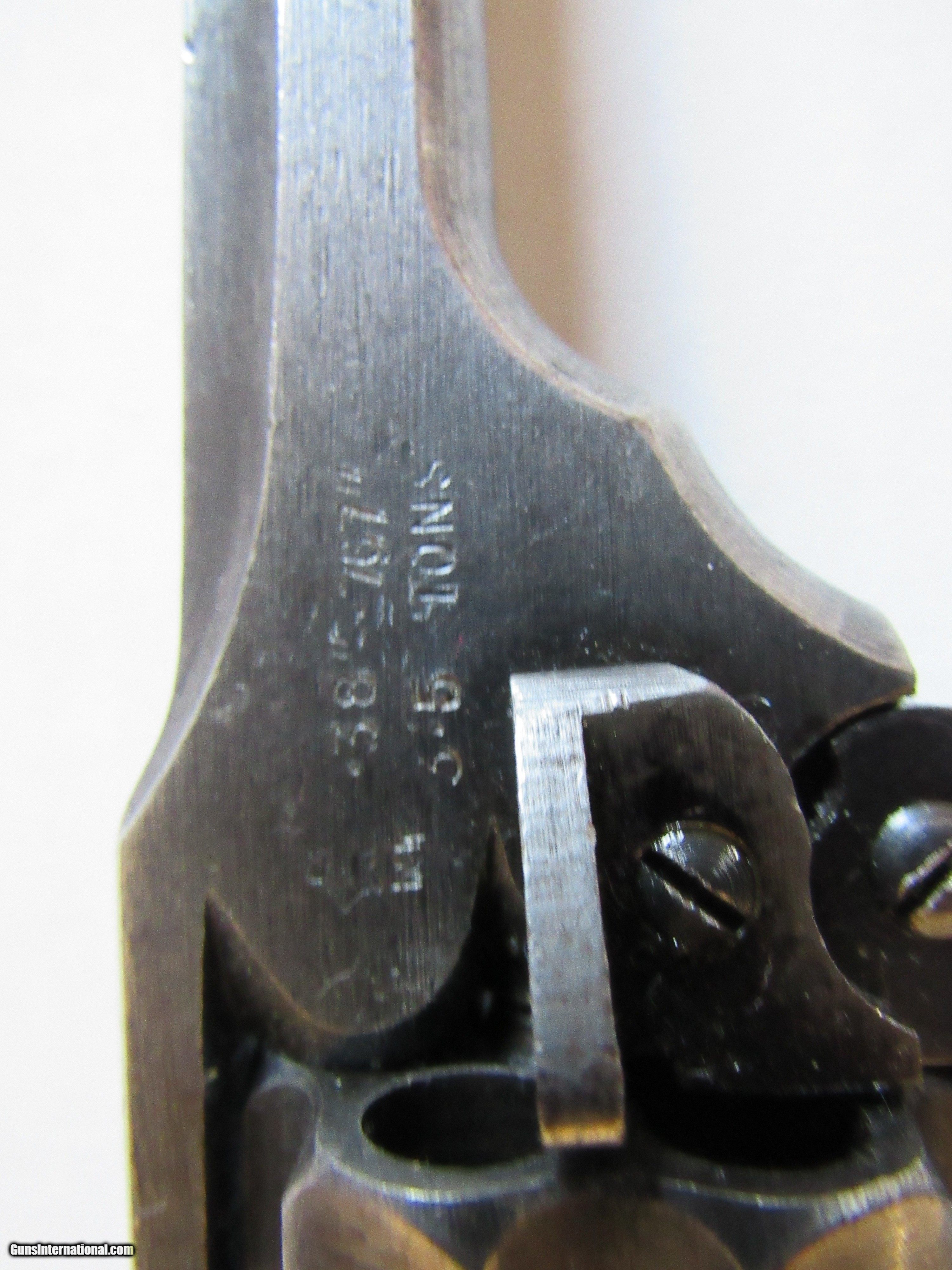 Description: Webley & Scott Model Mark IV 38. - Serial Number 82256 - .380 (.38S&W) caliber double action top ejecting revolver - 5" barrel with an excellent bore - This firearm was manufactured 1942-1943 for military use during WWII and is clearly marked "War Finish" on left side frame - The war time finish on the metal & the original plastic grips are in very good condition - Lanyard Loop & Action works fine - Excellent Military Proofs - Firearm has clear and bold military proofs. Firearm is complete in a nice Webley & Scott LTD case with an empty cartridge box, a original period cleaning rod, and manual from Cornell Publications. There is no key to the wooden gun box. Shipping is included with purchase of this firearm. This firearm must be shipped to a FFL, or CR dealer. SOLD Curio/Relic: Yes Manufacturer: Webley & Scott Model: Model Mark IV 38 Serial Number: 82256 |