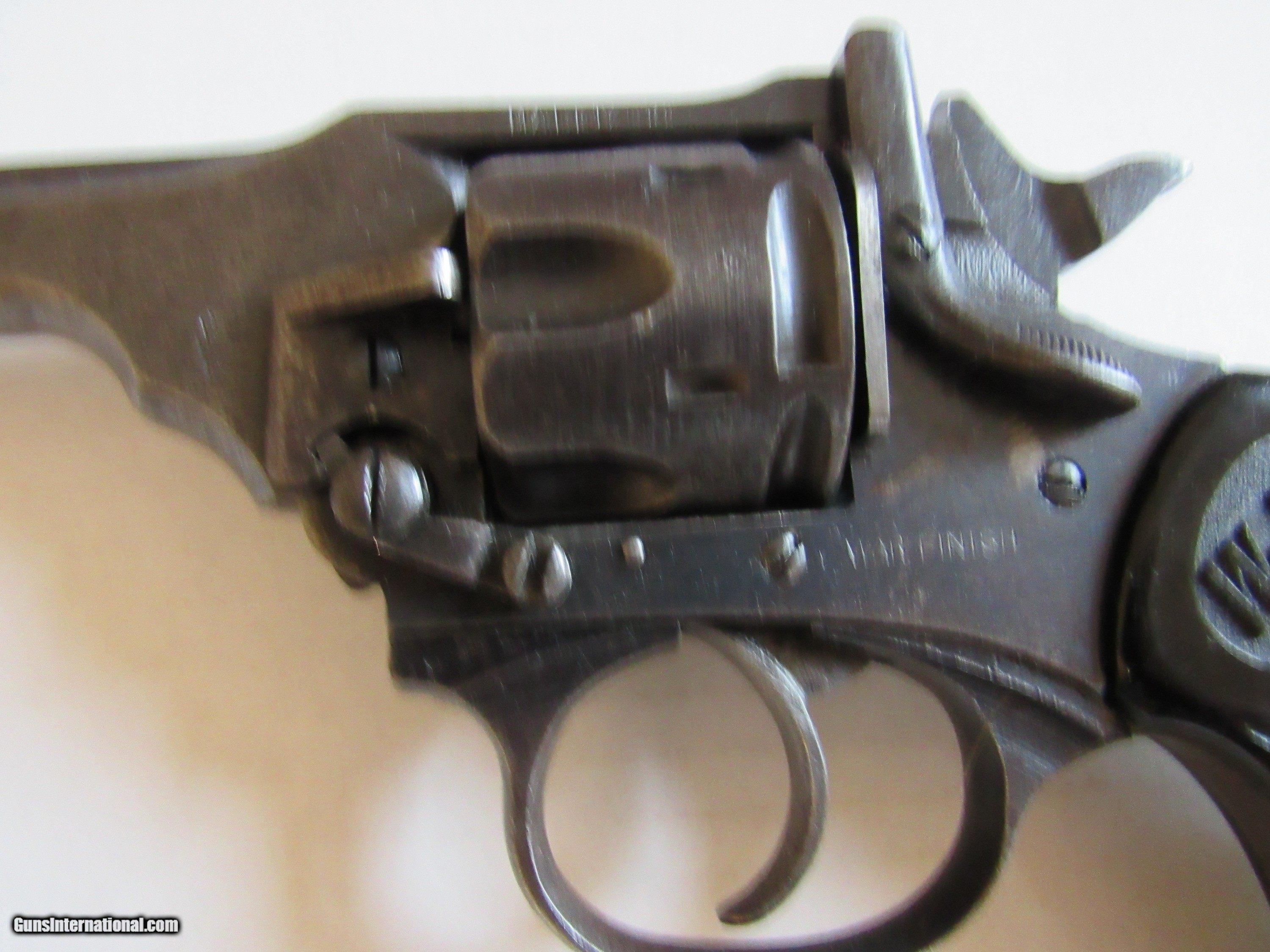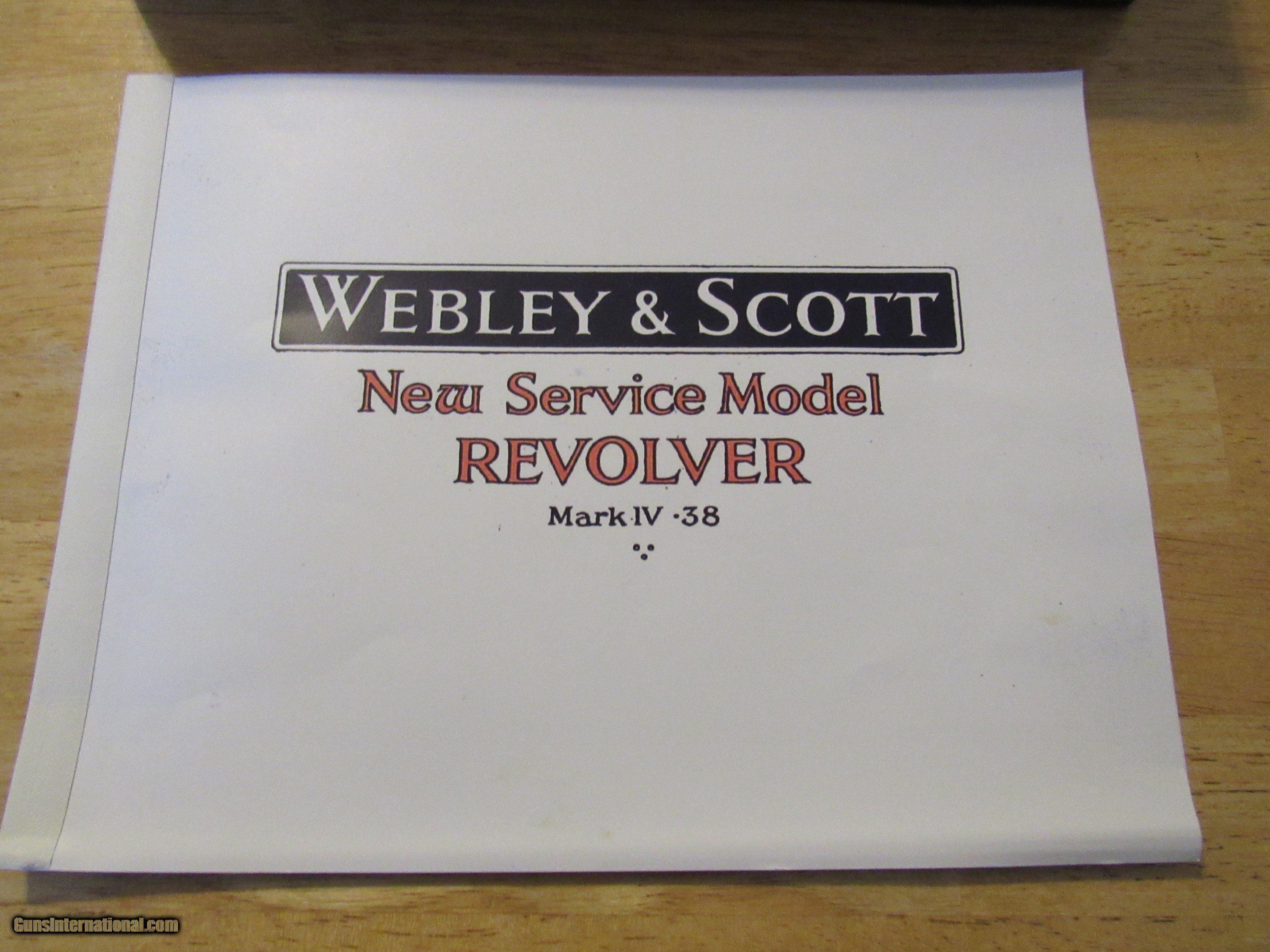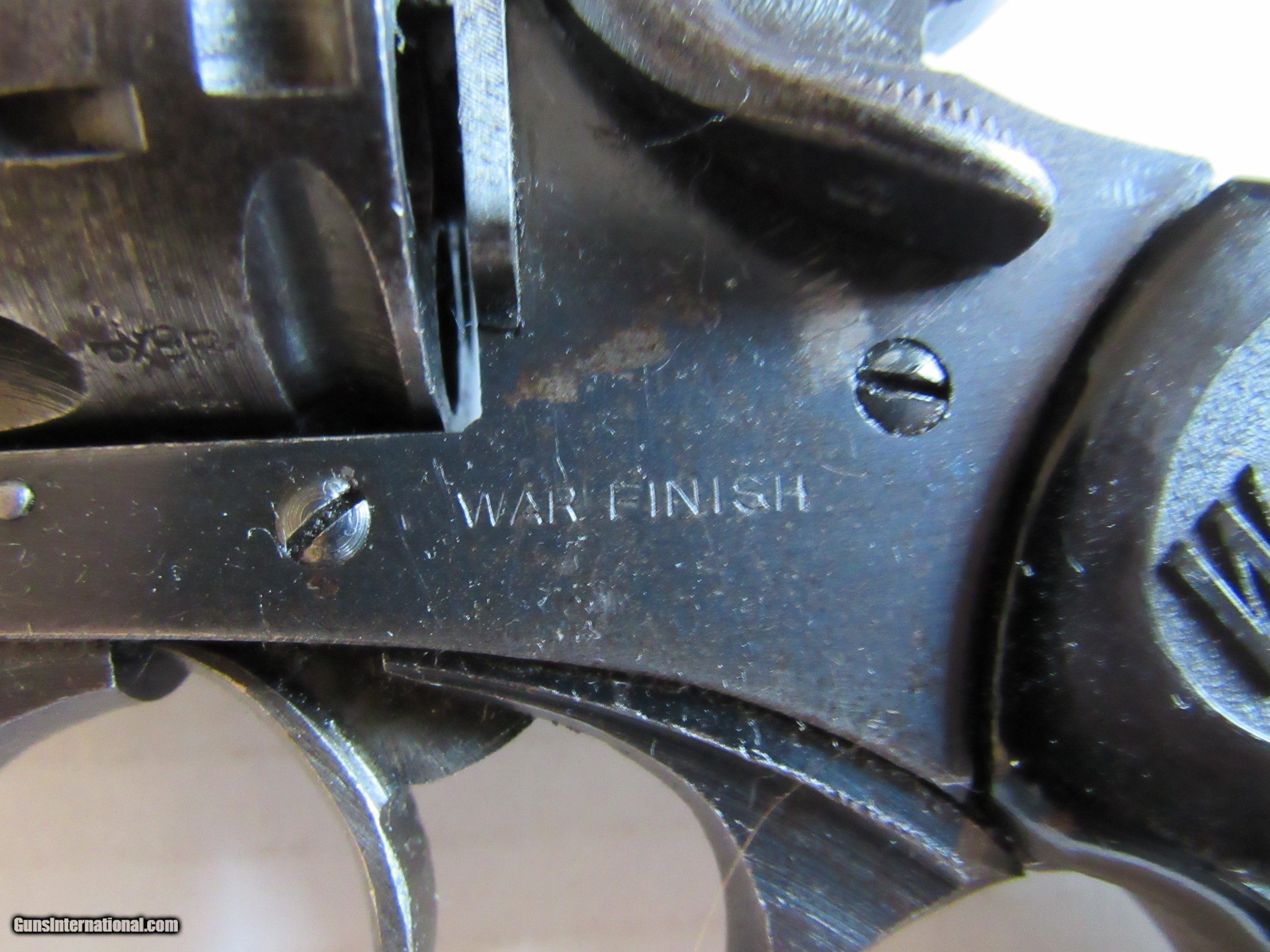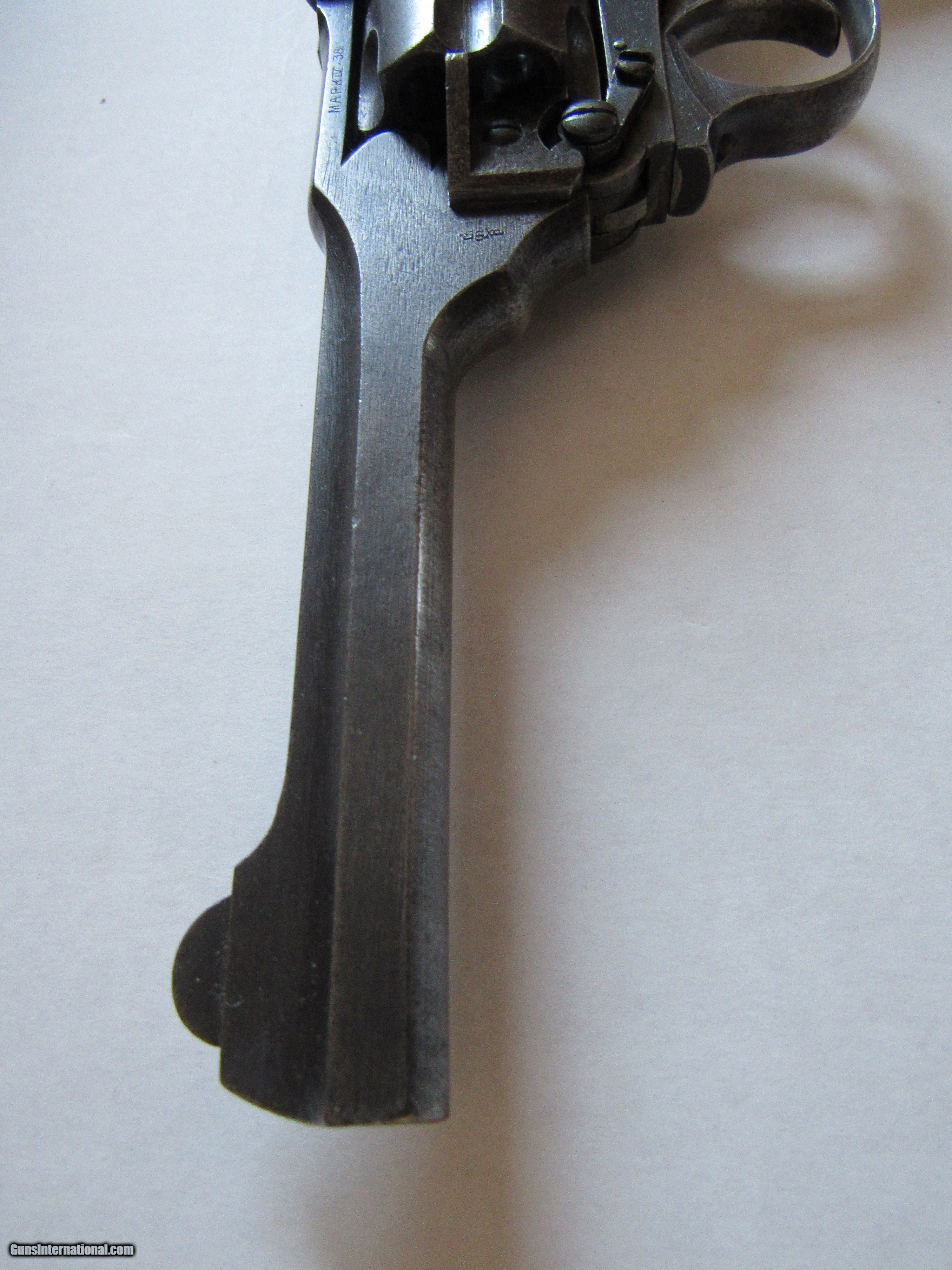 Description: Webley & Scott Model Mark IV 38. - Serial Number 82256 - .380 (.38S&W) caliber double action top ejecting revolver - 5" barrel with an excellent bore - This firearm was manufactured 1942-1943 for military use during WWII and is clearly marked "War Finish" on left side frame - The war time finish on the metal & the original plastic grips are in very good condition - Lanyard Loop & Action works fine - Excellent Military Proofs - Firearm has clear and bold military proofs. Firearm is complete in a nice Webley & Scott LTD case with an empty cartridge box, a original period cleaning rod, and manual from Cornell Publications. There is no key to the wooden gun box. Shipping is included with purchase of this firearm. This firearm must be shipped to a FFL, or CR dealer. SOLD Curio/Relic: Yes Manufacturer: Webley & Scott Model: Model Mark IV 38 Serial Number: 82256 |