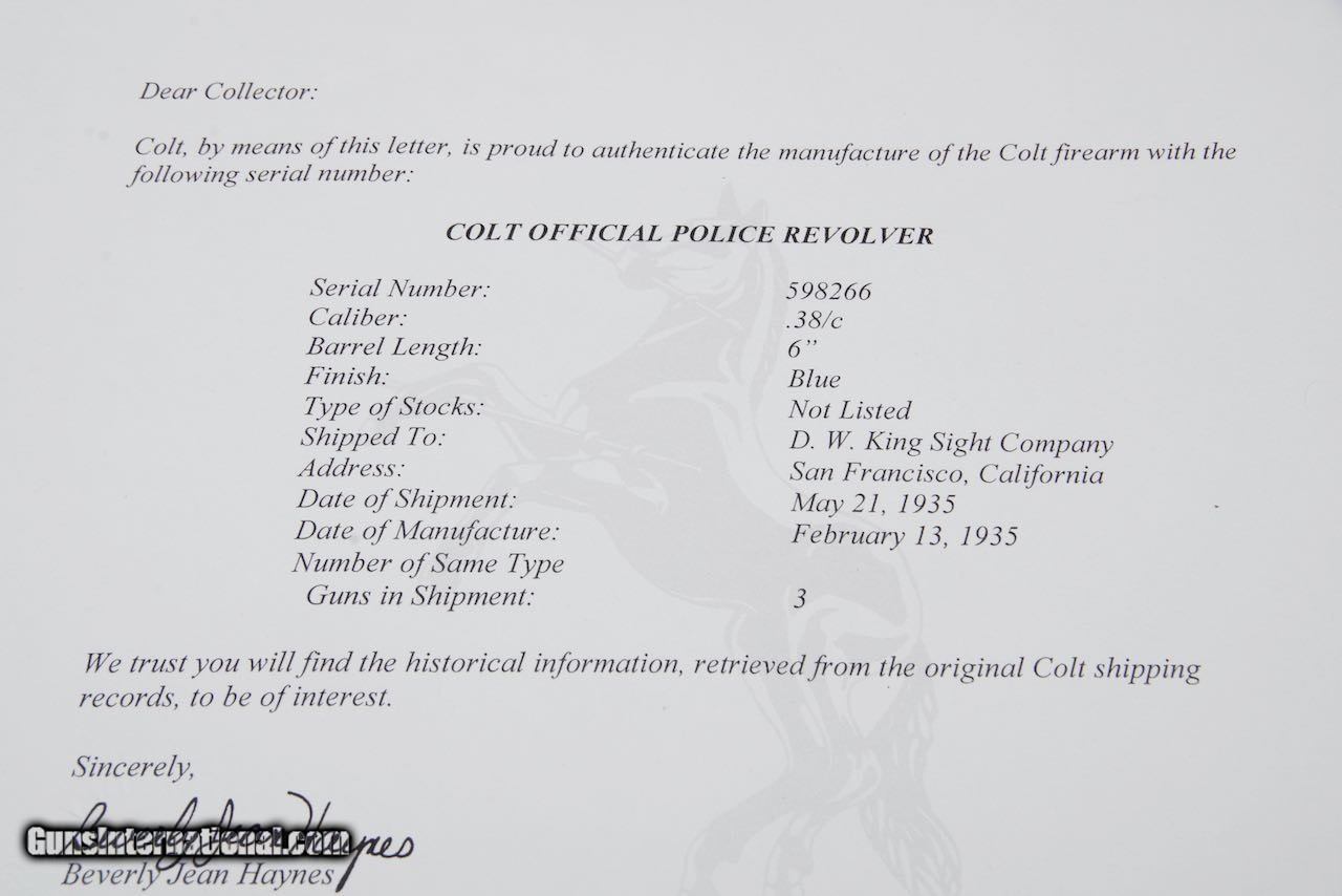 1935 Colt Official Police 38 Special 6'' Blue King Super Target with Factory Letter