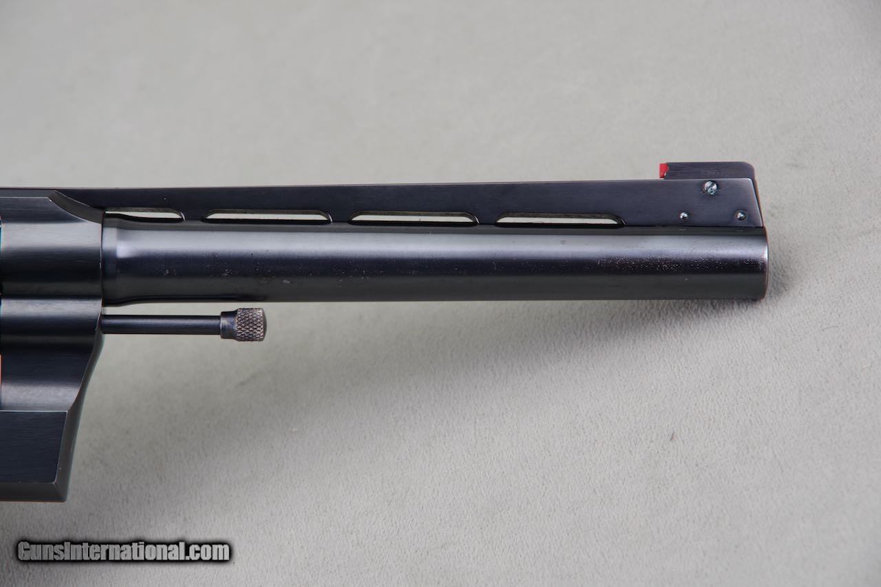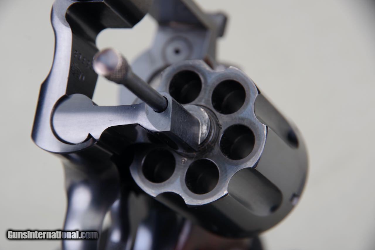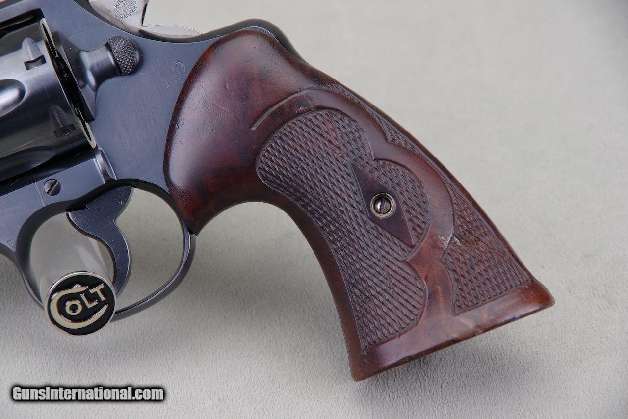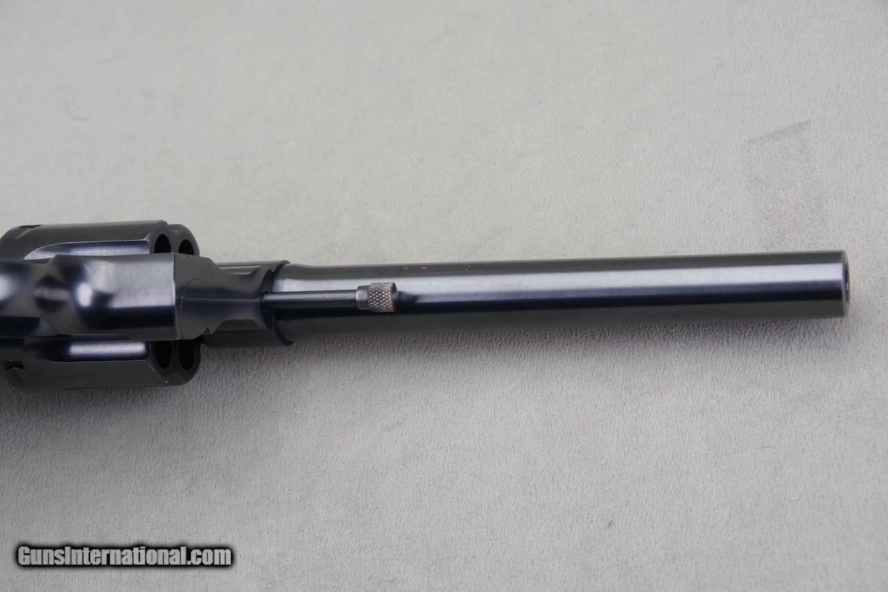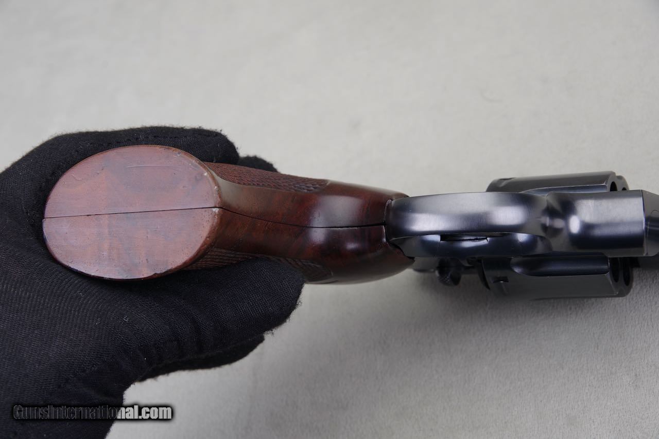 Description: 1935 Colt Official Police chambered in 38 special with a 6 inch barrel and factory blue finish. Per the included Colt archive letter it was shipped to King Sight Co. February 13, 1935. Any revolver with a King Super Target conversion is rare and to find one that is a direct shipment is very difficult to find as most were shipped to them after the original purchase. This one has the works including a King Super Target Full rib with a micrometer rear sight and red bead mirror front, King cockeyed hammer, and a King turned action. These king actions simply have to be felt to understand how good they truly are. Additionally they added a set of full target Ropers to this one. This revolver remains in very high condition. The original finish still retains all of its deep dark shine throughout. All of the leading edges are sharp. The backstrap of the grip frame is exceptional. As seen in the photos it only shows very light and scattered handling. Overall the finish rates 98%. The bore is bright and shiny with strong lands and grooves. The grips have one light impression at the lower left side and outside of that they are near perfect with sharp checkers throughout. SOLD Curio/Relic: Yes Handgun Caliber: .38 Special Manufacturer: Colt Model: Official Police Serial Number: 598266 |