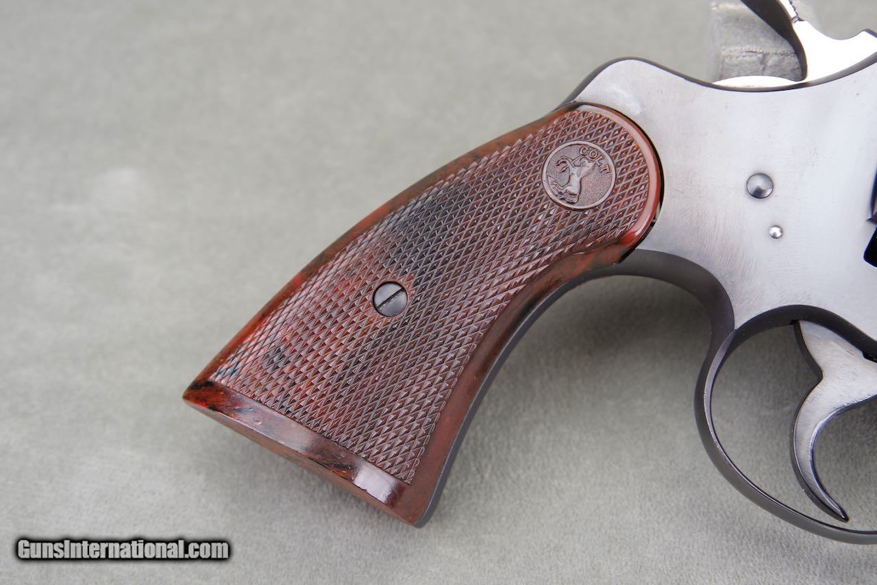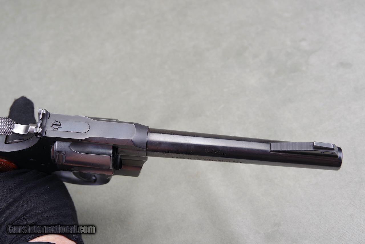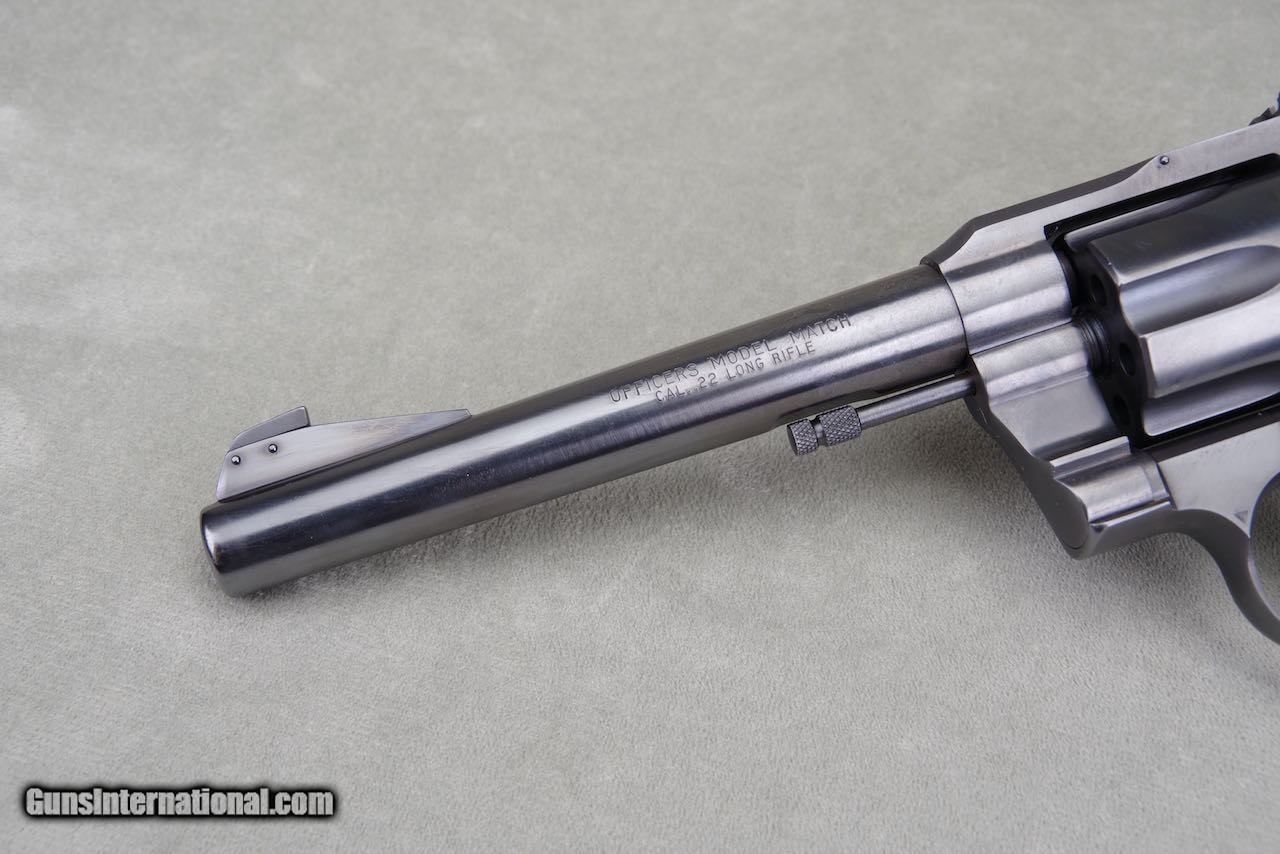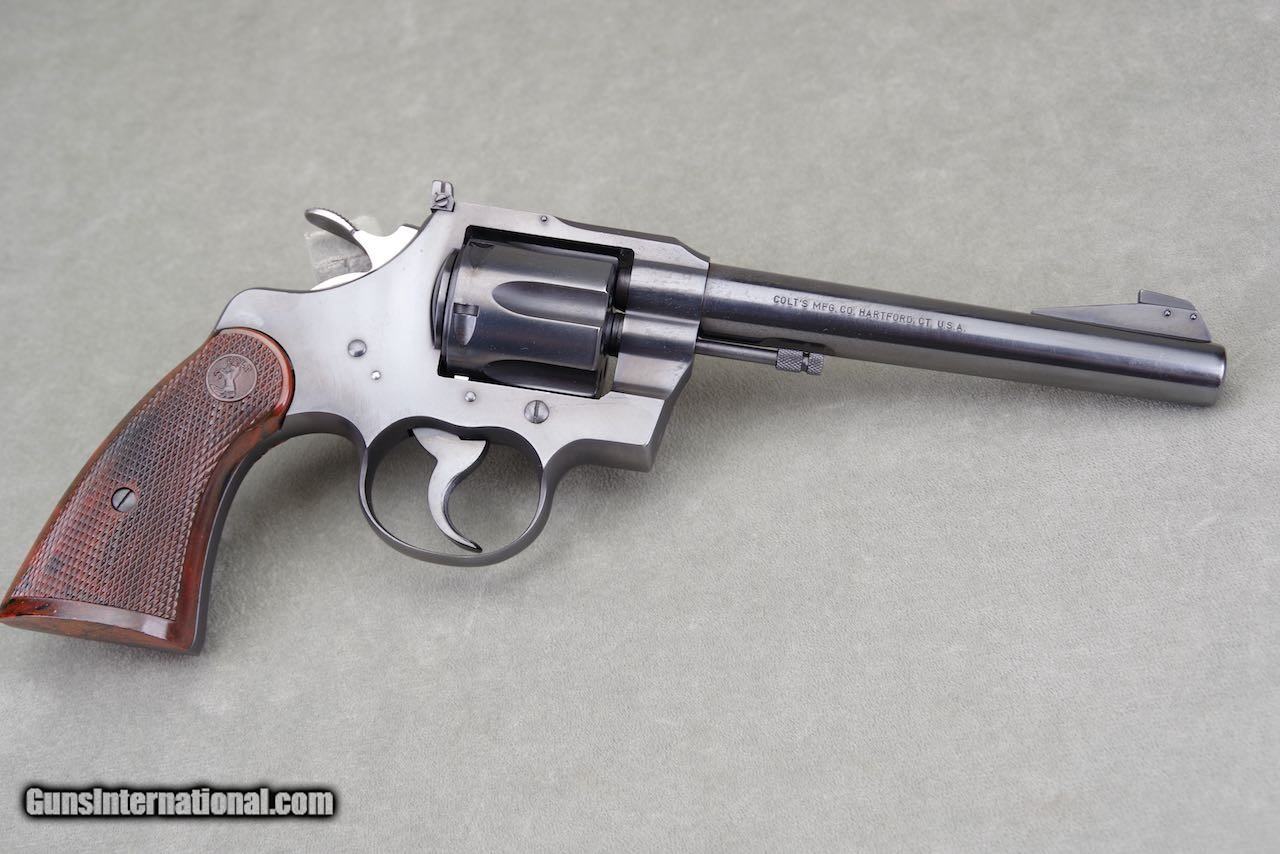 Description: 1953 Colt Officers Model Match chambered in 22LR with a 6 inch barrel. Also included is it's letherette box with the shooting suggestions pamphlet, handling the handgun pamphlet, and sight tool. This revolver has been refinished. It only shows light and scattered handling since the work was completed. The action is crisp, the lock up is tight, and the bore is bright and shiny with strong lands and grooves. The red marbled Coltrock grips are replacements that are near perfect with sharp checkers throughout. SOLD Curio/Relic: Yes Handgun Caliber: .22 Long Rifle Manufacturer: colt Model: officers model match |