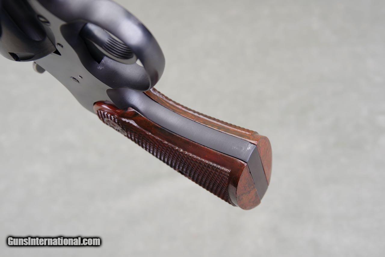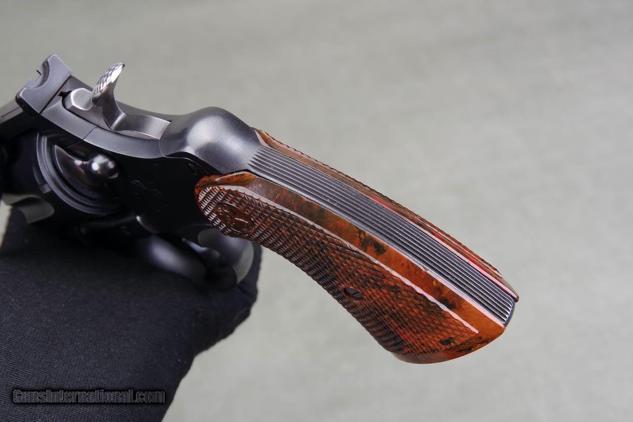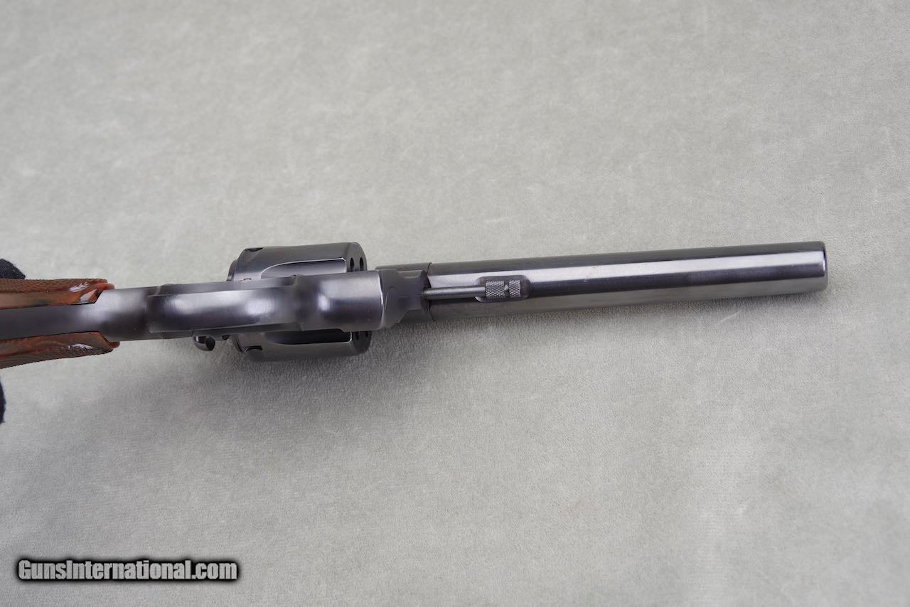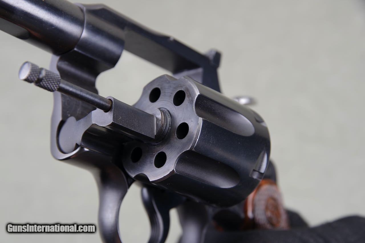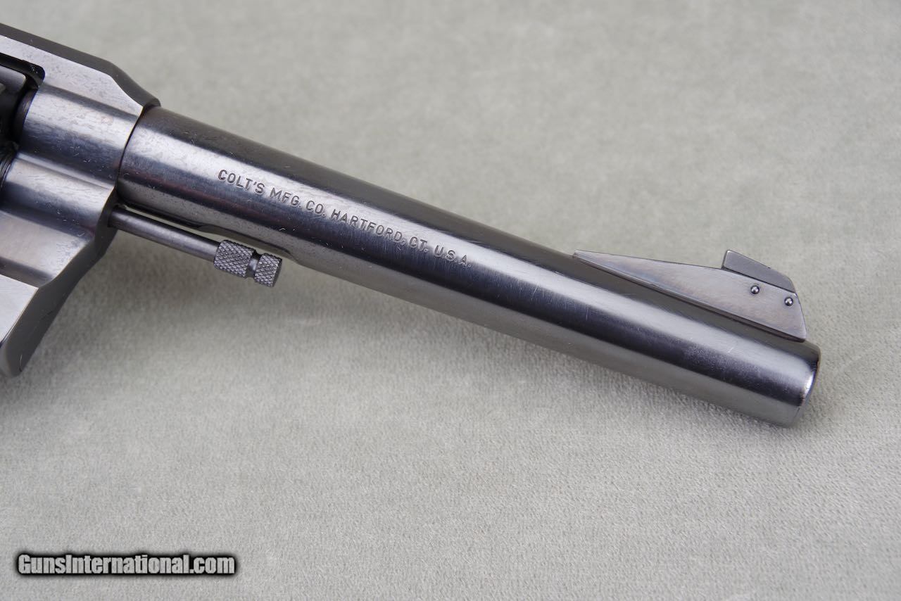 Description: 1953 Colt Officers Model Match chambered in 22LR with a 6 inch barrel. Also included is it's letherette box with the shooting suggestions pamphlet, handling the handgun pamphlet, and sight tool. This revolver has been refinished. It only shows light and scattered handling since the work was completed. The action is crisp, the lock up is tight, and the bore is bright and shiny with strong lands and grooves. The red marbled Coltrock grips are replacements that are near perfect with sharp checkers throughout. SOLD Curio/Relic: Yes Handgun Caliber: .22 Long Rifle Manufacturer: colt Model: officers model match |