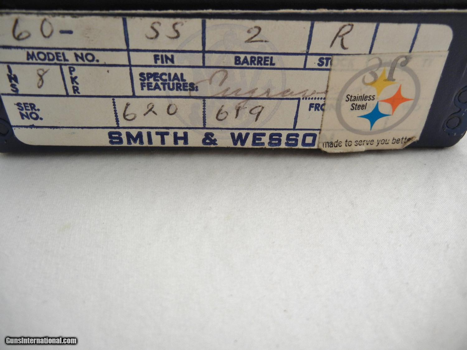 Description: This is a Smith Wesson 60 38 with a 2 inch barrel. This gun is 100% new in the box. This gun is a factory police gun as the engraving was done at Smith from an special order. Not sure of the police department. Serial # is 620xxx. Buyer pays 30.00 shipping. Thank you. 32-19-4 SOLD |