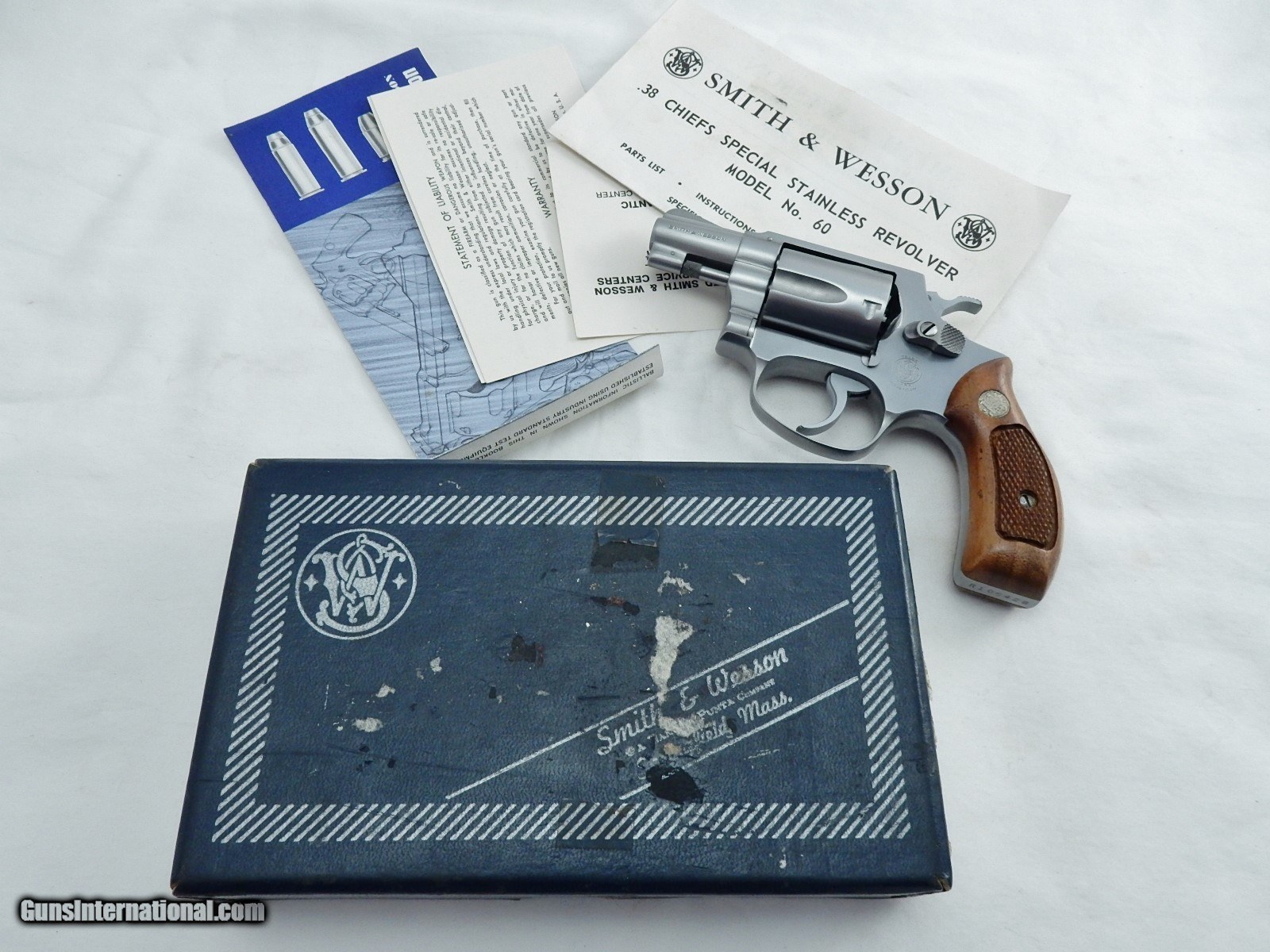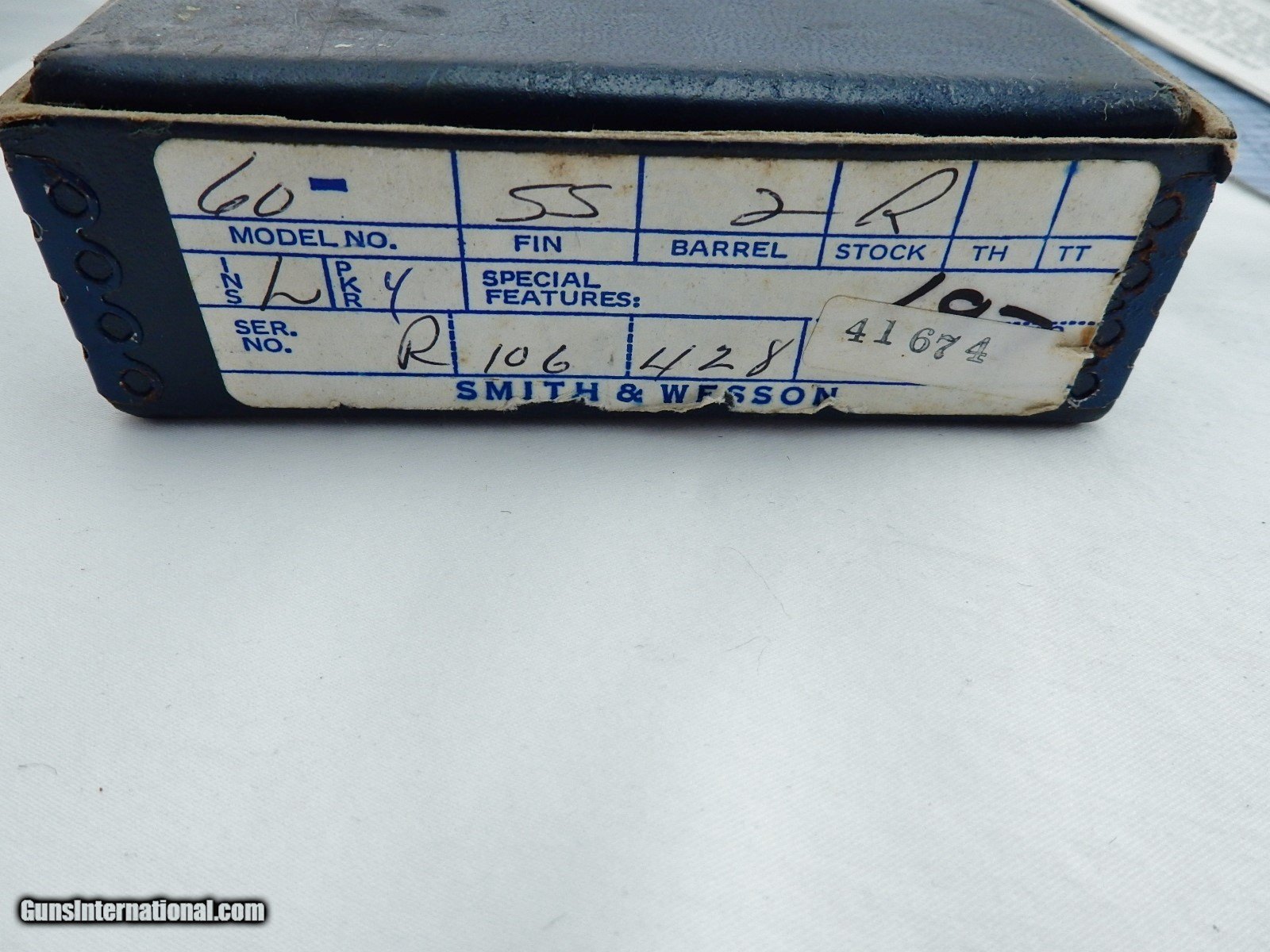 Description: This is a Smith Wesson 60 38 with a 2 inch barrel. This gun is 99% in the box. Serial # is R106xxx. Buyer pays 30.00 shipping. Thank you. 44-12-3 SOLD |