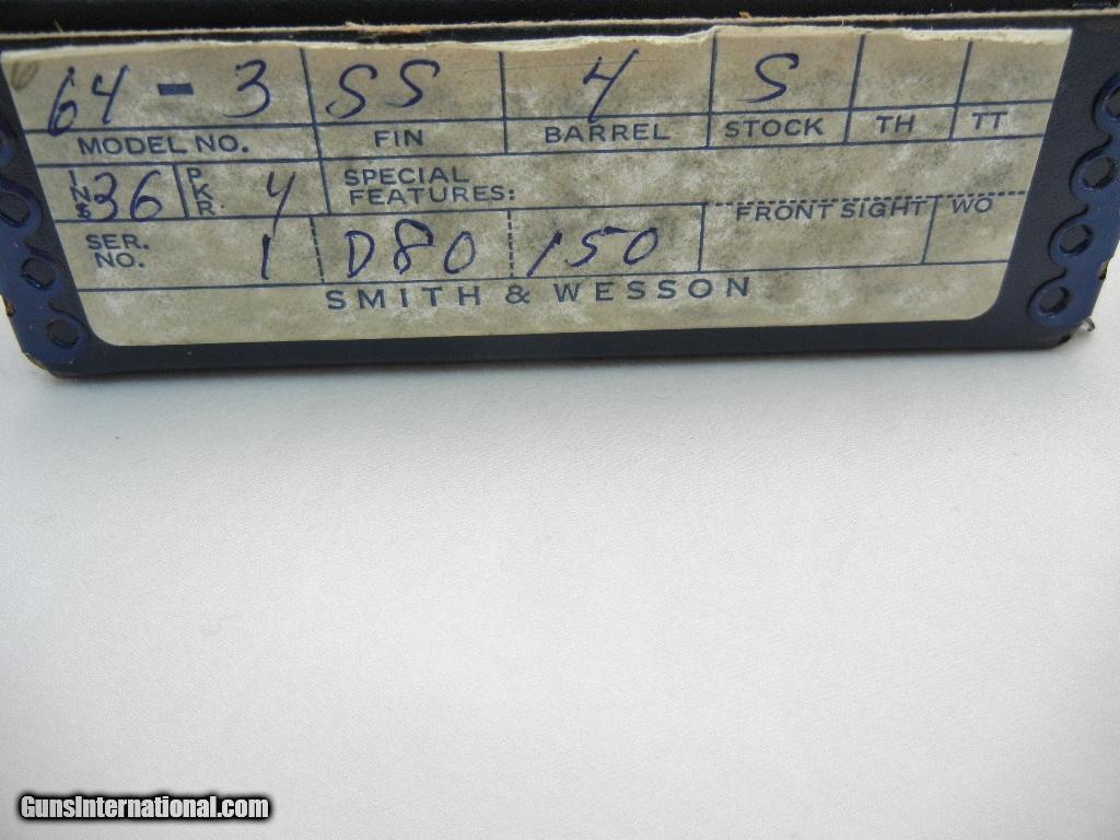 Description: This is a Smith Wesson 64-3 38 with 4 inch barrel. This gun is 100% new in the box. Serial # is 1D80xxx. Buyer pays 30.00 shipping. Thank you. 34-9-6 SOLD |