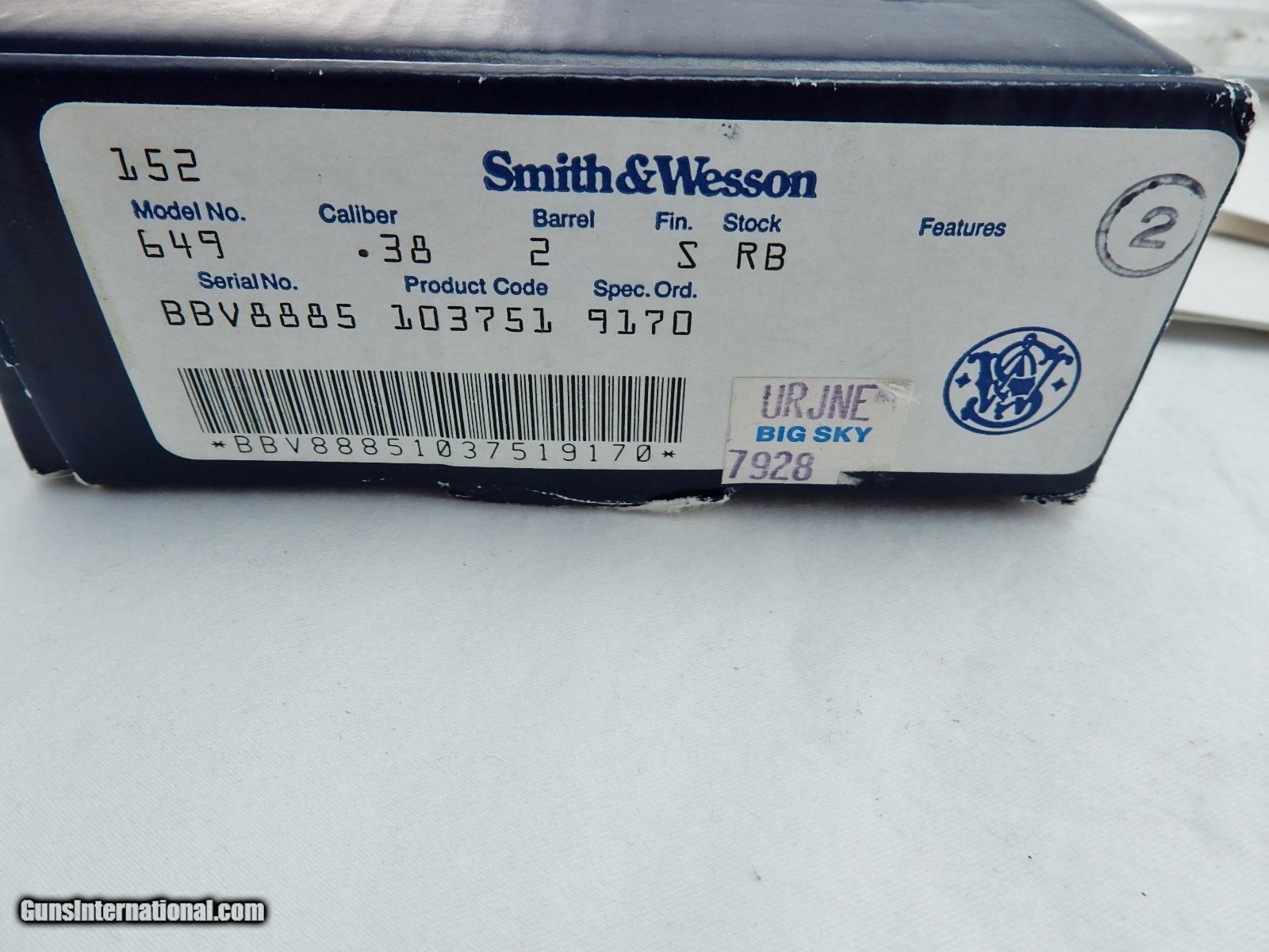 Description: This is a Smith Wesson 649-1 38 with a 2 inch barrel. This gun is 100% new in the box. Serial # is BBV88xx. Buyer pays 30.00 shipping. Thank you. 44-19-8 SOLD |