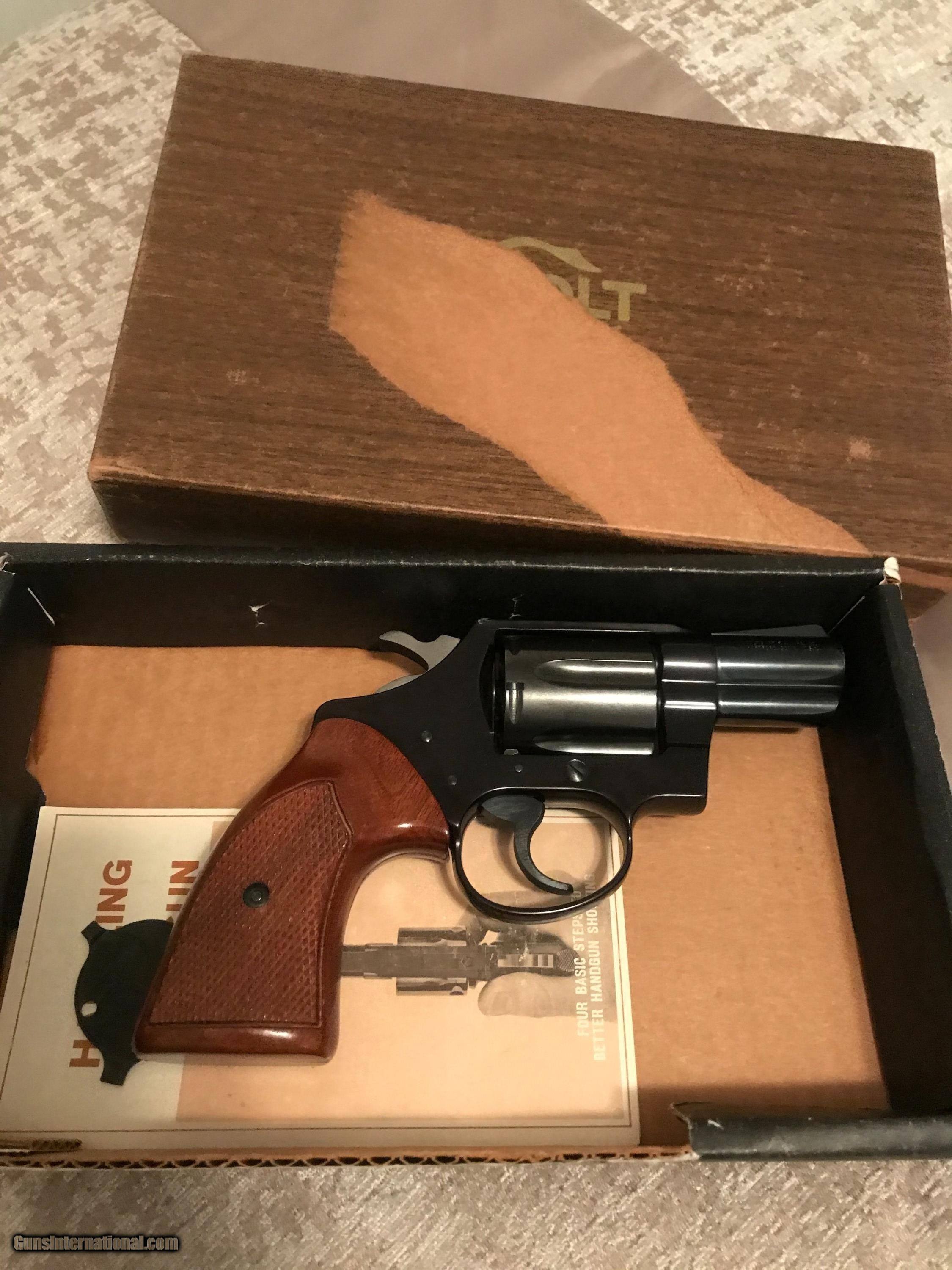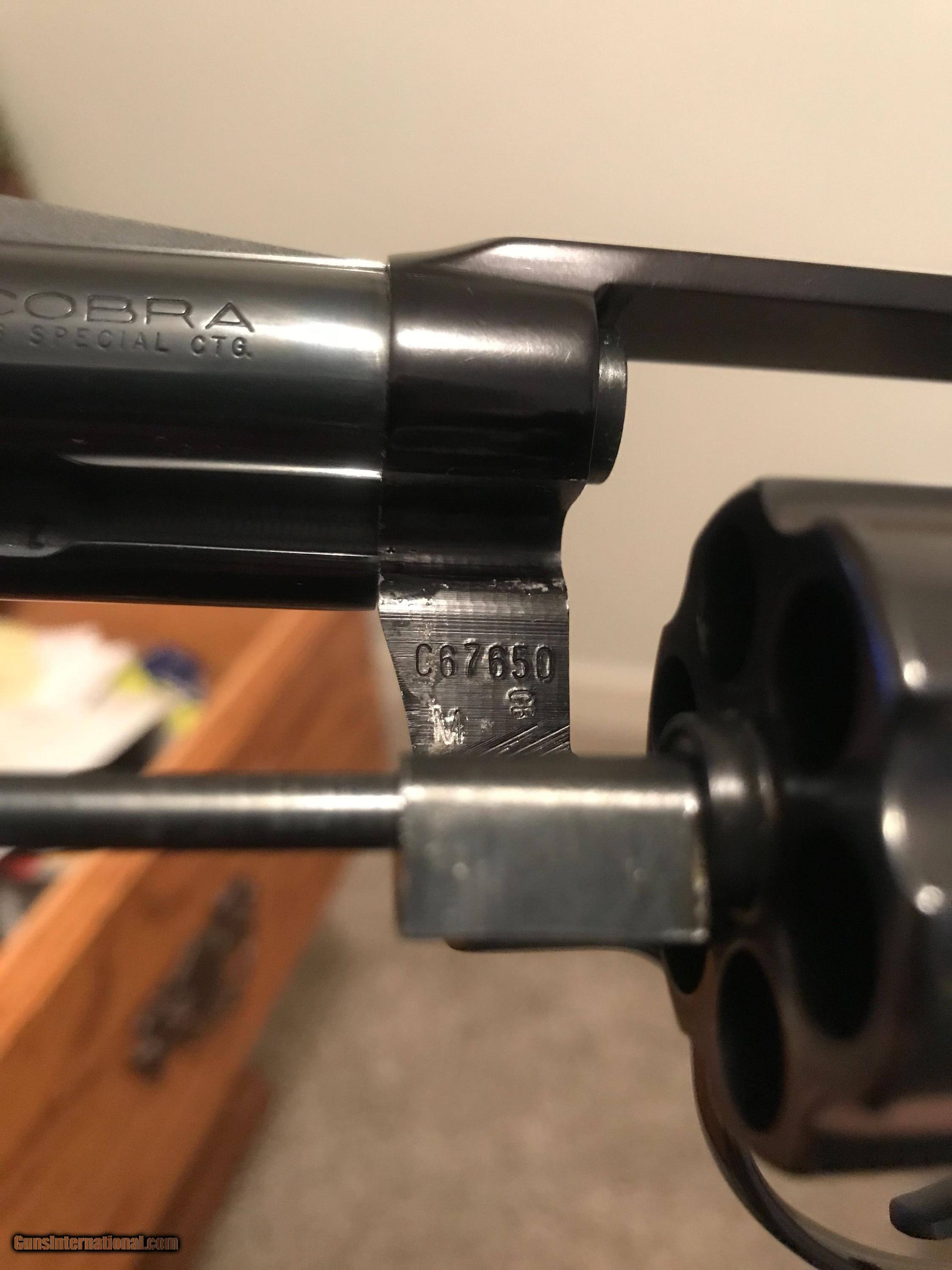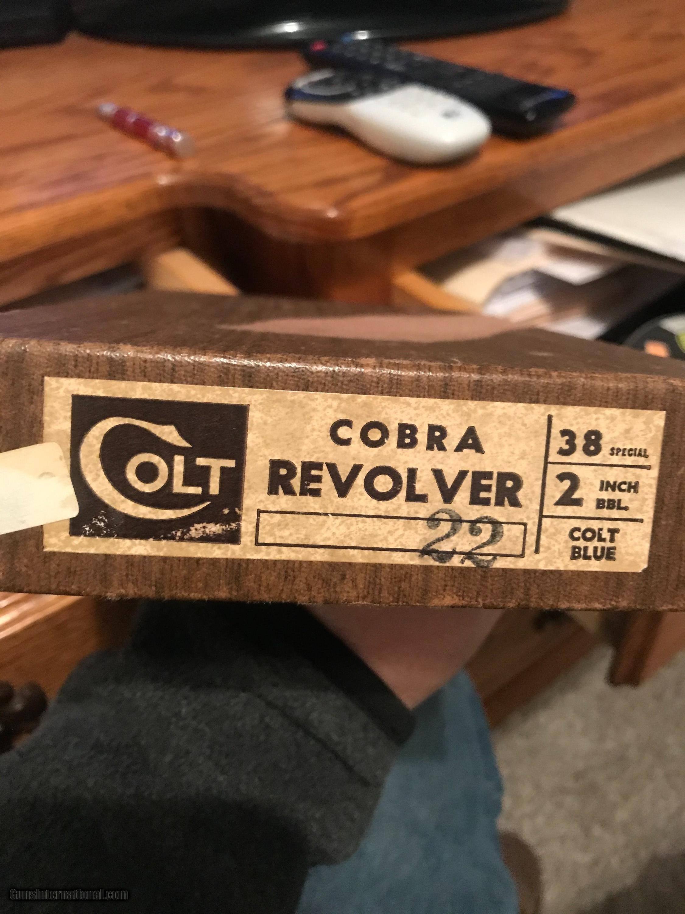 Description: Here is a super nice Cobra with the original numbered box. Blue finish, alloy frame with 2 inch barrel, colt d frame wood grips. A couple of rings on the right side of gun next to the hammer (see pic). One worn spot on the trigger guard about the size of a pencil eraser. Slight wear on the right side, end of the barrel. Nonetheless, a beautiful and highly collectible gun. Please email with questions. Shipping included. Cards add 3% SOLD Manufacturer: Colt Model: Cobra Barrel Length: 2 Condition: Used Metal Condition: Very good Wood Condition: Excellent Bore Condition: Excellent Action: Double Finish: Blue Sights: Fixed Manufacture Date: 1972 Item Location: 37075 |
