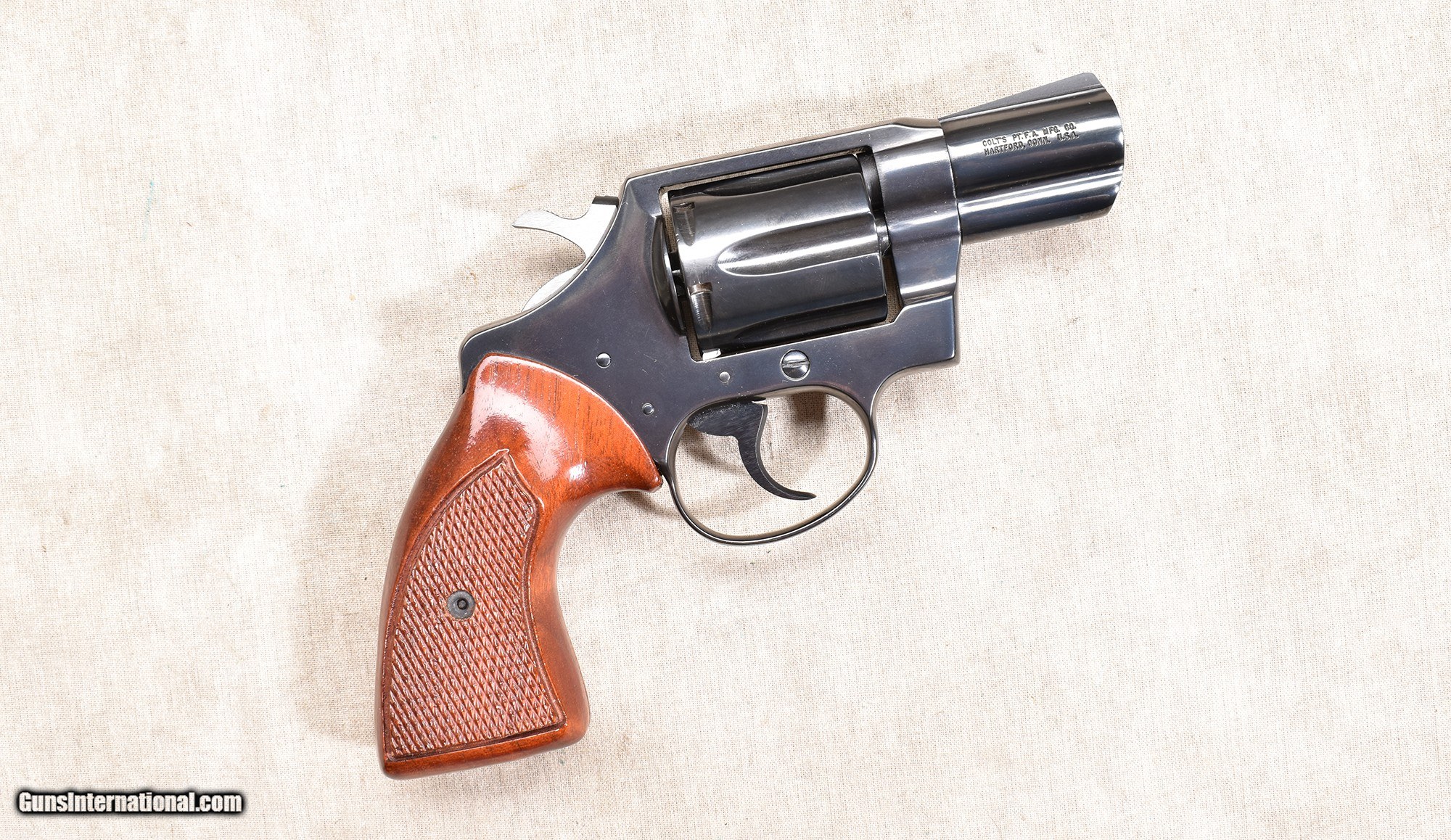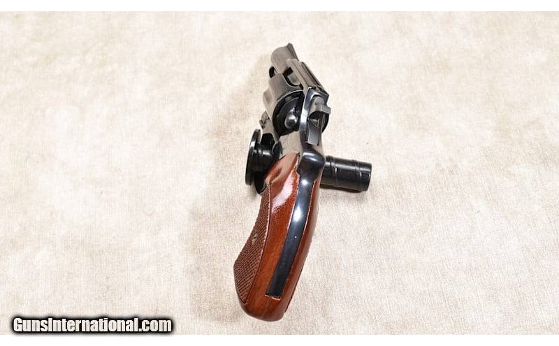 Description: Add a fedora, a pack of Luckies, a Zippo, and a flask of adult beverage, and you have the makings for an old detective novel, "the kind the drug stores sell." This one is in excellent condition, but has just enough wear to be a user's gun and not a non-shooter's collector piece. It dates to 1975, via the S/N. .38 Special SOLD Chambers: 6 rounds Metal Condition: "Excellent. Very faint turn line, may have been fired but not very much. Wood Condition: Excellent. Bore Condition: Shiny and bright with good rifling. Barrels: 2-1/8 inches Triggers: Factory double and single action trigger Stock Dimensions: Hand-filling 2-3 finger grip. Butt Pad: Checkered walnut. Weight: 23 oz Sights: Fixed low-profile ramp and notch Item Location: Rogers |