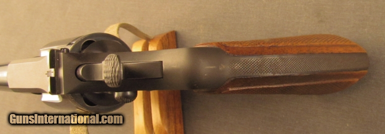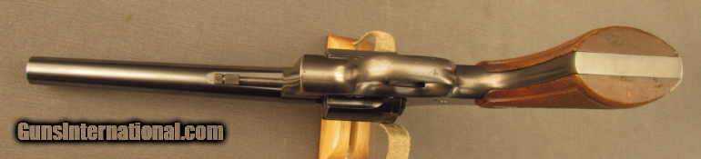 Description: S# 616821, 38 special, 6 inch barrel, bright excellent bore. This 1937 manufactured revolver has the desirable and scarce heavy barrel. Other features include adjustable front and rear sights, checkered trigger and rear grip strap, and wide spur target hammer. Gun retains over 80% original blue with an area of pitting on right side below rear sight and a few small areas of light pitting on cylinder. Barrel shows some staining on right side with an area of light pitting on left side by muzzle. Grips fit well and show wear with areas of flattened diamonds and dings along bottom edges. Action works perfectly, trigger is superb. FFL or C&R. SOLD Manufacturer: Colt Model: Officers Model Serial Number: 616821 Caliber Info: .38 Spl Gauge Info: .38 Spl |