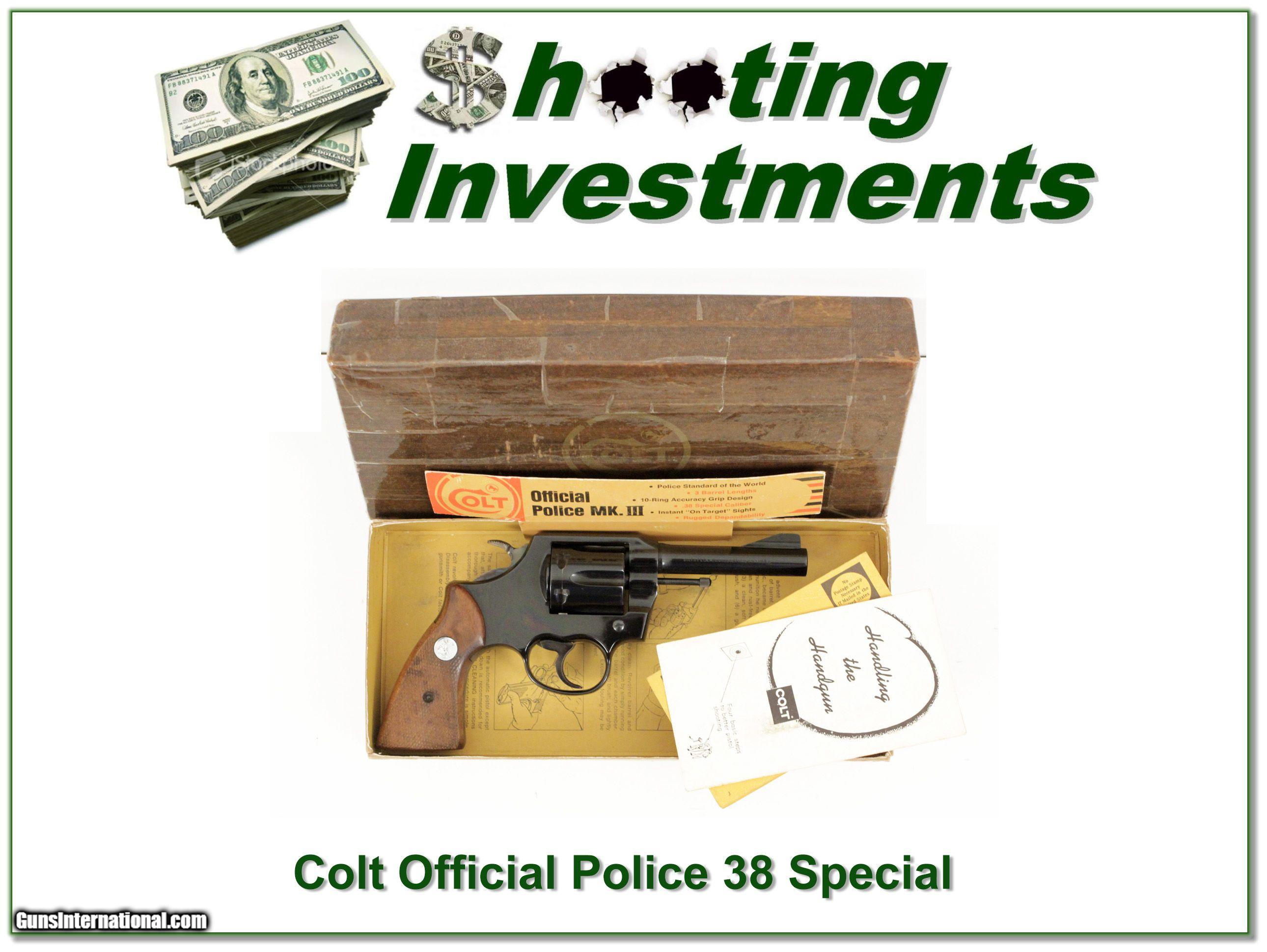 Description: Collectors, this is a Colt Police Special Mark III in 38 Special. It is in excellent collector condition and comes as seen in original box with display folder and papers. Note that at some point tape was put on the box. I am selling this one on consignment and as such lay-a-way can’t be used. It does of course have the standard 3-day inspection. Shipping and insurance is $29. Please email me with any questions or larger pictures. (Consign your quality firearms with Shooting Investments for only 10%! Let me know if you have any you would like to sell!) 17-0710 Payment: Payment is by Money Order, Cashiers Check or Personal Check. I can now also accept MasterCard and Visa with a 3% convenience fee. PayPal can be used for some items but never firearms. Please let us know if you would like to pay via PayPal. Shipping: The shipping charge will be listed in each description. It is $39 for most long guns and $29 for most handguns. Some heavy guns or those insured for over $2000 will be higher. Shipments to Alaska and Hawaii are higher because air shipment is required. Most firearms are shipped on Tuesday and Thursday and usually in 5 days of receipt of payment. We package all shipments carefully and insure them. For long guns you can purchase a new Plano case for $19. They now cost us $22 when buying 100 at a time. Optics are shipped Priority Mail and most other non-firearm shipments are shipped First Class. Returns: Our return policy is simple. If for any reason you are not pleased with your purchase, you may return your item for a full refund of purchase price. Ammunition cannot be returned. It is important to us that you are happy. Guns cannot be fired or dissembled before returning them and they must be returned in the same condition as received. Notification of a return must occur with-in 3 days of receipt at your dealer. Shipping, convenience and dealer fees are not refundable and are the responsibility of the buyer. Lay-a-way: If needed, we offer a 60 day lay-a-way option on most firearms. It is 1/3 now, 1/3 in 30 days and 1/3 in 60 days. Lay-a-way firearm sales are final and if not completed the first payment cannot be returned. Consigning your firearms with Shooting Investments: We will help you get top dollar for your firearms. While most local guns shops charge 20% or more, our fee is only 10% with a minimum of $75. At your local gun shop it might take months to sell. Selling on-line provides instant access to thousands of interested buyers. You won’t find any other on-line dealer willing to sell your firearms for only 10% or listing every gun on 3 separate s. Selling through an House typically costs the seller 15% and the buyer an addition 15% (so 30%) and you have to wait several months to sell and longer to receive funds. If properly priced, we will sell your firearms in a few weeks. Send us an email or give us a call and we’ll explain how easy it is for you to get top dollar. Trading: Trading for use is really just buying your gun to re-sell. If you have a gun you want to trade, please email a picture and we will let you know what we can give or it. You will always get more if we sell it for you on consignment. Help for California Buyers: We are happy to ship to California. It is the buyer’s responsibility to make sure any item you buy is legal in your state. We are also happy to help with your purchase of a firearm from someone other than us. If you see a gun you would like to buy but the seller can’t or won’t ship to California they can ship to use and we’ll then ship it to your California dealer. The cost for this service is only $30 + shipping. Let us know if we can help! SOLD |