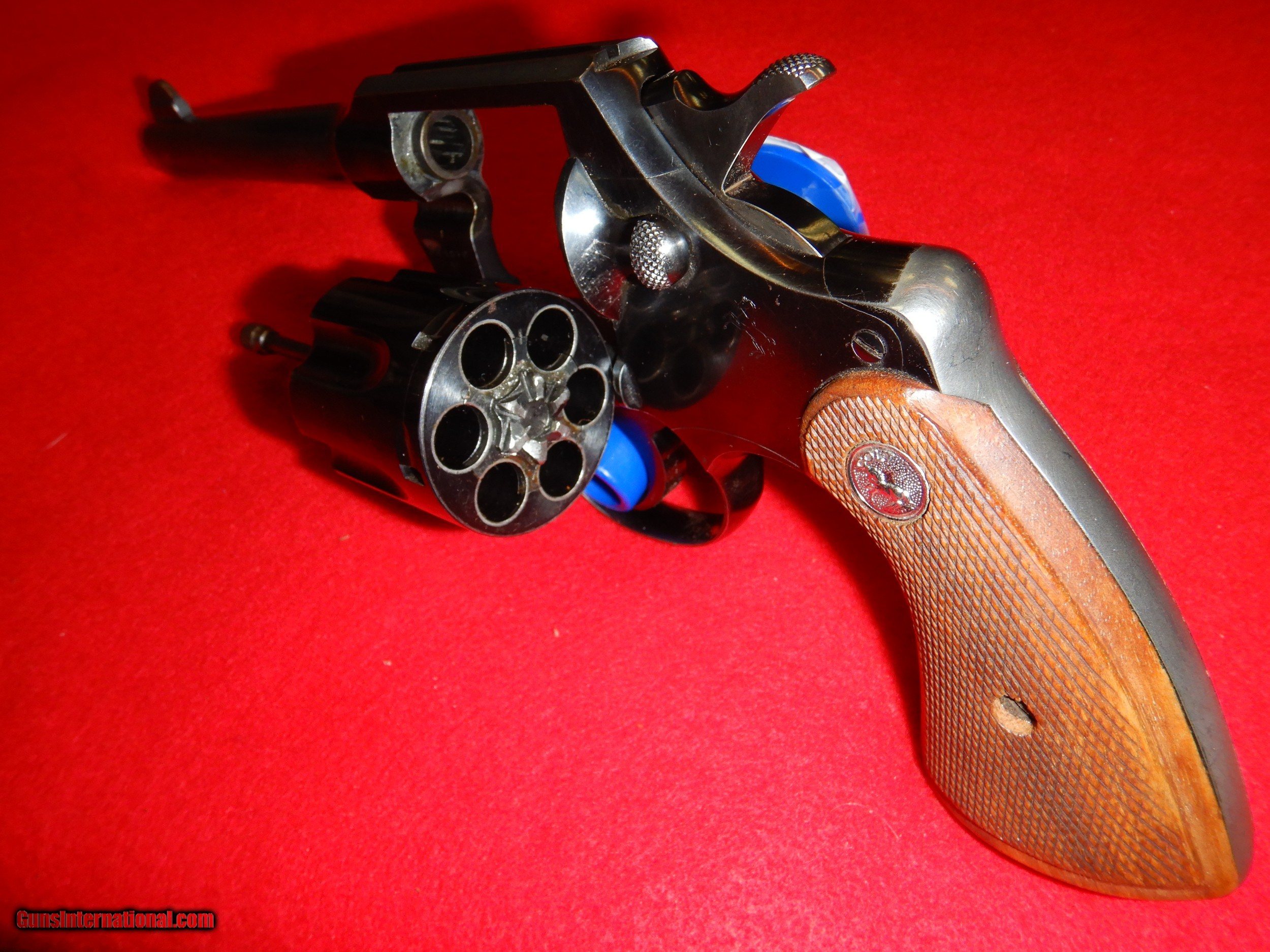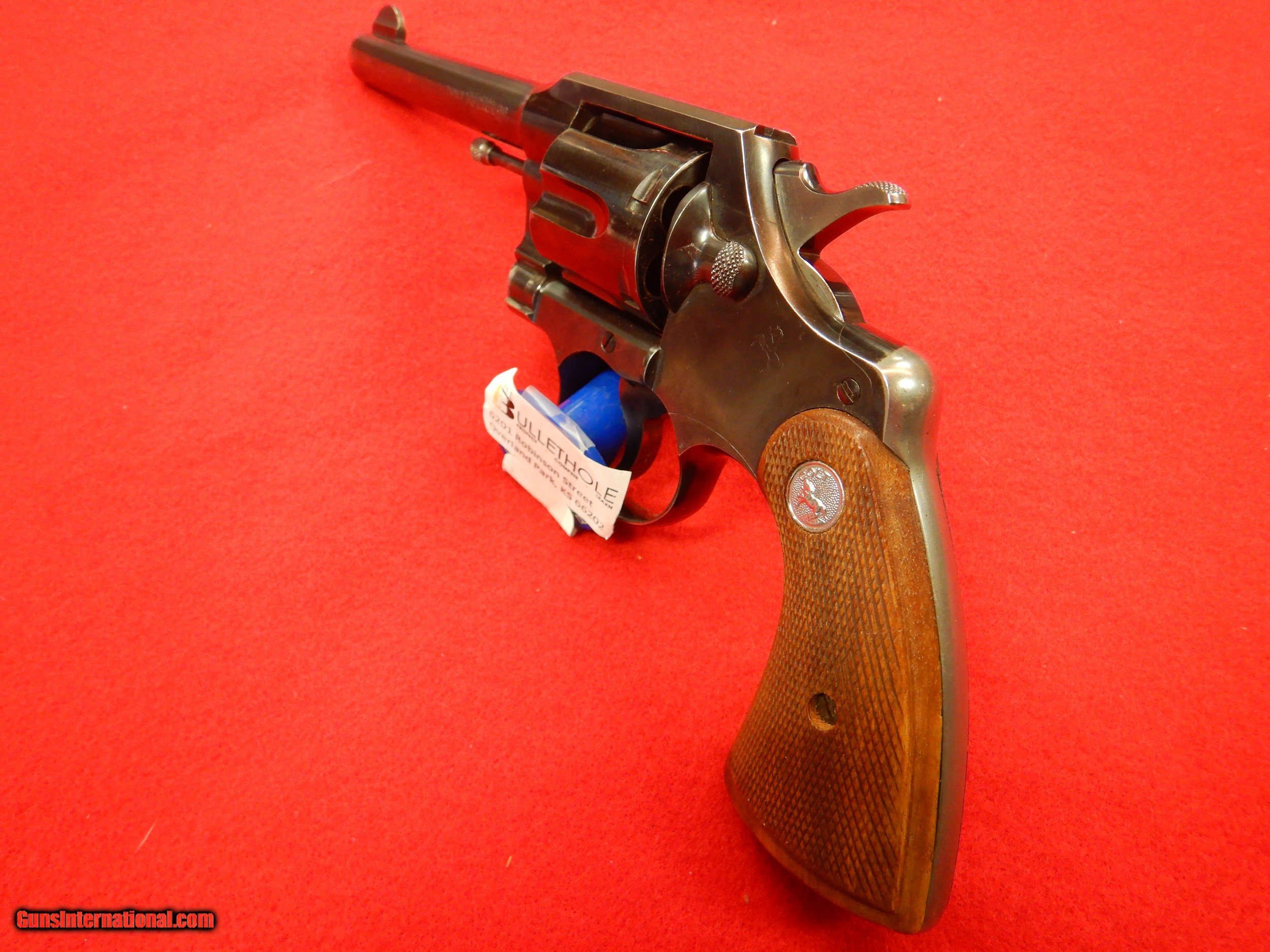 Description: HERE WE HAVE A PRE-OWNED COLT OFFICIAL POLICE BLUE STEEL 5" BBL REVOLVER. THE REVOLVER LOCKS UP VERY NICELY, HAS ORIGINAL COLT WALNUT CHECKERED GRIPS WITH SILVER COLT MEDALIONS, CHECKERED HAMMER SPUR, TRIGGER AND CYLINDER RELEASE. THIS IS A REALLY NICE OLD REVOLVER THAT DEFINITELY DESERVES A SECOND LOOK. **BUYER PAYS SHIPPING AND INSURANCE** SOLD Handgun Caliber: .38 Special Manufacturer: COLT Model: OFFICIAL POLICE Serial Number: 594816 Barrel Length: 5 Condition: EXCELLENT Metal Condition: EXCELLENT Wood Condition: EXCELLENT Bore Condition: EXCELLENT |